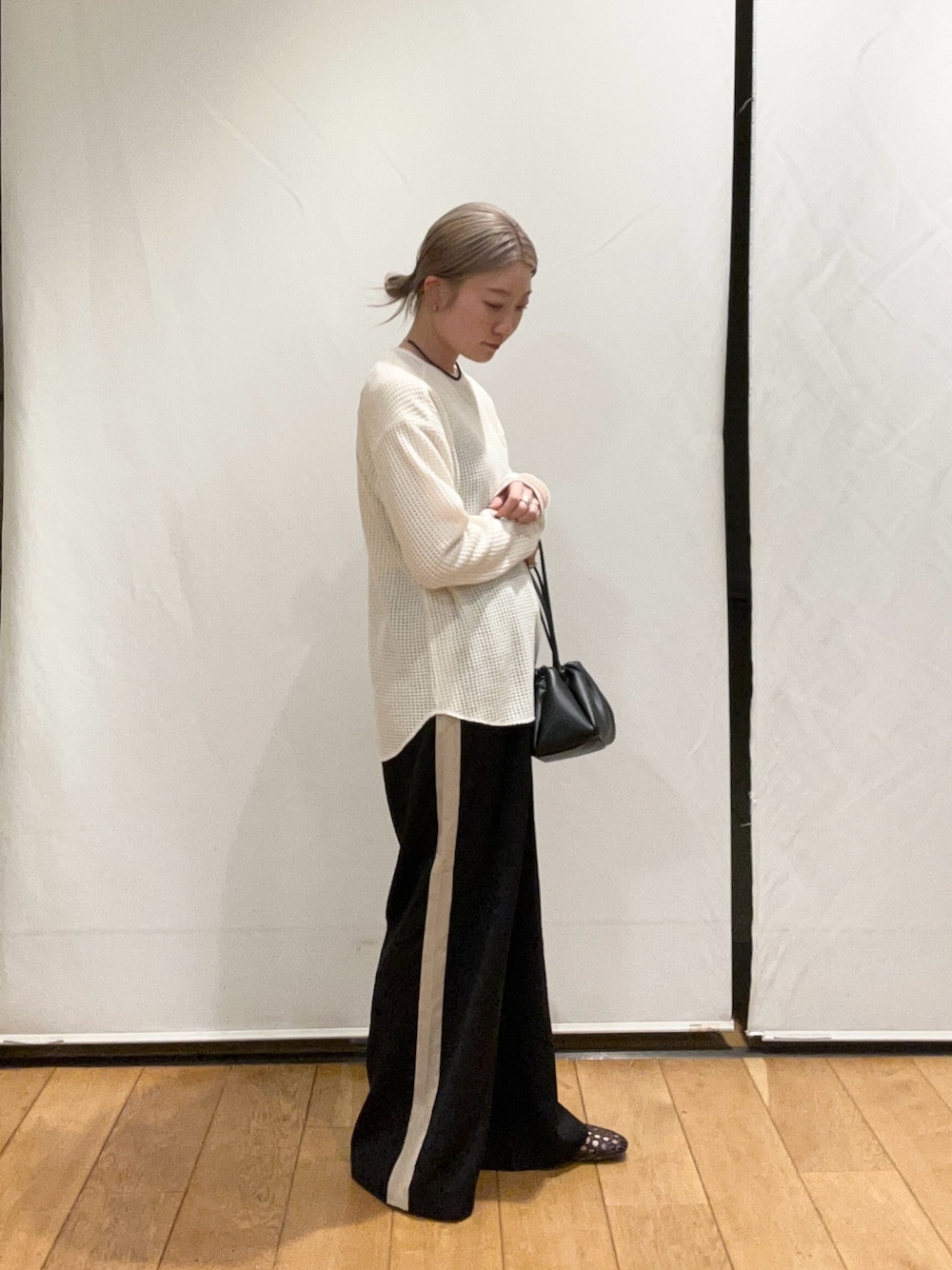 ボトムにはウールライクトラウザーを合わせることで、カジュアルなシャツスタイルを程よく上品にアップデート。全体を淡いトーンでまとめつつ、足元の黒で引き締めるのが今の気分です。
