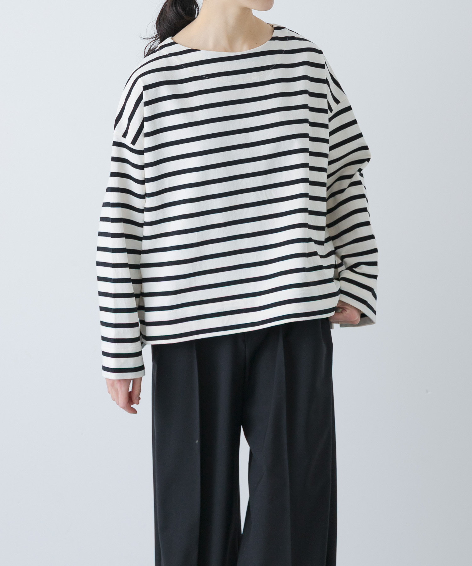 丈にはさりげない前後差があり、シルエットがとてもきれいです✨ 首元を美しく演出するボートネックがポイントです!太めの袖とボートネックがカジュアルな中にこなれたムードを出してくれます♬身幅はたっぷりとしていてリラックスした着心地です!パンツやスカートとの組み合わせはもちろんサロペットのインナーにも重宝します◎
