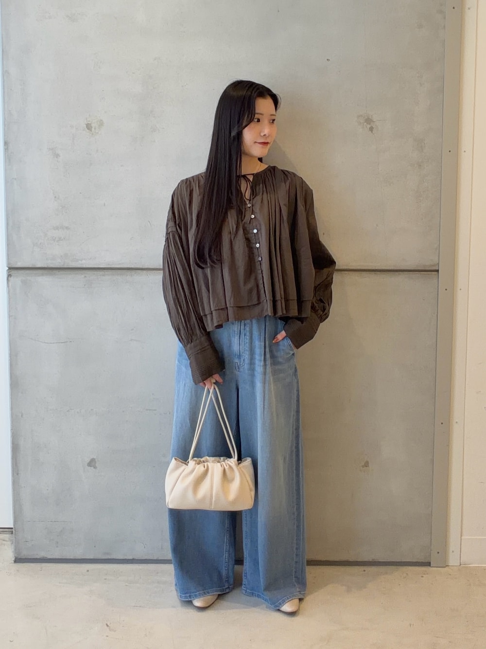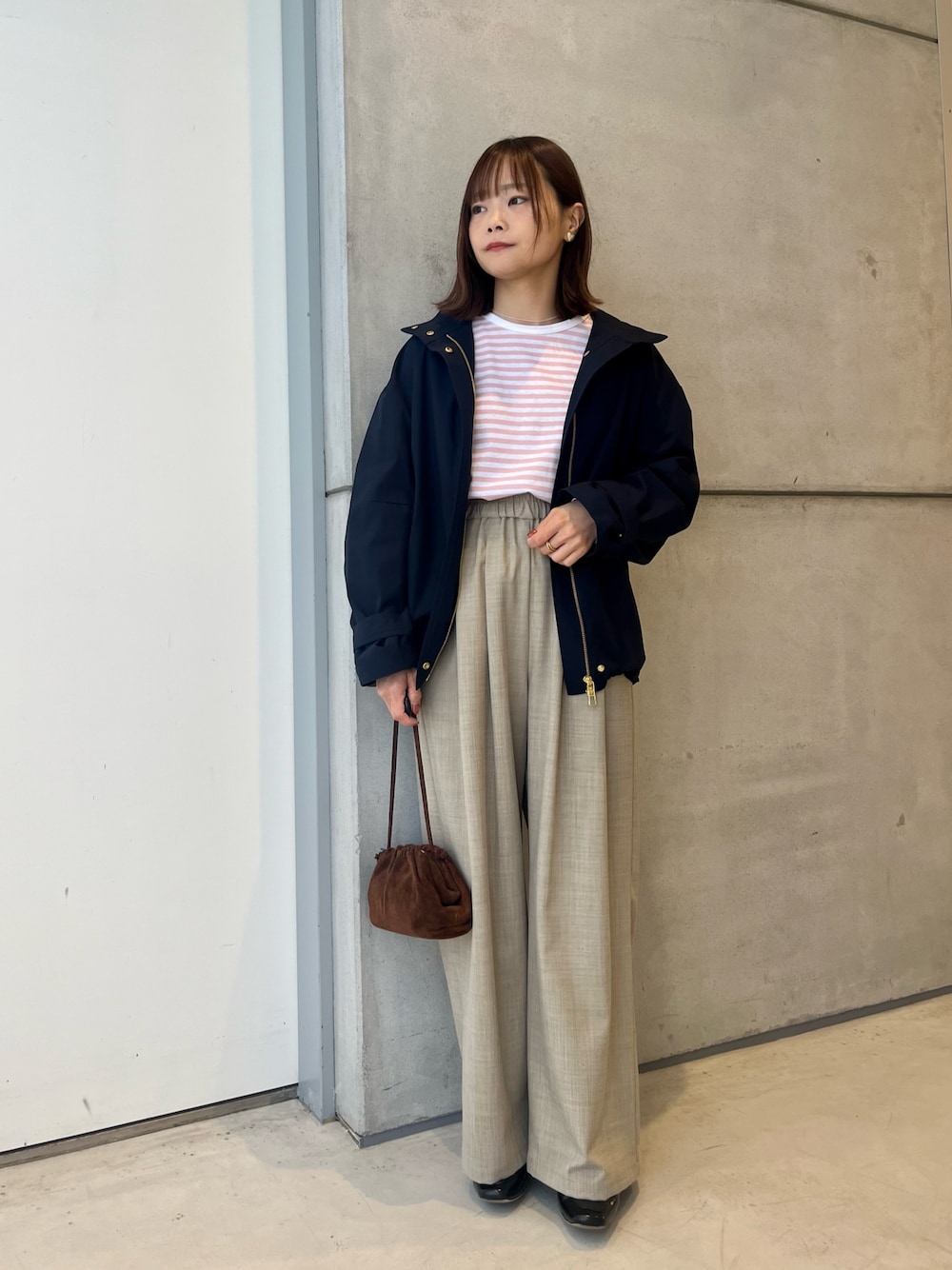ブラウンのパンツと合わせて柔らかい印象に。