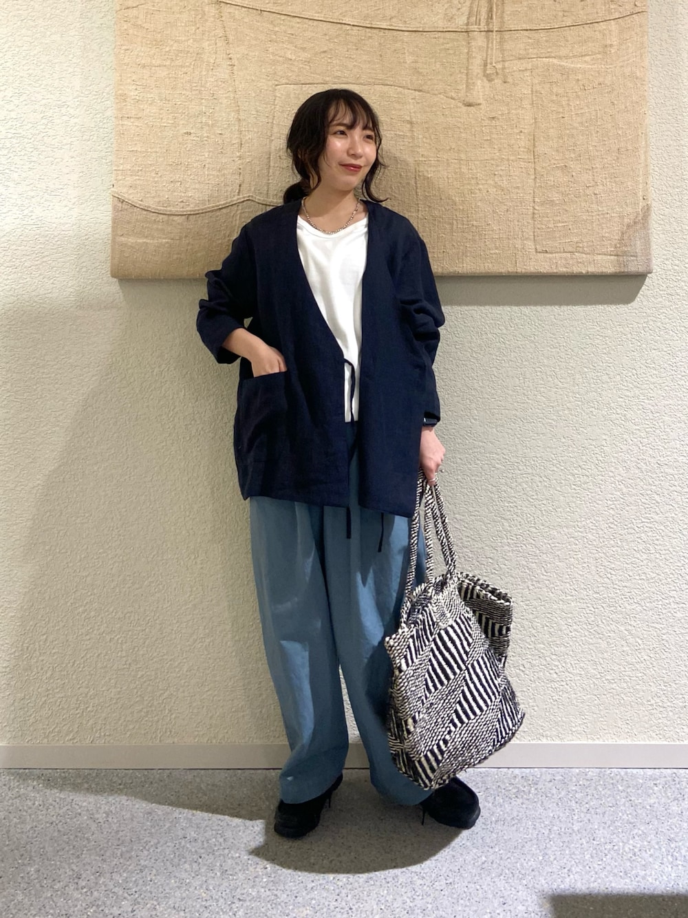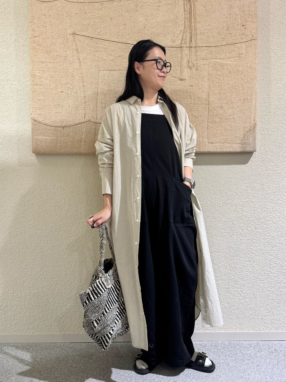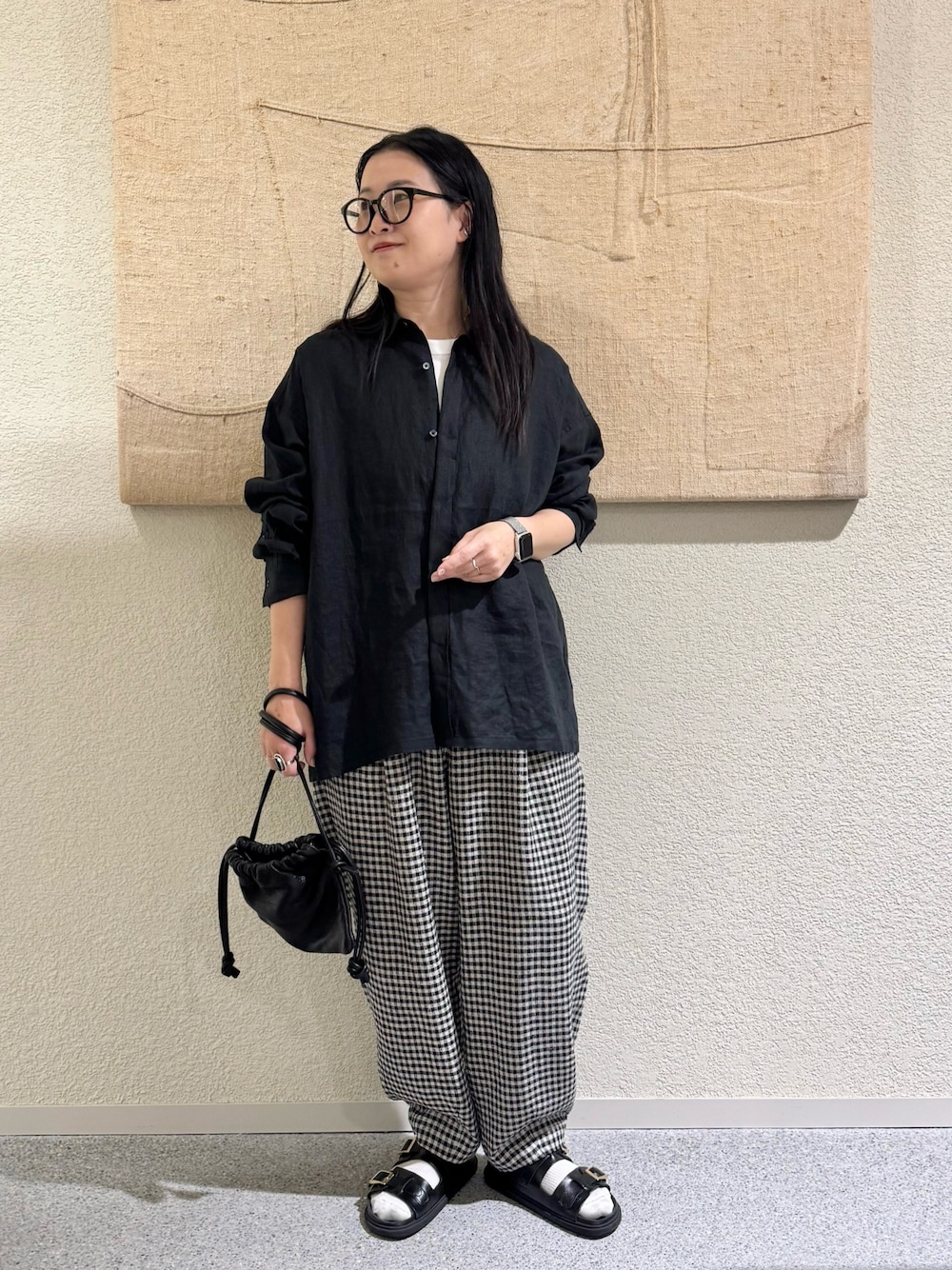 トップスのキュプラオープンカラーシャツはバランスの取りやすい丈感で、ワイドパンツにも◎