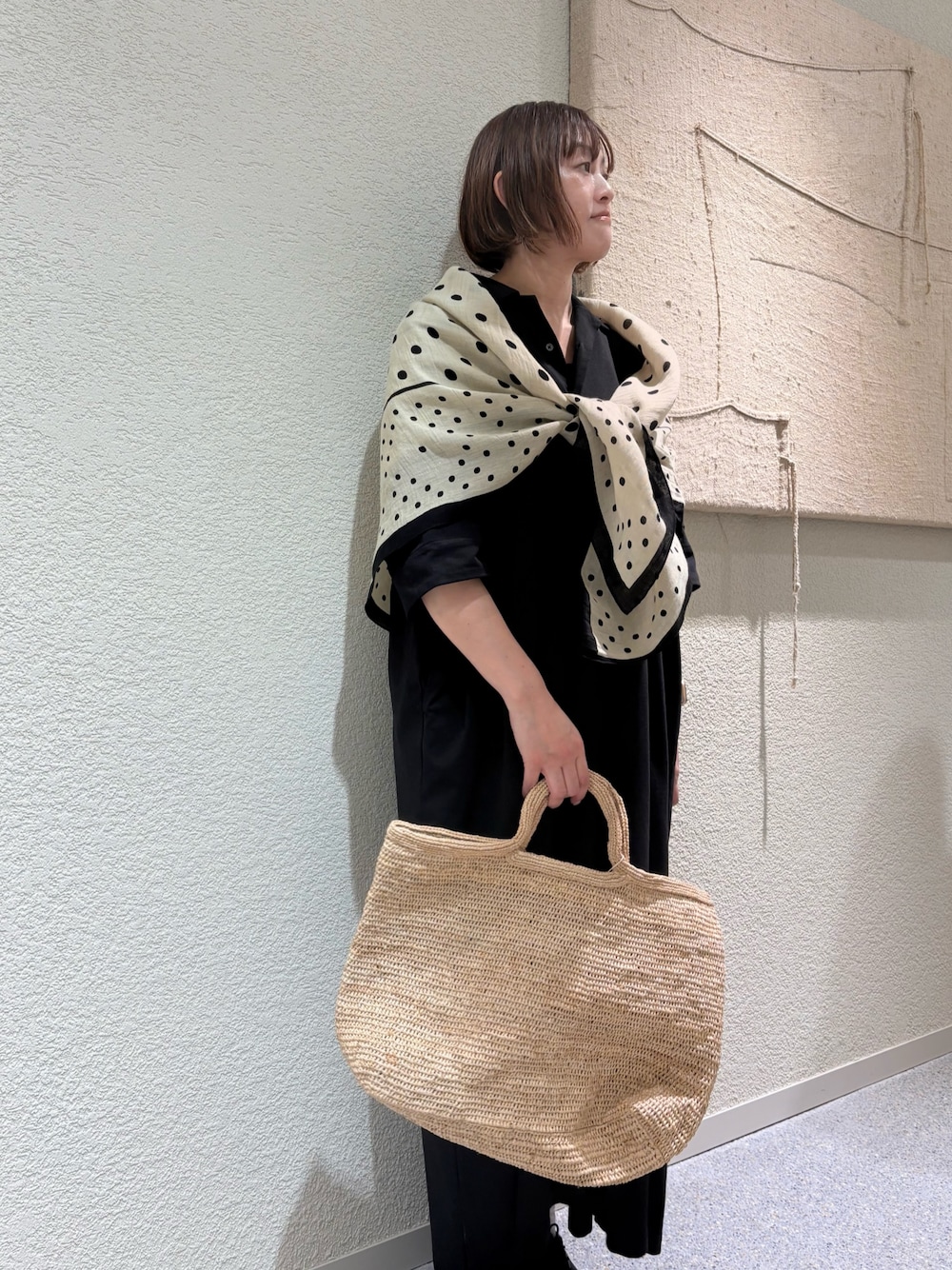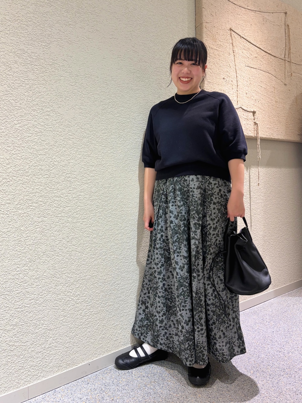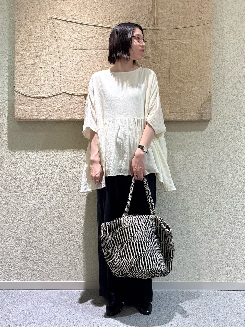 トップスのキュプラオープンカラーシャツはバランスの取りやすい丈感で、ワイドパンツにも◎