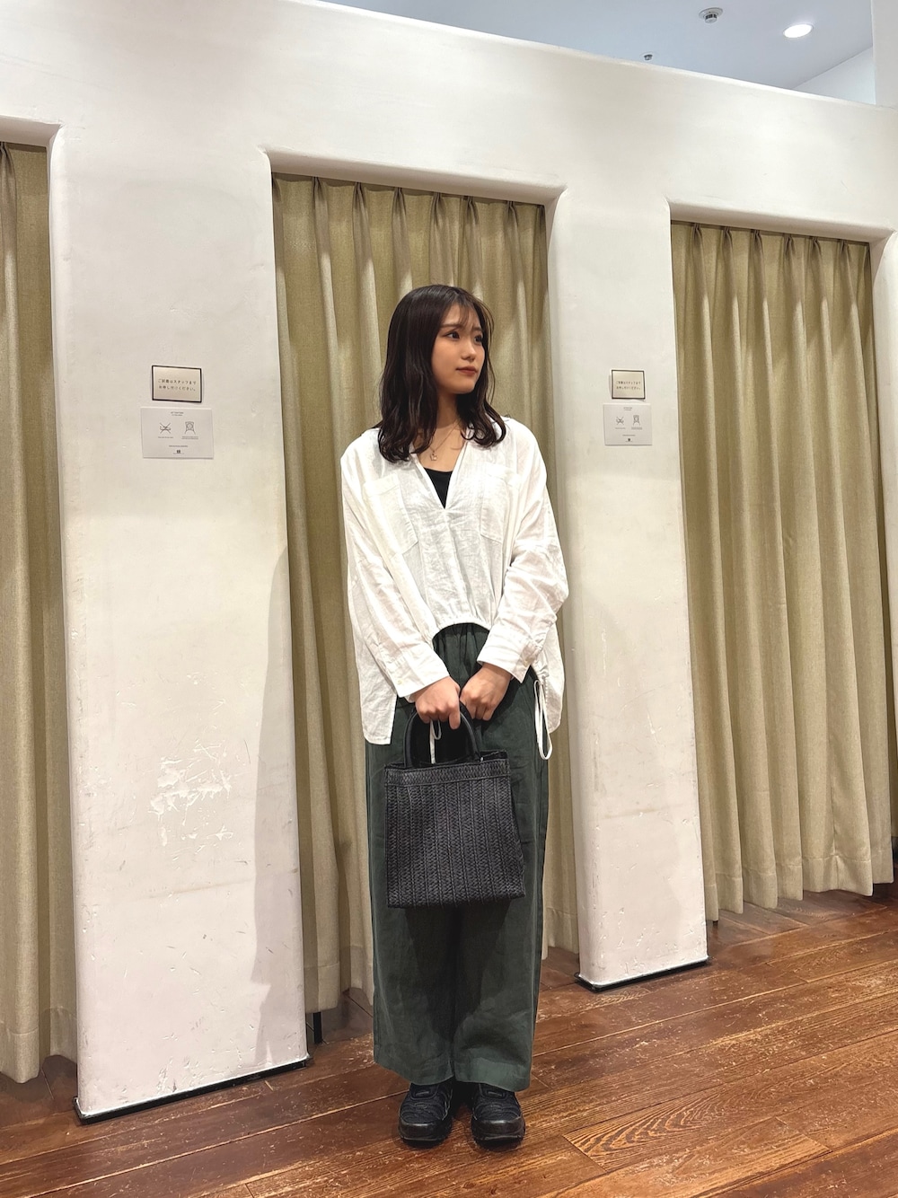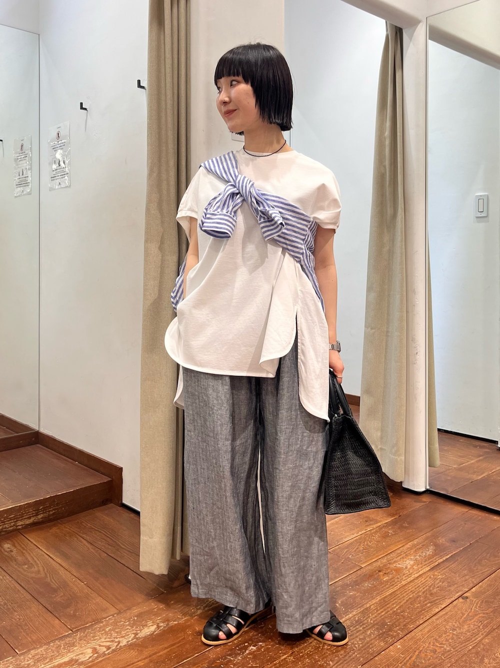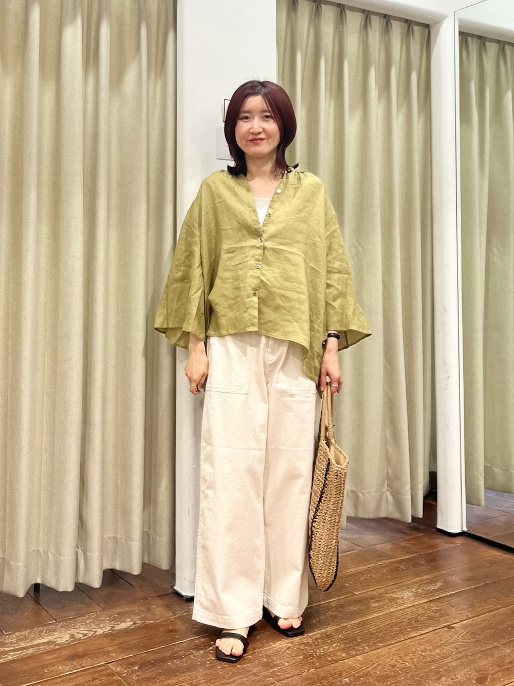 コーデのワンポイントにもなるパンツは派手すぎず、リネン素材なので夏でも履きやすいです。