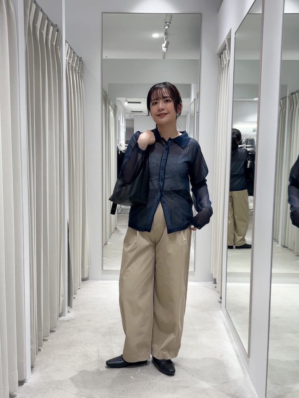シアーのトップスは程よい透け感があり、サイズ感はコンパクトなので、ベストやキャミと合わせるととっても可愛いです!