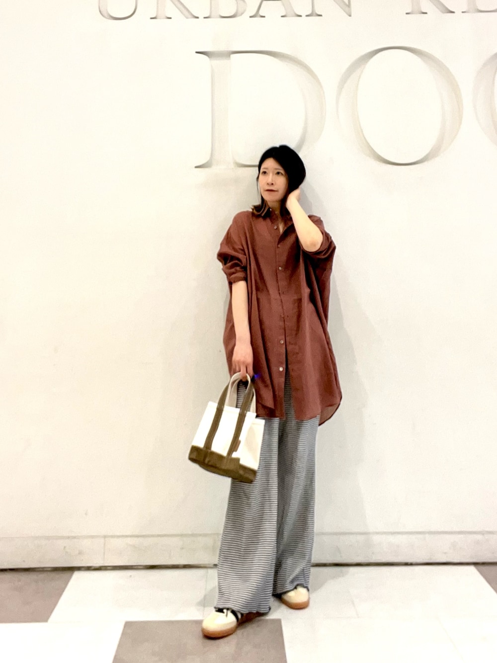 トップスはさらっとした肌触りが心地良いドルマンスリーブのシャツ。ボタンを閉めてブラウスとして着るのもオススメです◎カジュアルからきれいめまで対応の万能ブラウスです🫶🏻