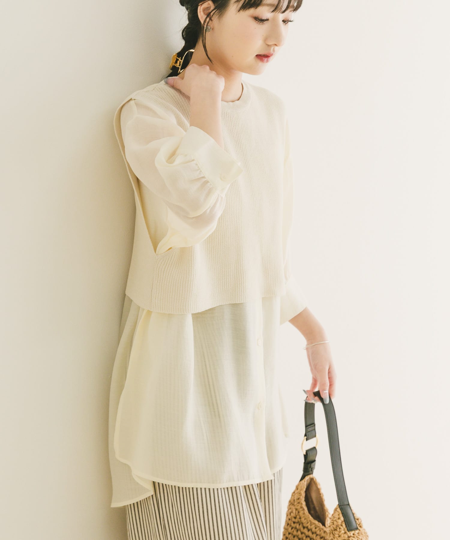 トップスはドッキングシャツでシルエットとデザインが可愛いアイテムになっています!丈の短めのニットベストが付いていて、袖の丈も長すぎす短すぎないので着ていただきやすいかなと思います!