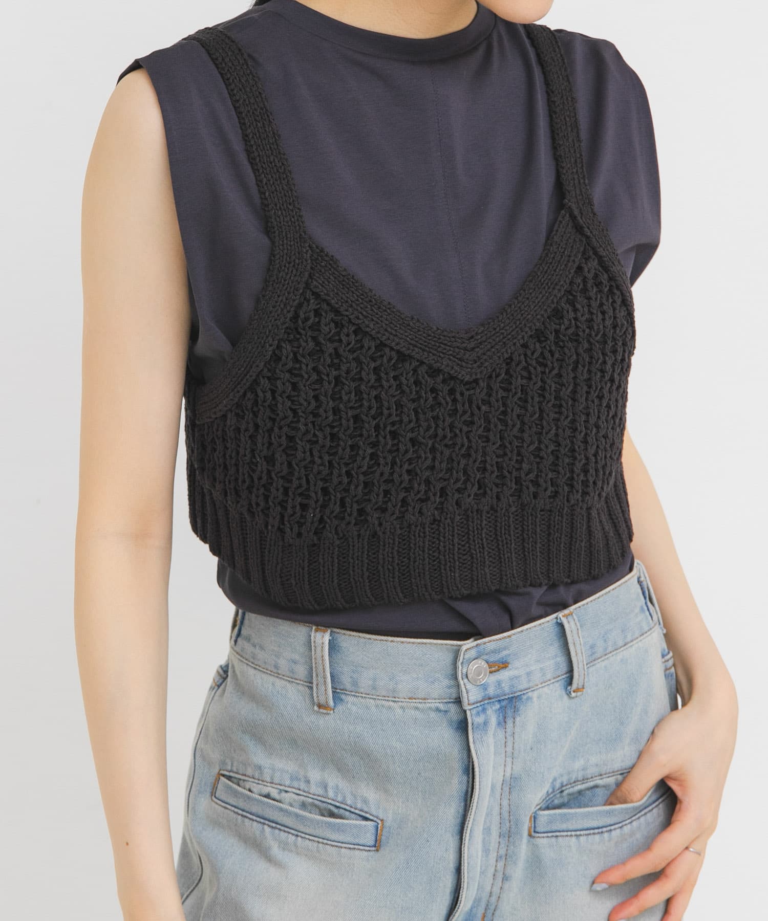 前後大きめのデザインが入っており1枚で決まります!◎インナーとしての着用も存在感がありポイントになります♪ビスチェを重ねてカジュアル味を抑えております◎