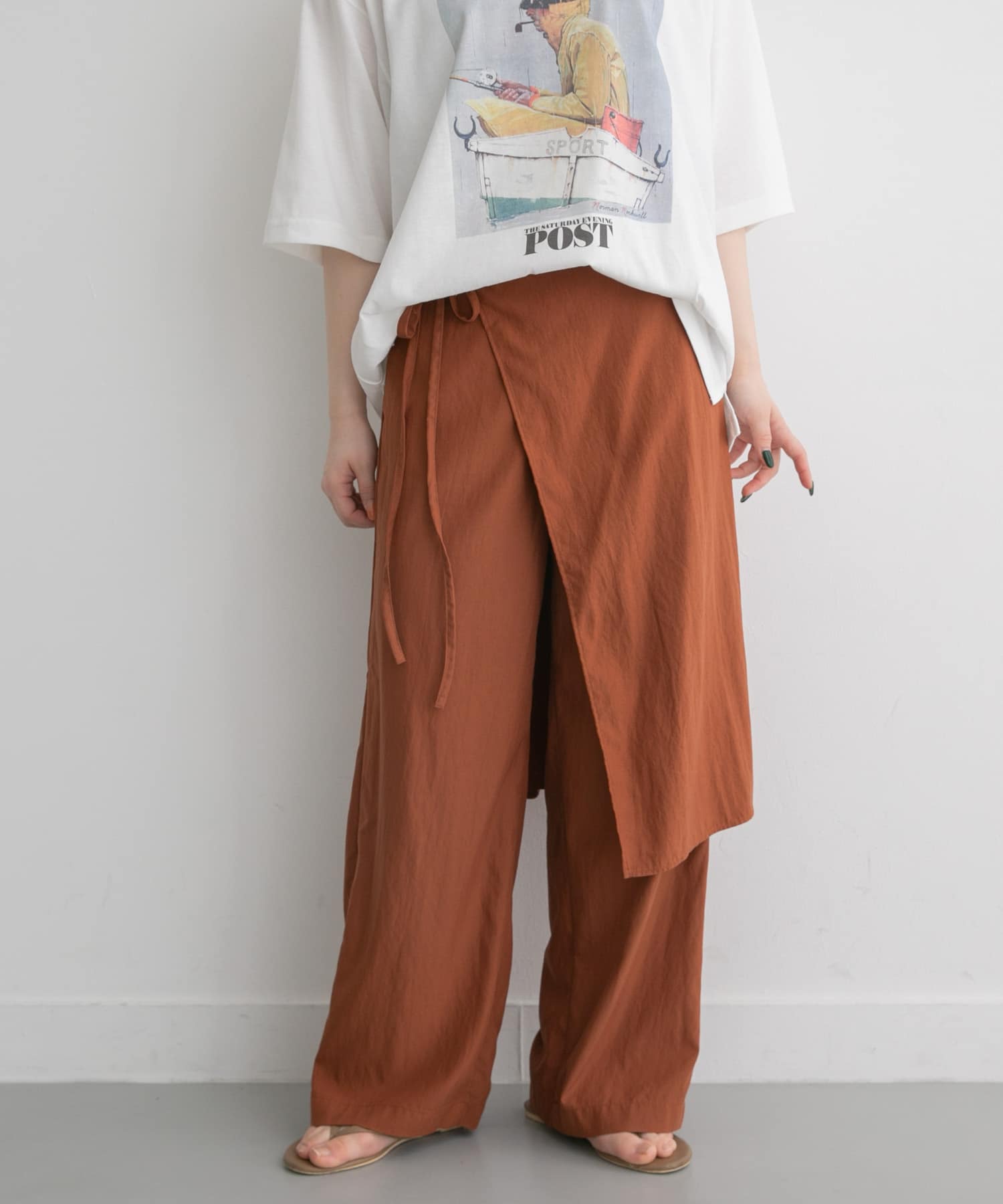 巻きスカート付きのパンツを着用したコーデです。