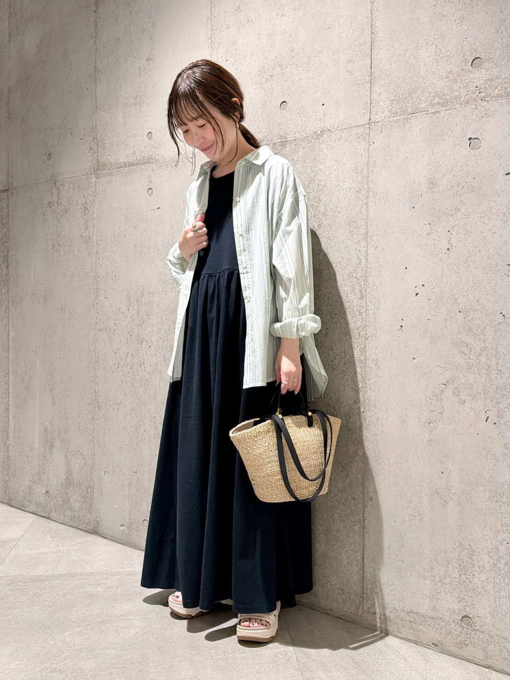 ストライプ柄のバッグと、ピンクのカーディガンを腰に巻いてアクセントに。