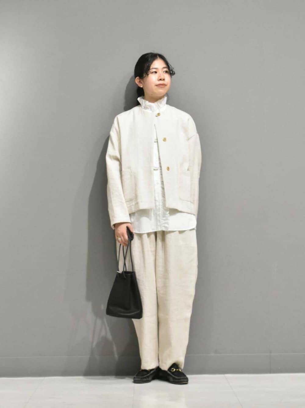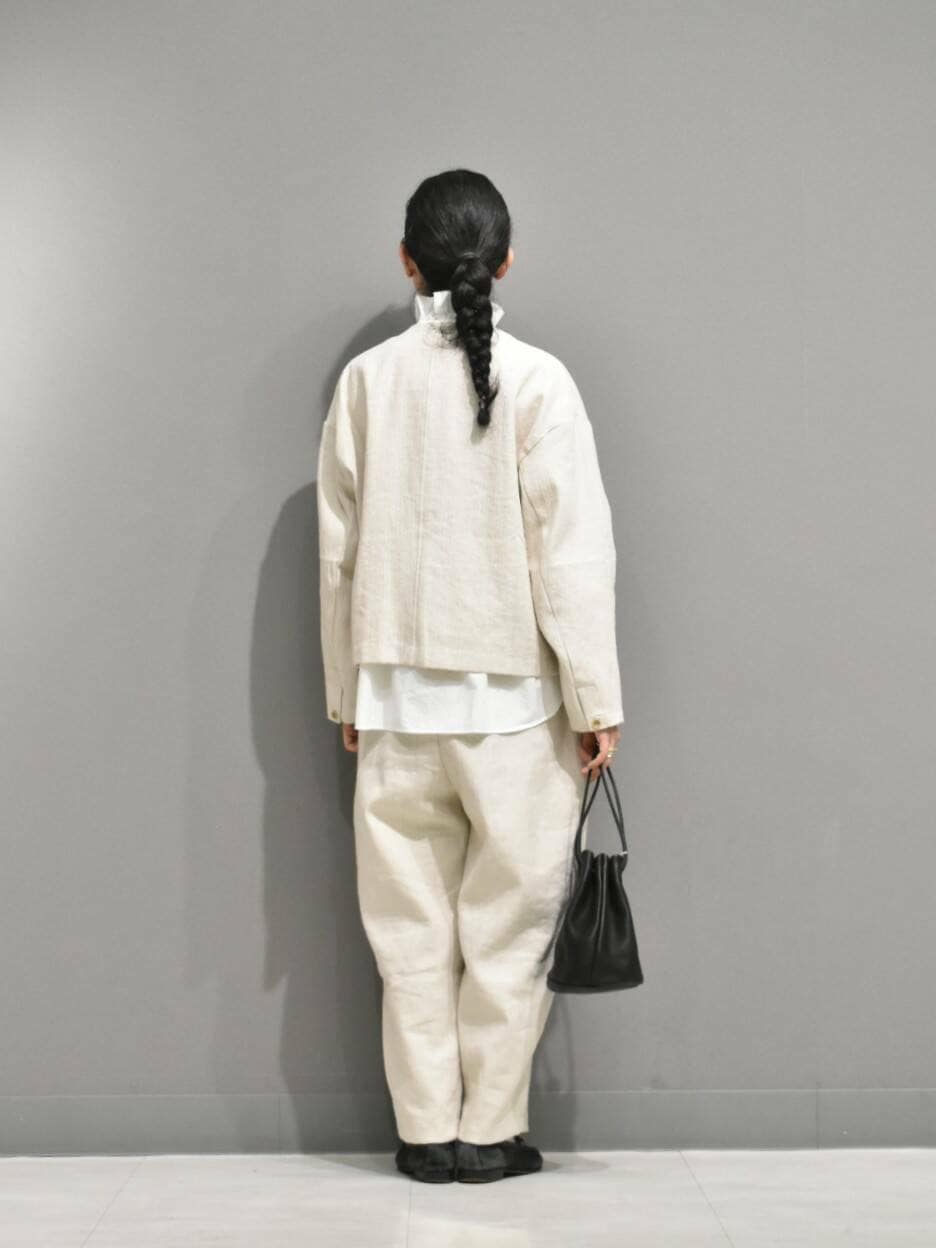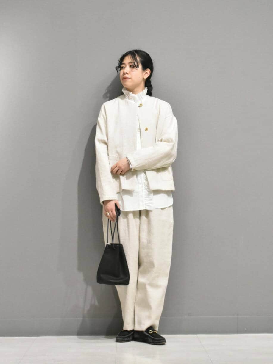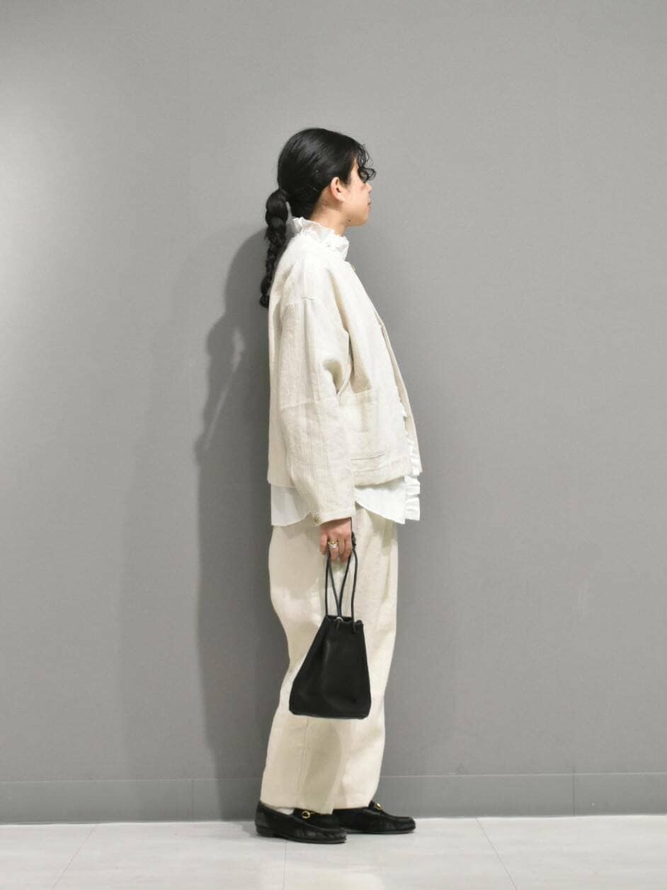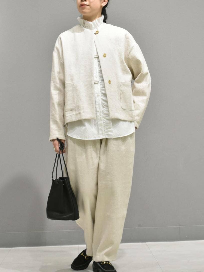 セットアップはリネンコットン素材で、凹凸感のある風合いが大人見え◎