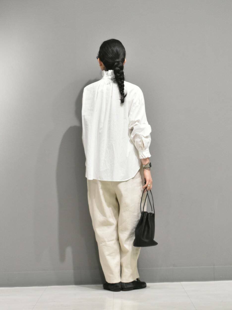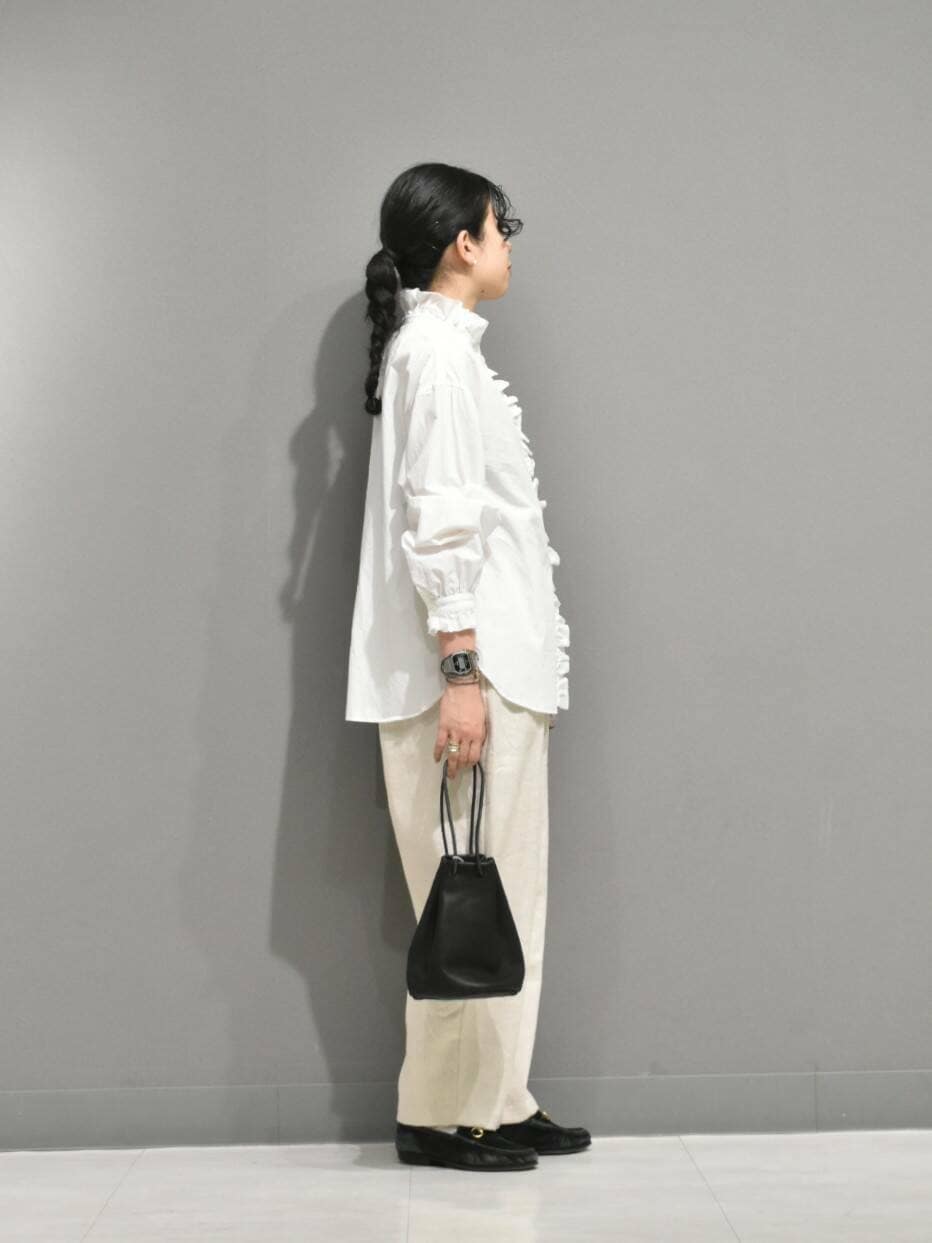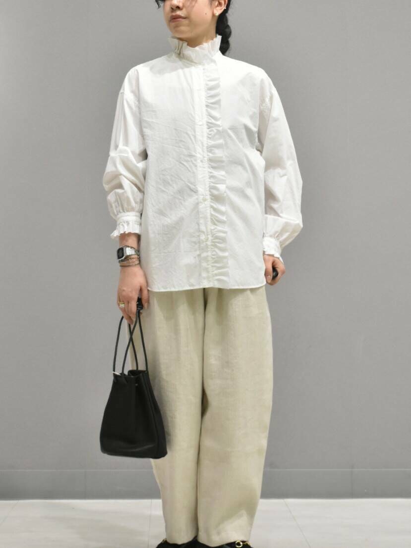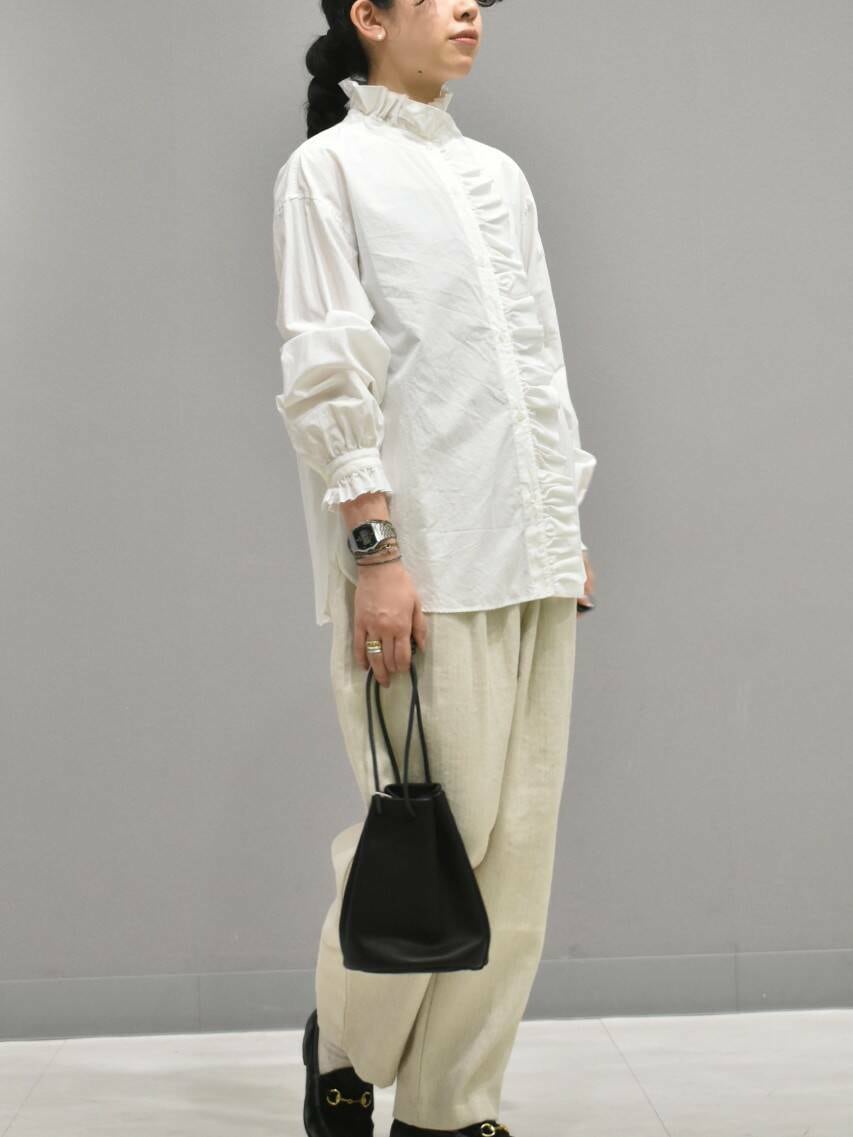 シボ感のある綿素材のフリルシャツは、切りっぱなしなので落ち着いた印象です。