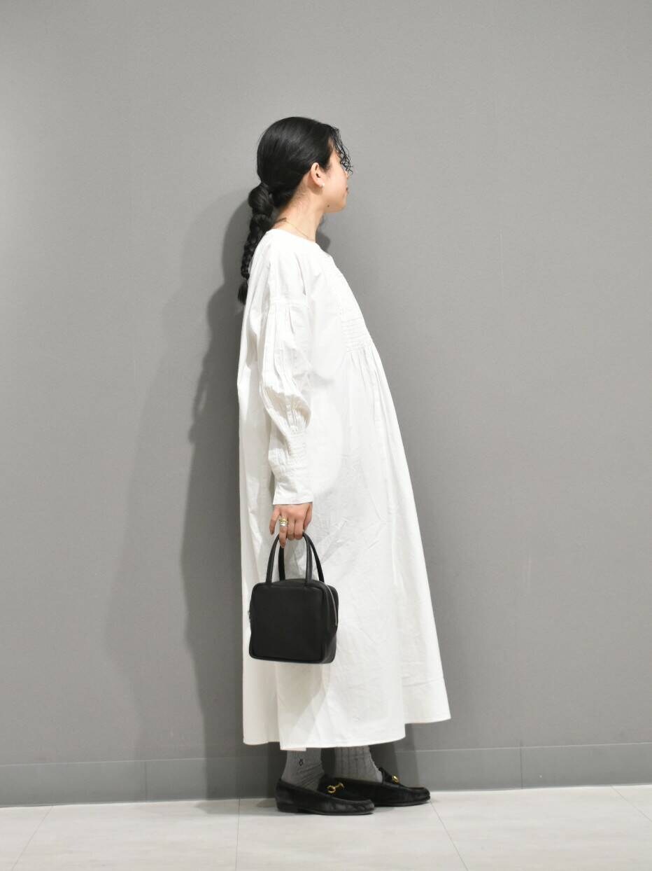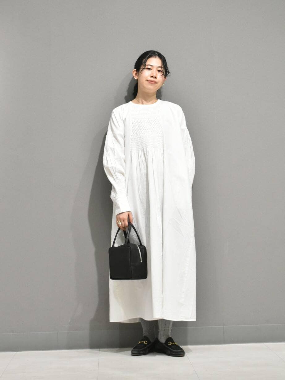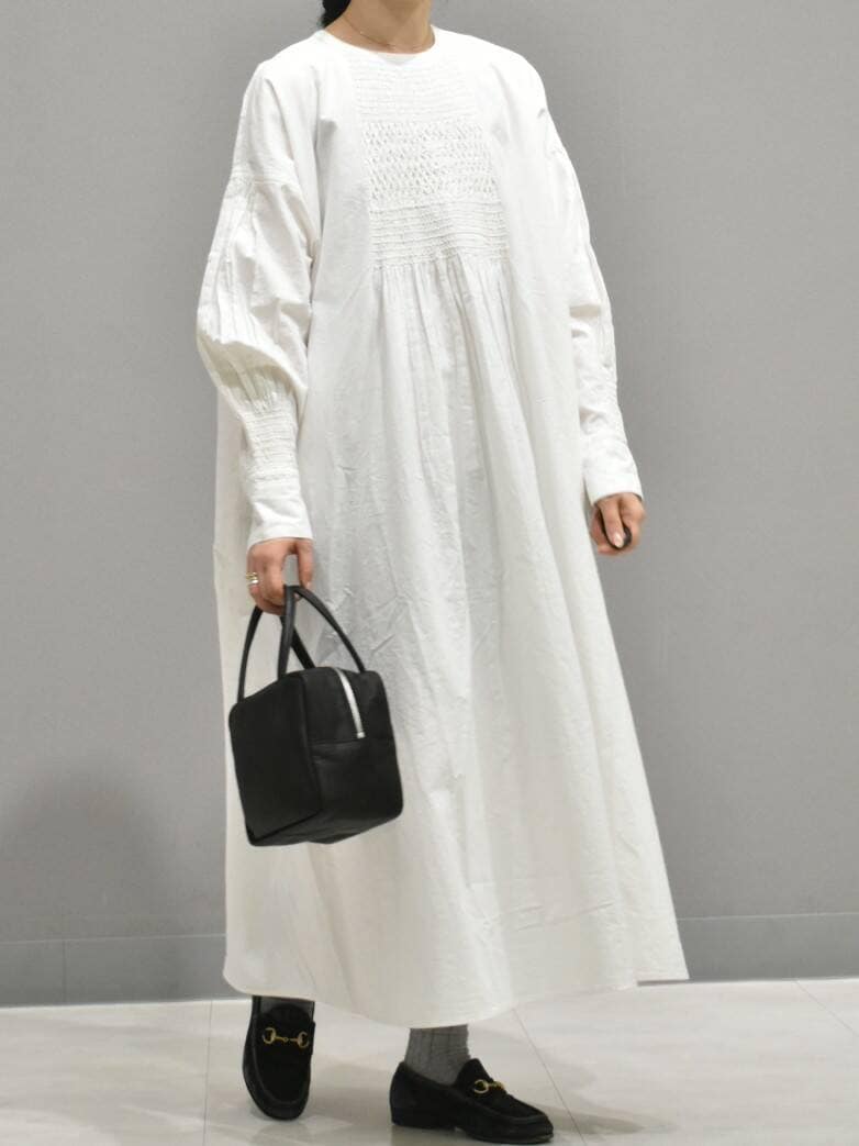 手作業でのスモッキングが目を引く、大人可愛いワンピースは1枚で様になる万能アイテム。
