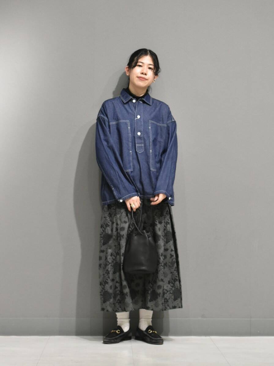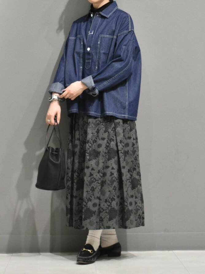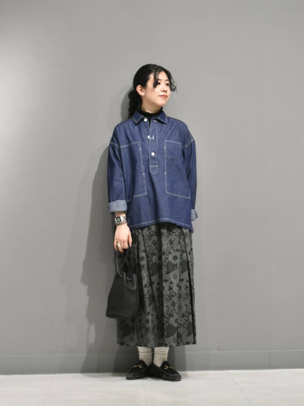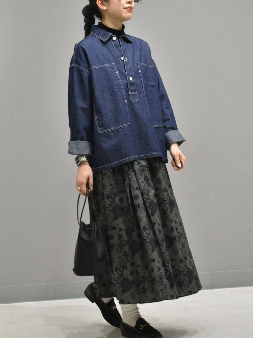 デニムプルオーバーはポケットのステッチデザインが印象的で、シンプルながらも様になる一着。