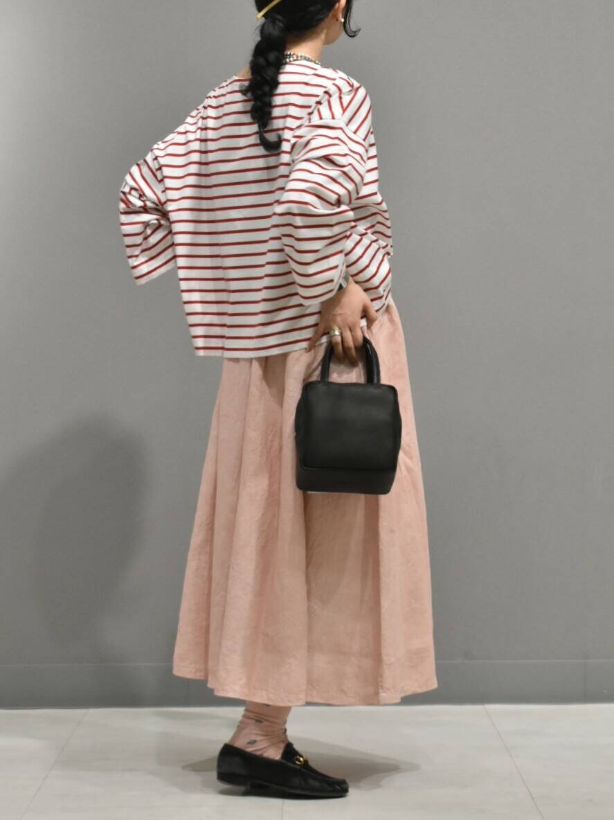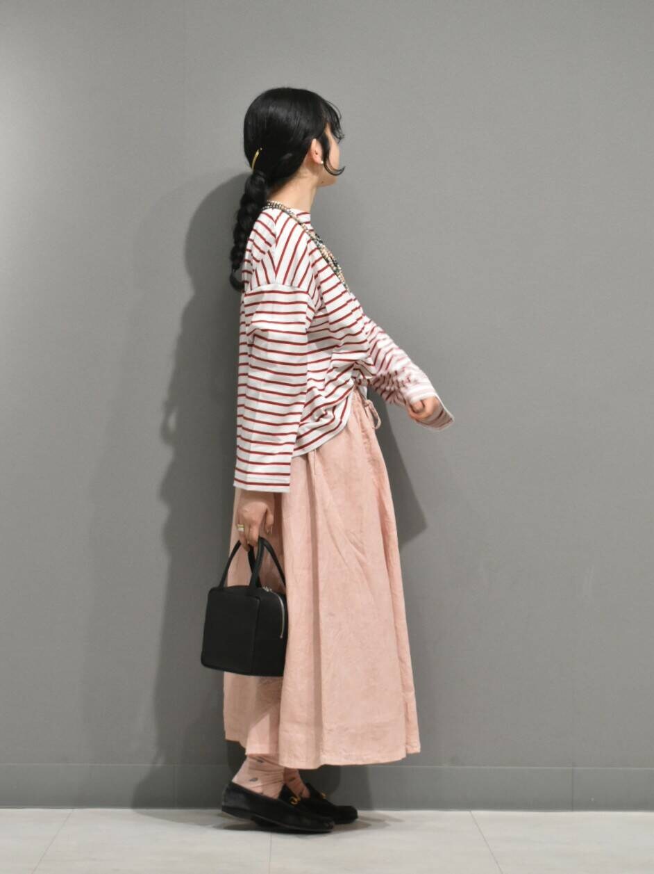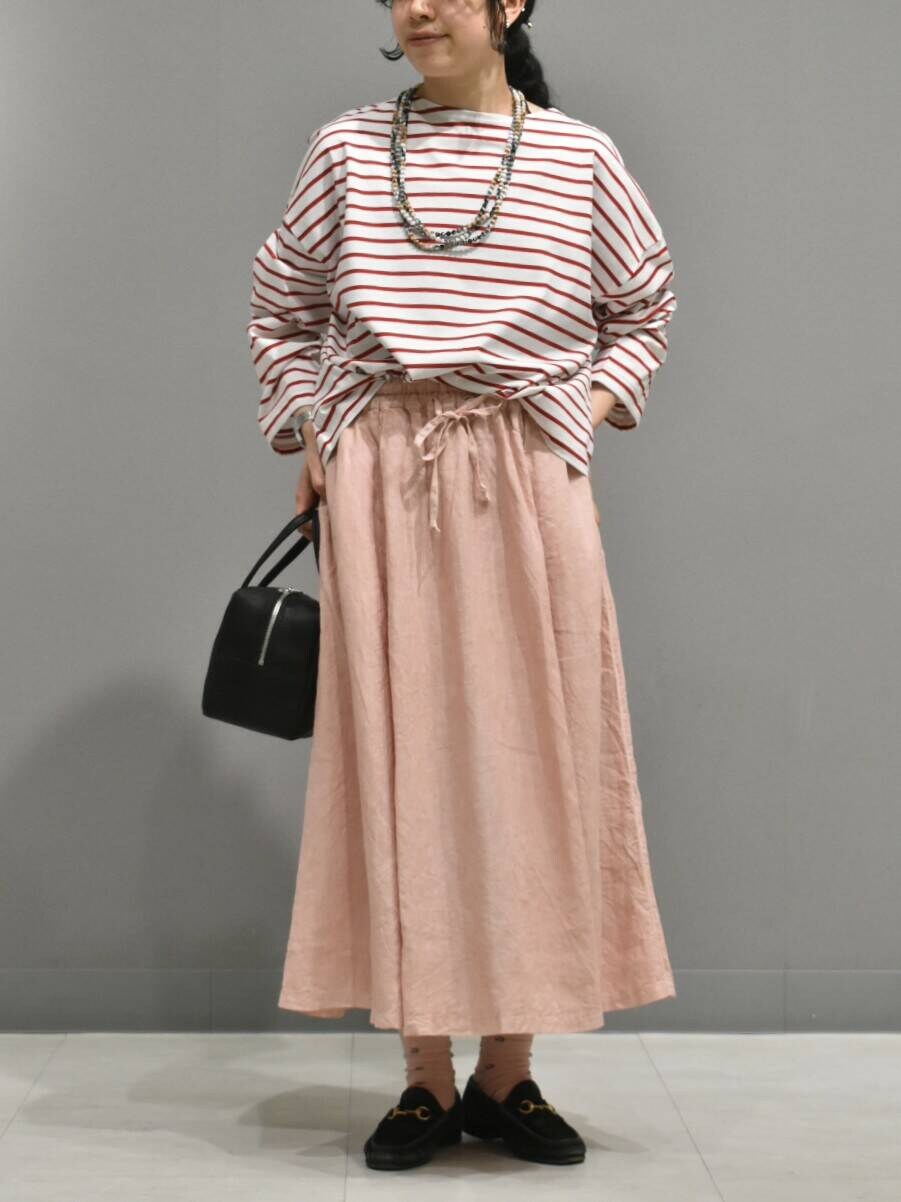 合わせた〈MITTAN〉のスカートはベンガラ染めのほんのりと明るいピンクがなんとも惹かれるアイテム。