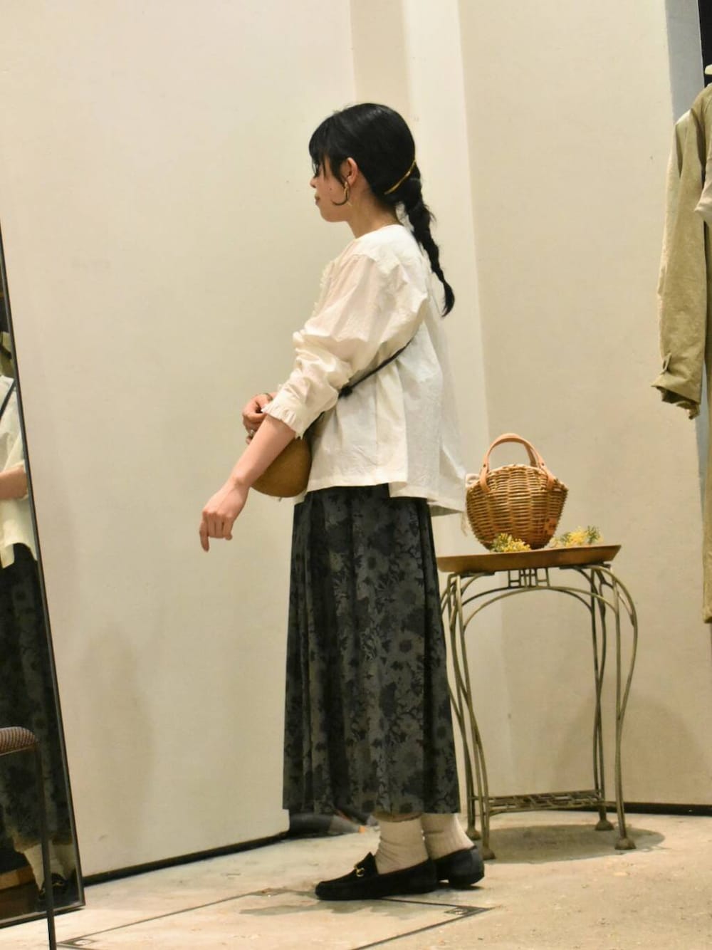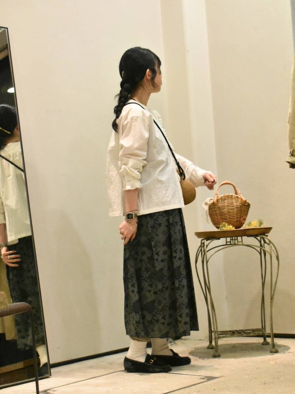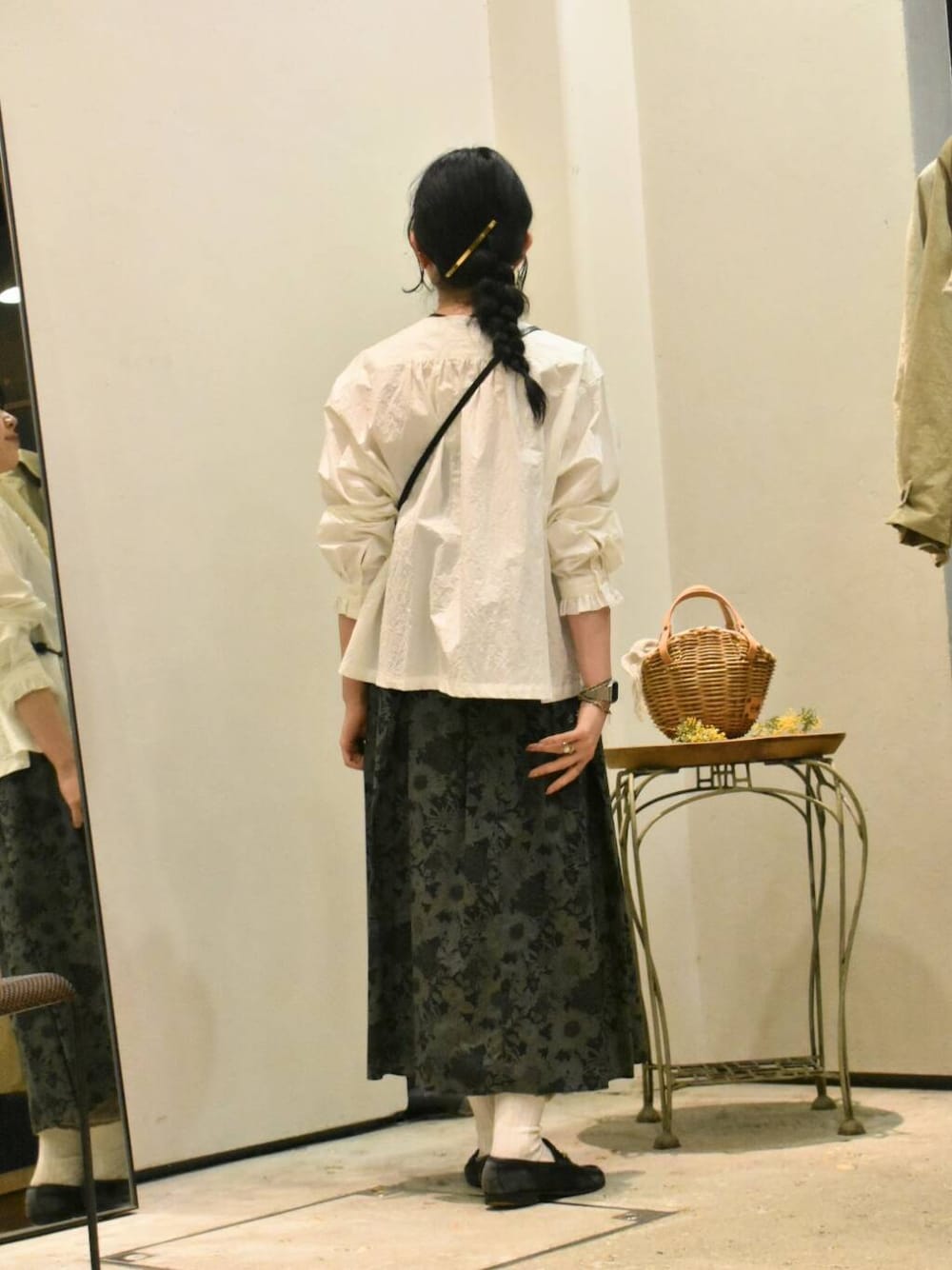 ウエストはギャザーだけでなくタックも入っているので、フレアが広がりすぎず落ち着いた印象に。