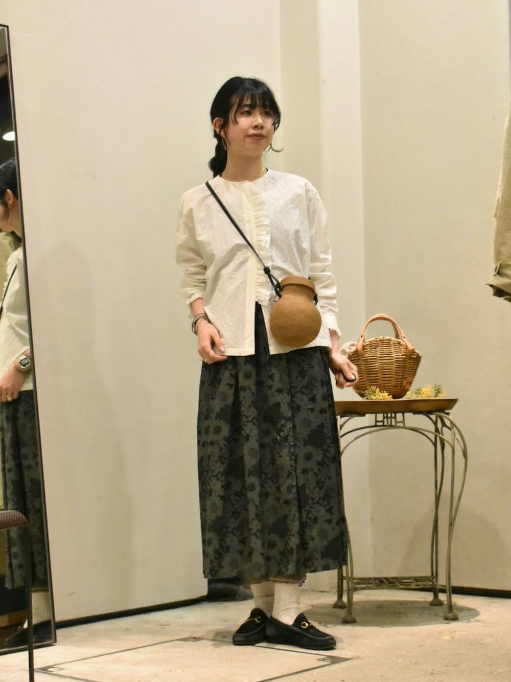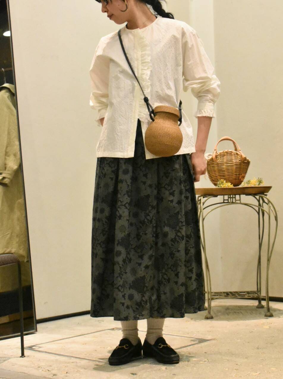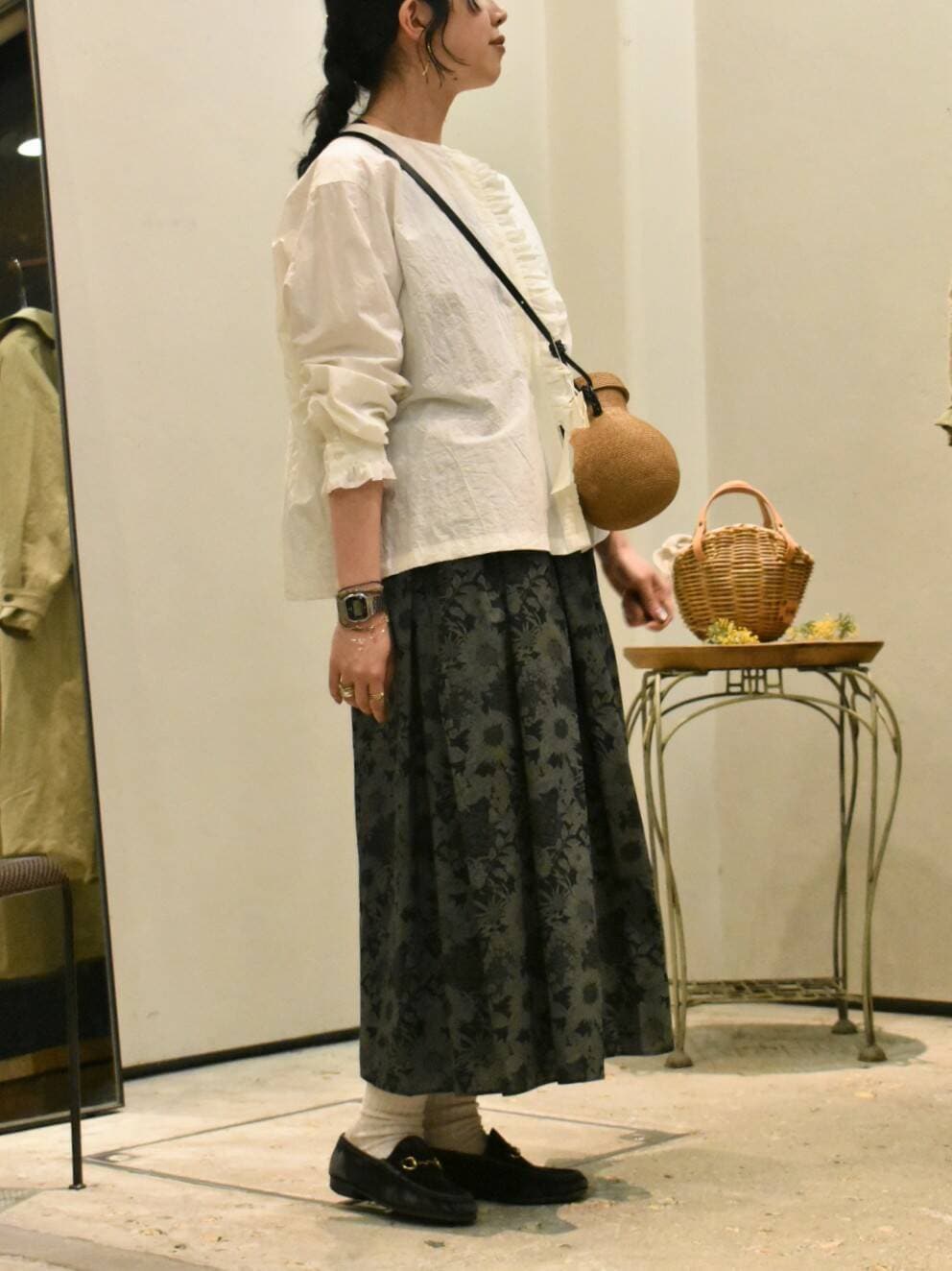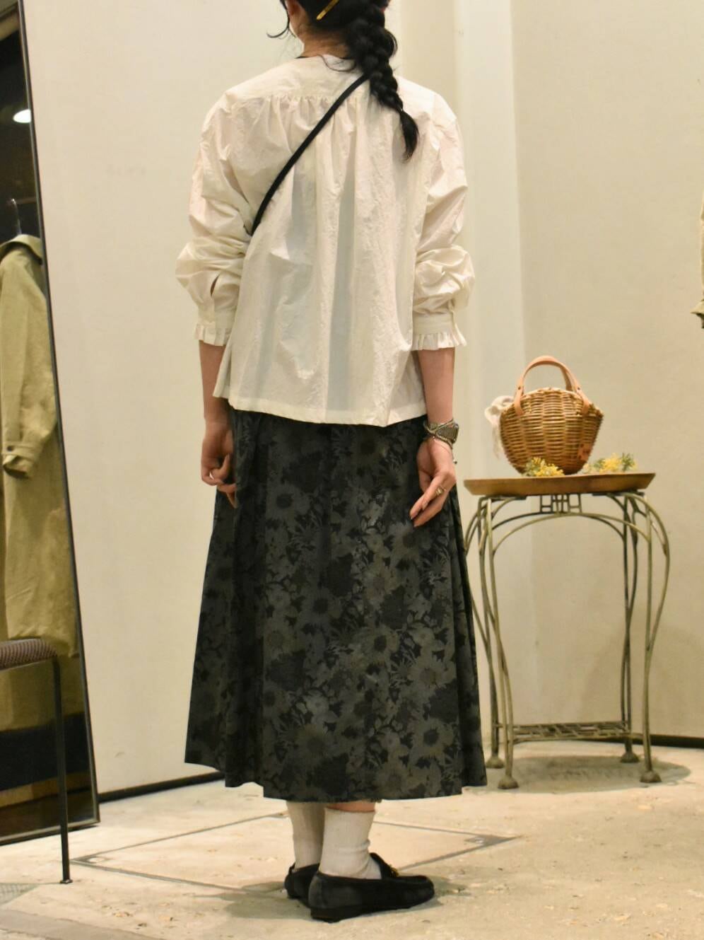 ウエストはギャザーだけでなくタックも入っているので、フレアが広がりすぎず落ち着いた印象に。