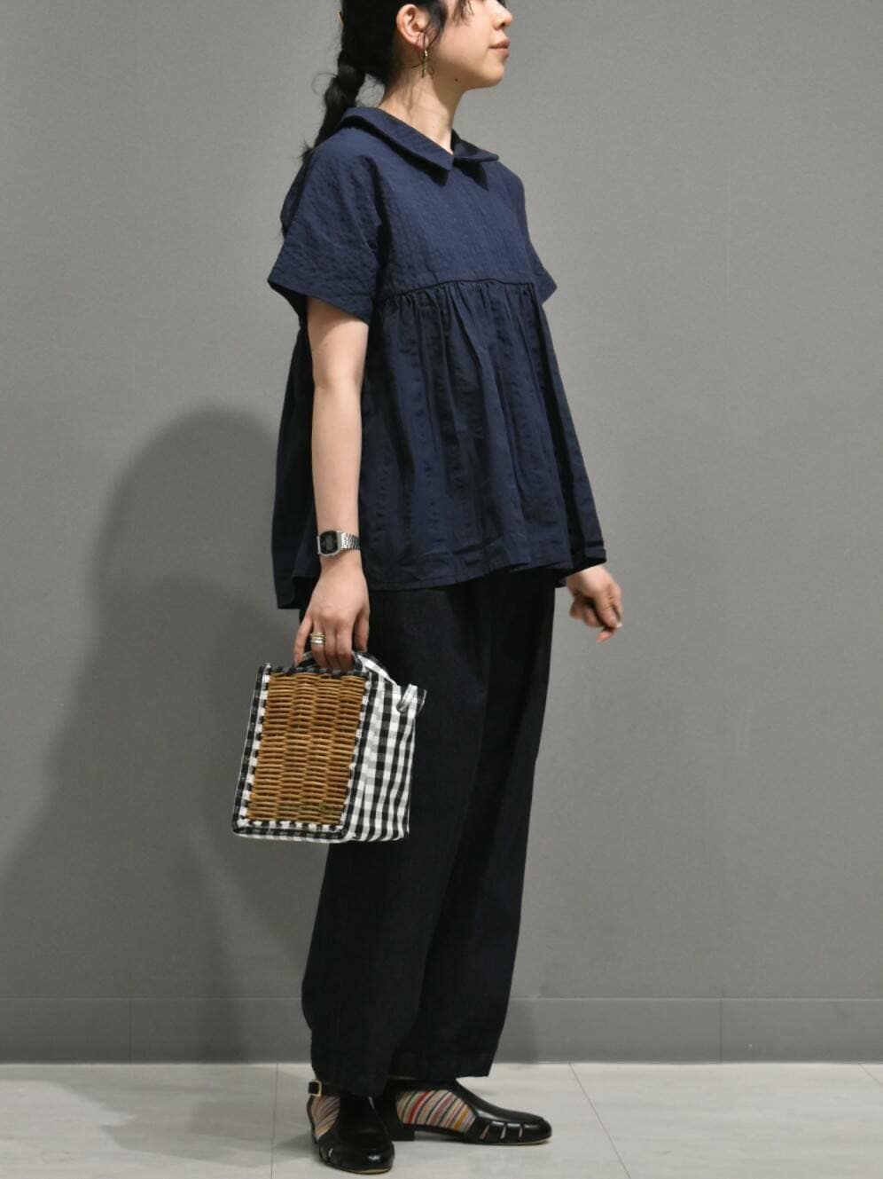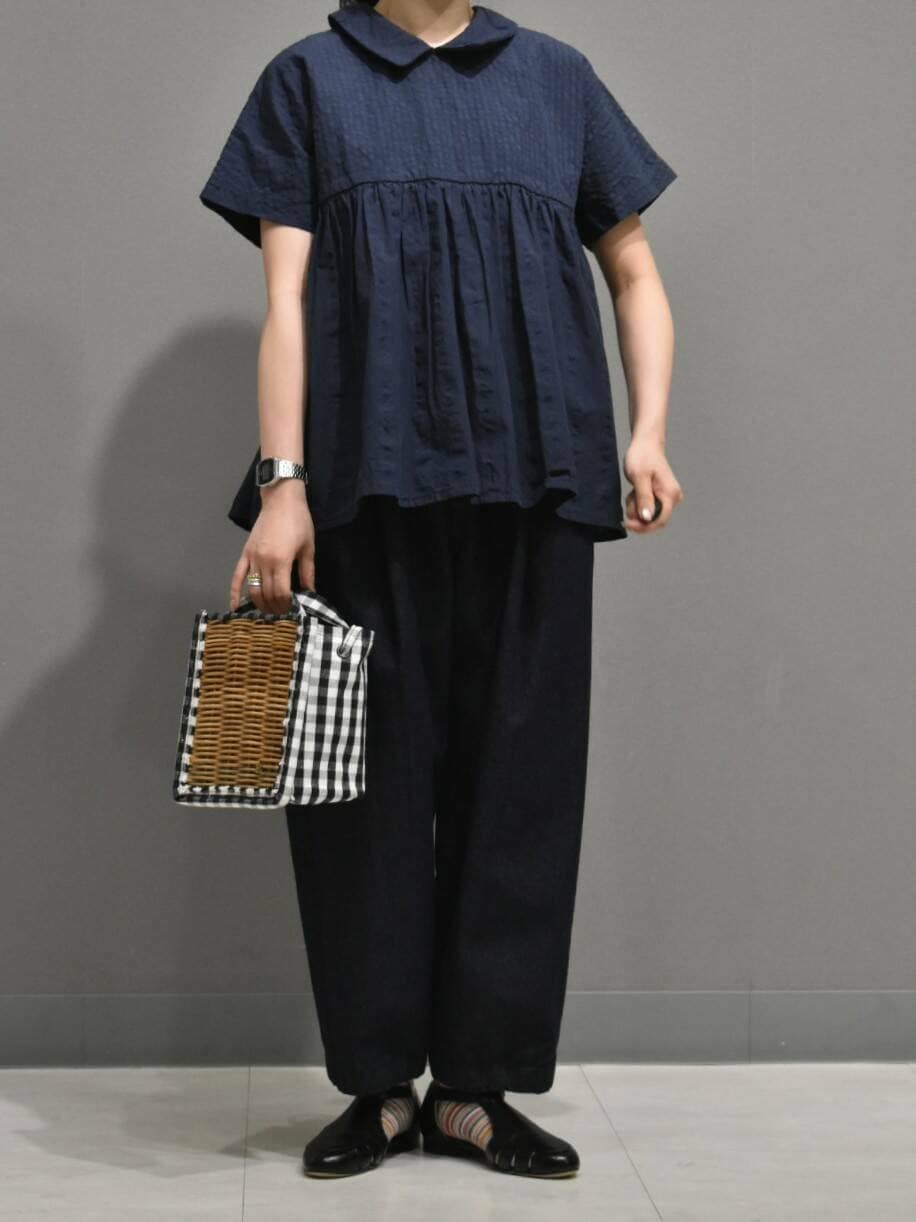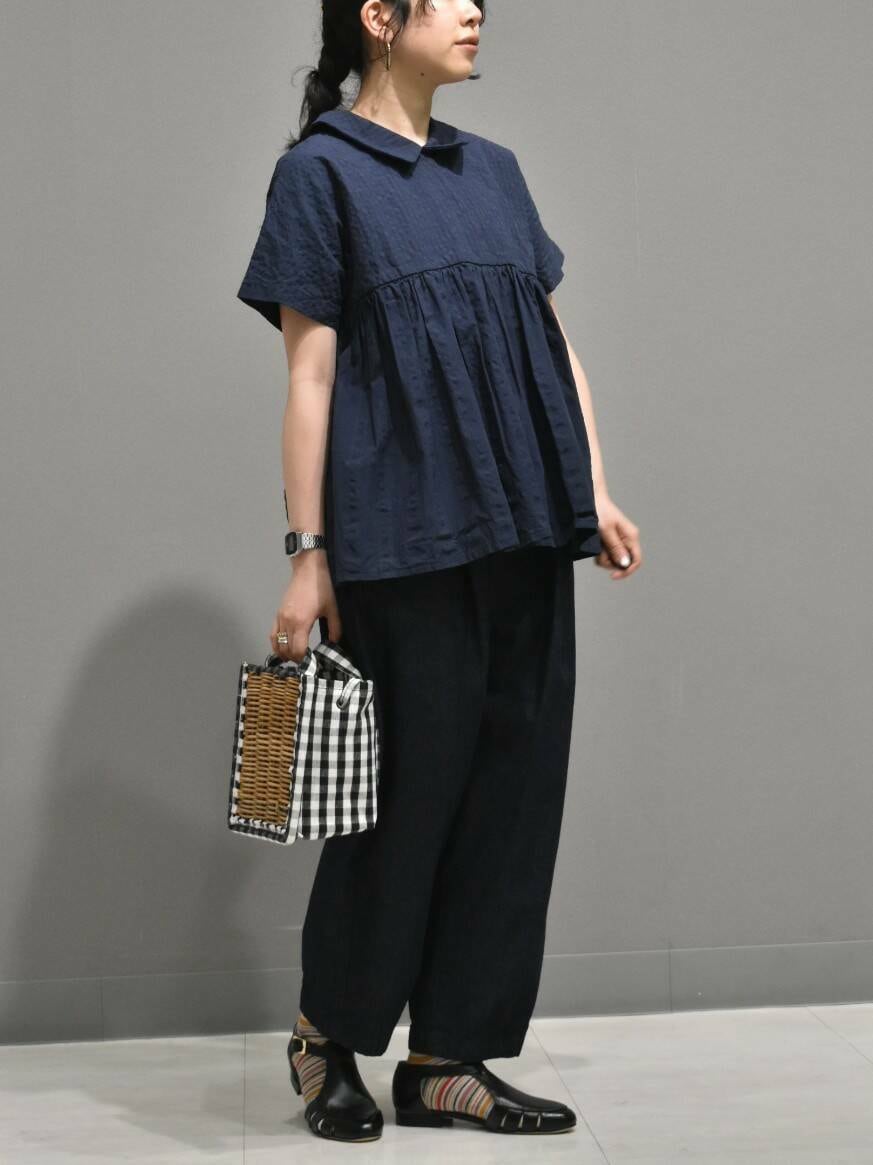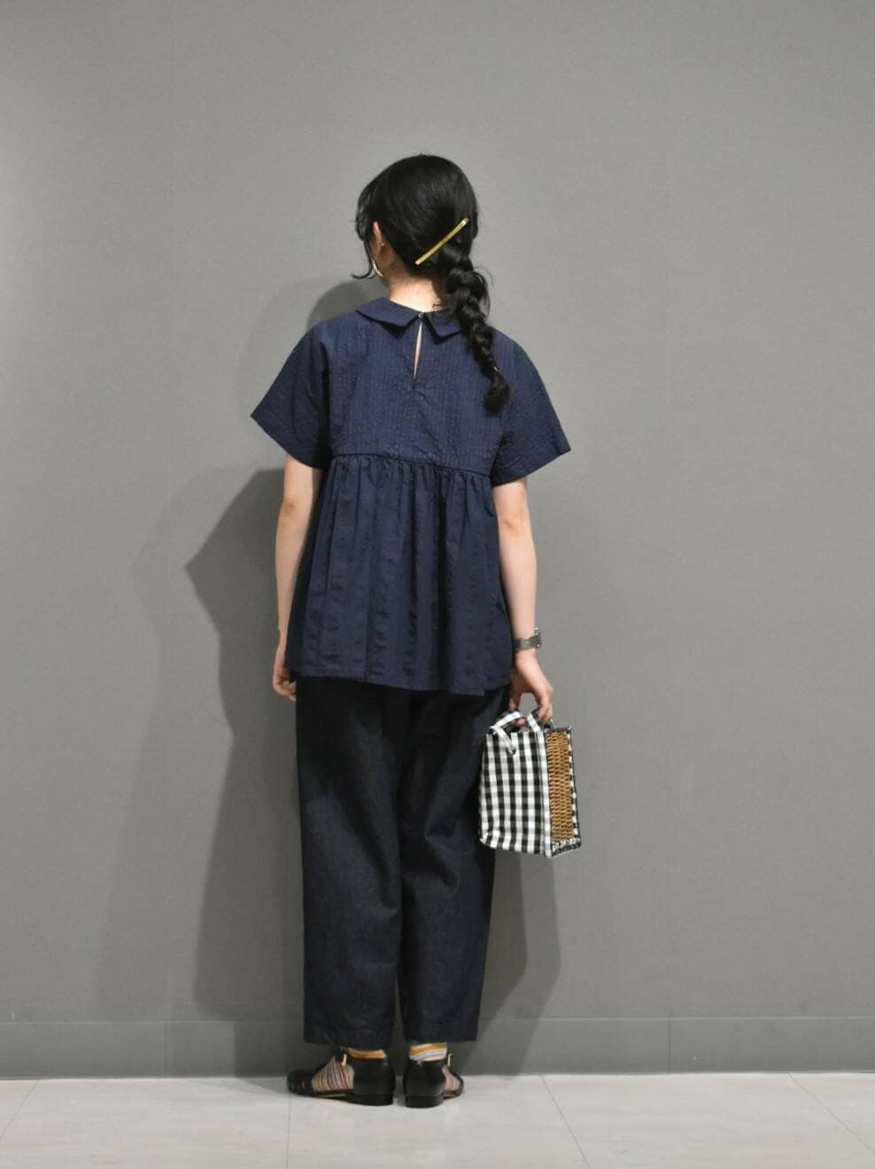 フェミニンなラウンドカラーとウエストギャザーデザインなのに、どこかマニッシュなサッカー地に惹かれます。