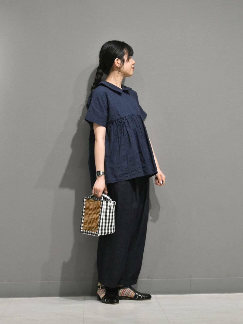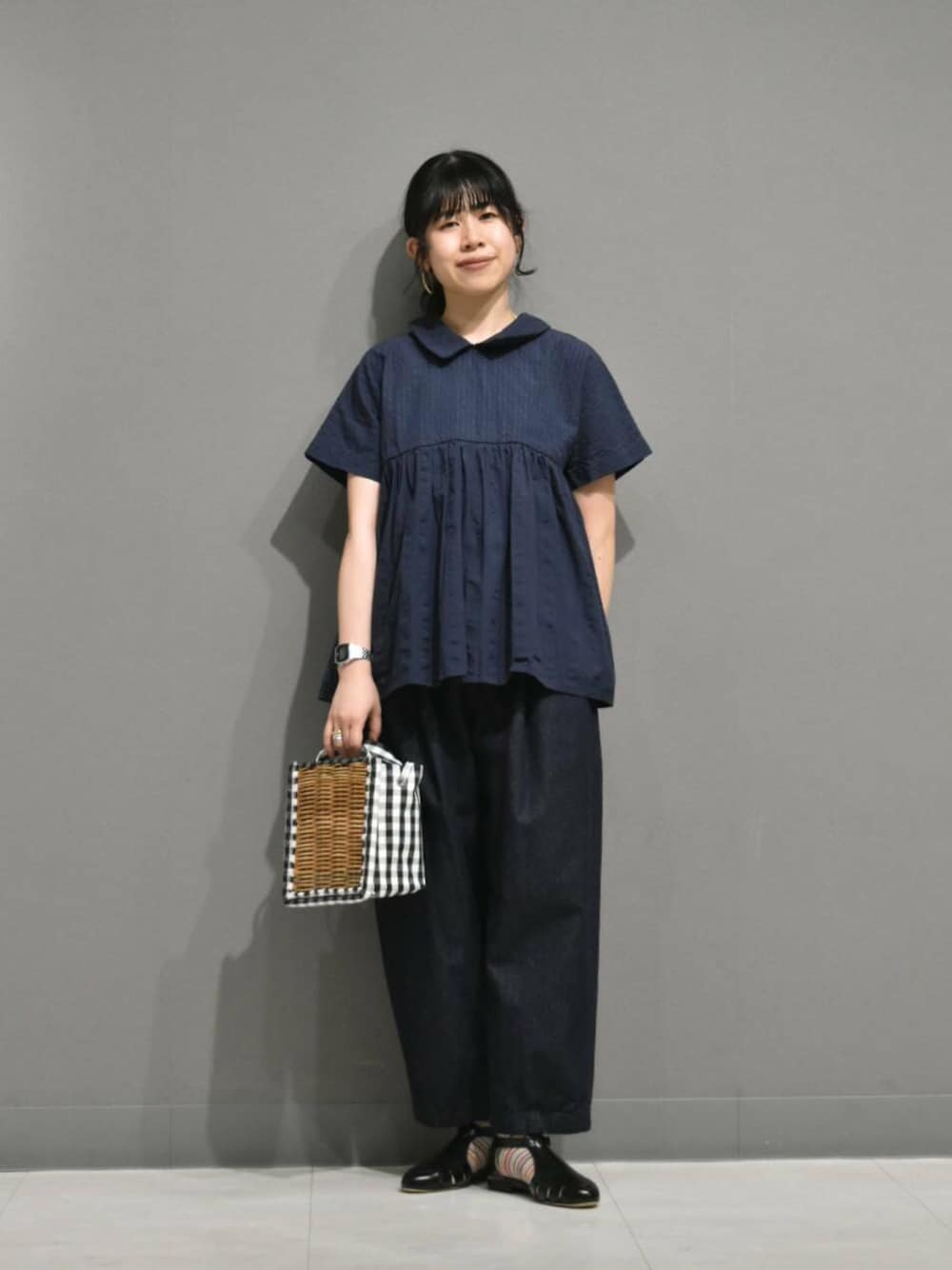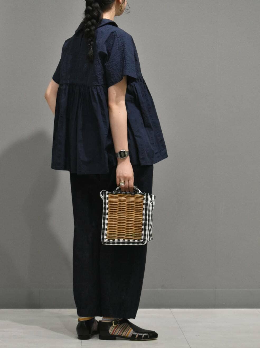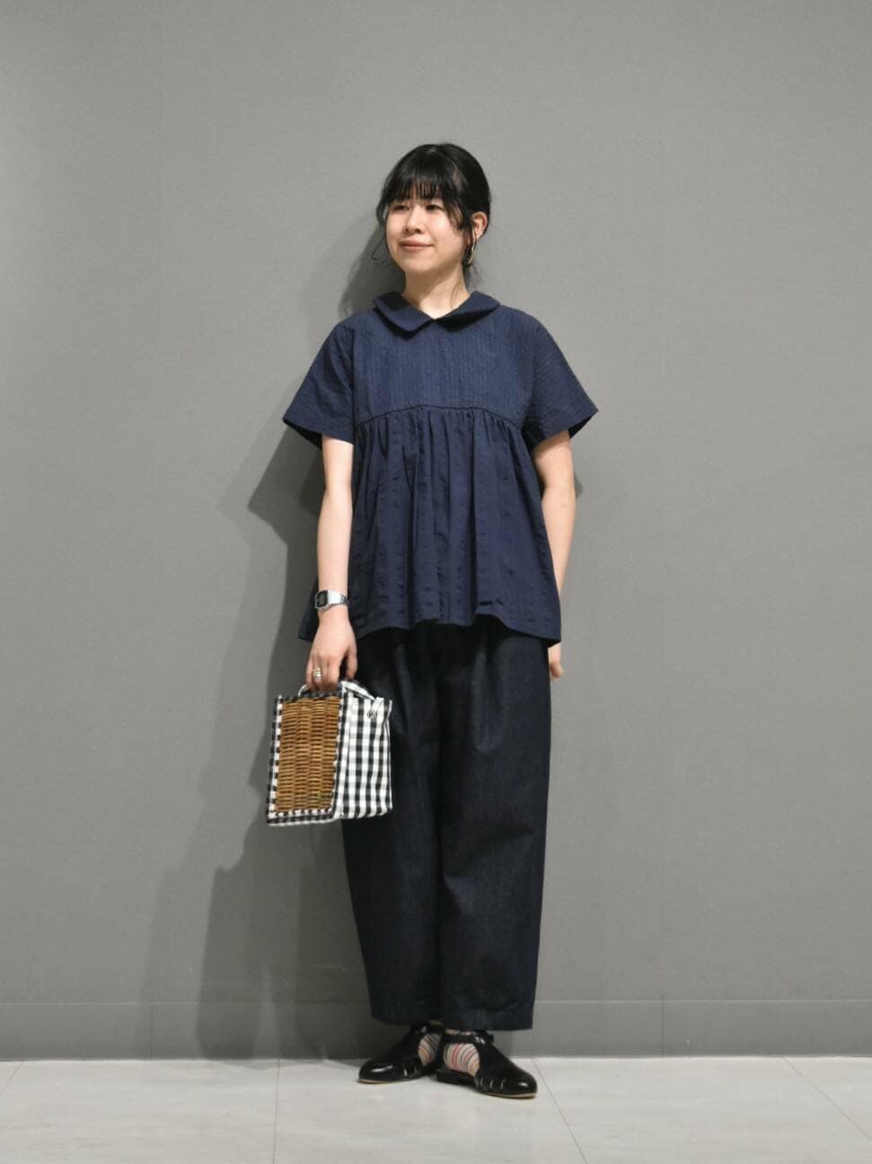 フェミニンなラウンドカラーとウエストギャザーデザインなのに、どこかマニッシュなサッカー地に惹かれます。