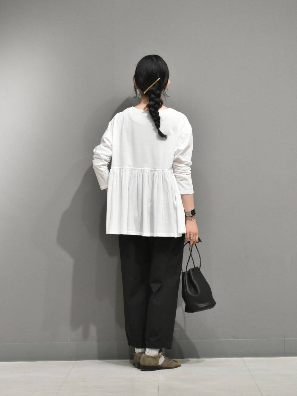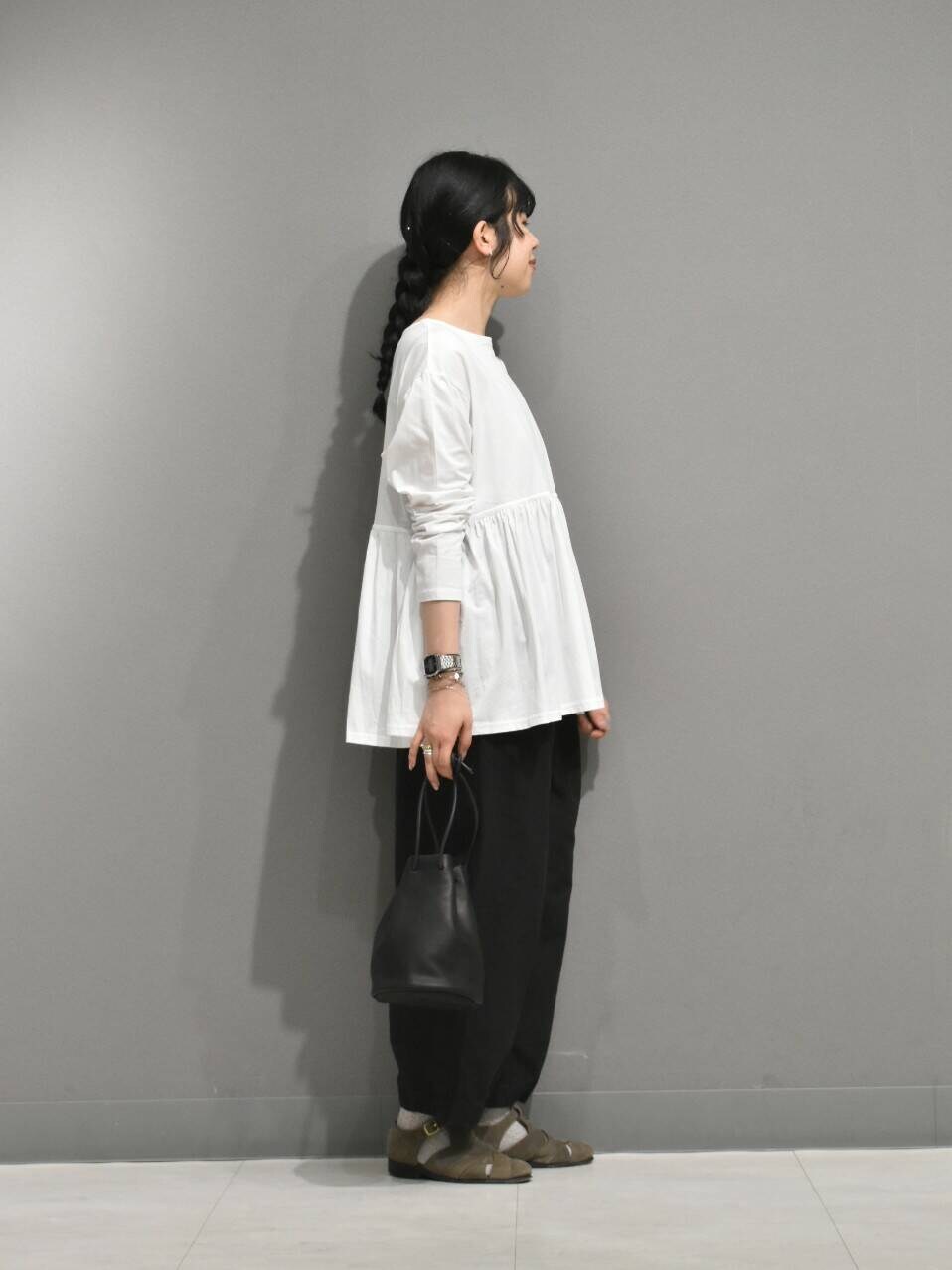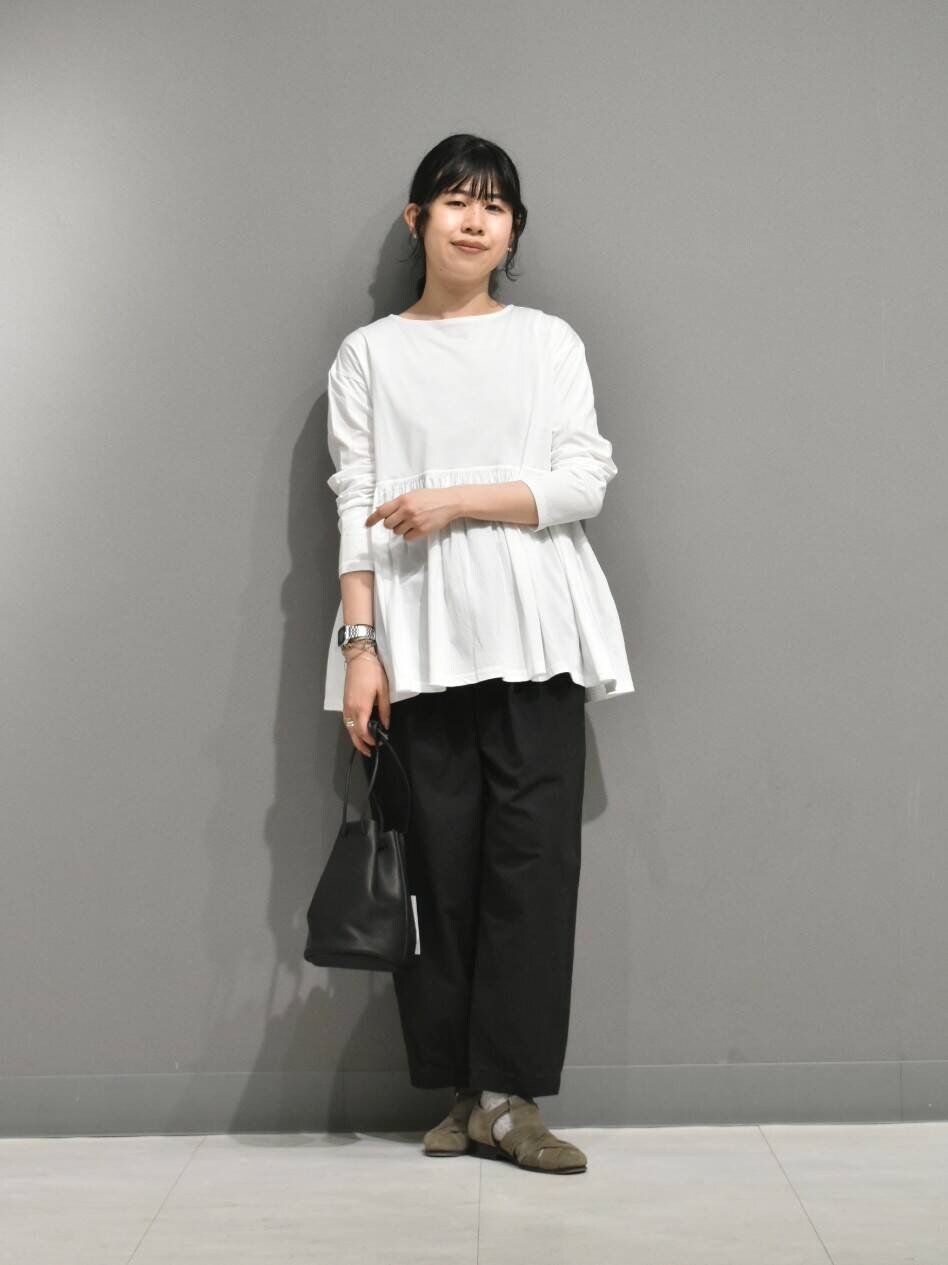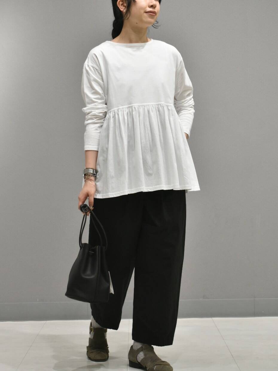 女性らしいカットソーが入荷したので、ウエストのギャザー部分を強調したスタイリングを組んでみました。