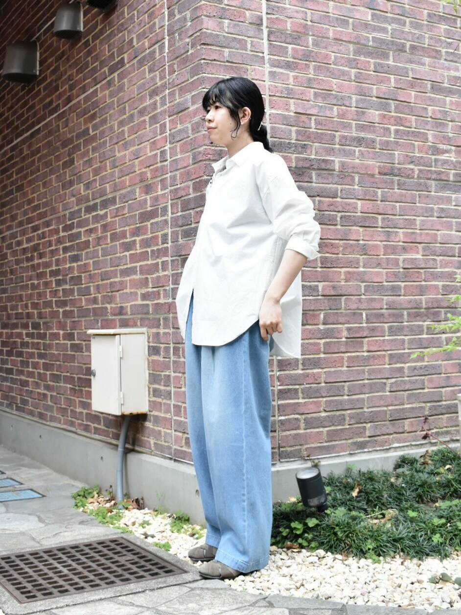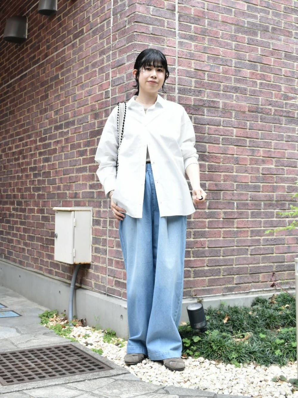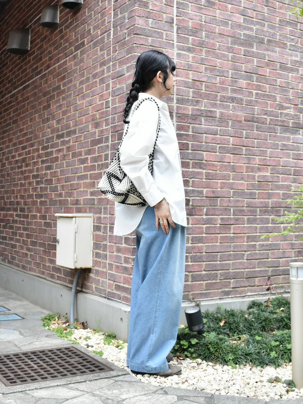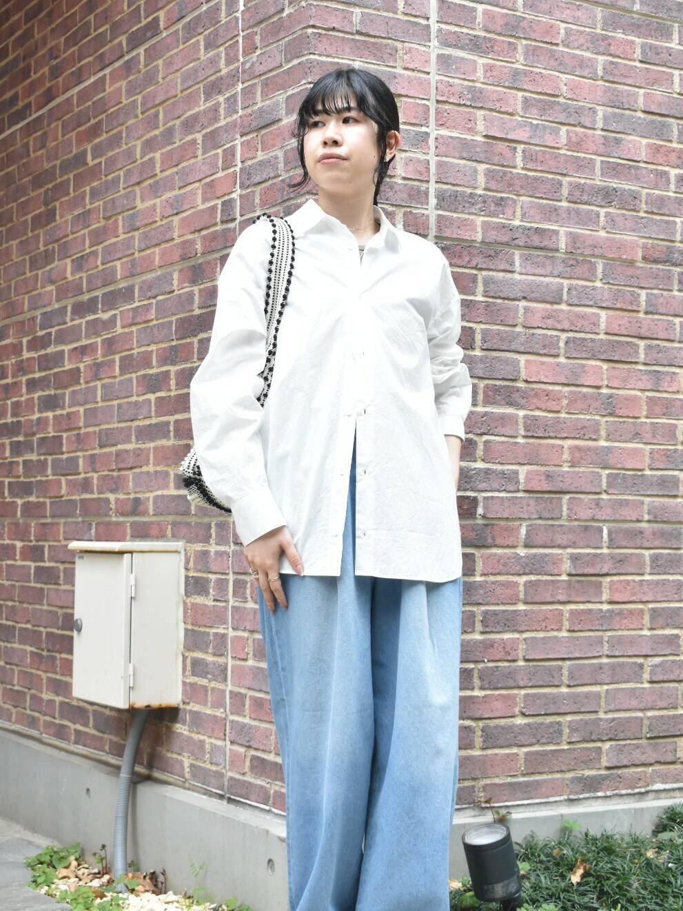 シンプルなレギュラーカラーのシャツは上下のボタンを外してインナーを少し見せると垢抜けた印象に◎