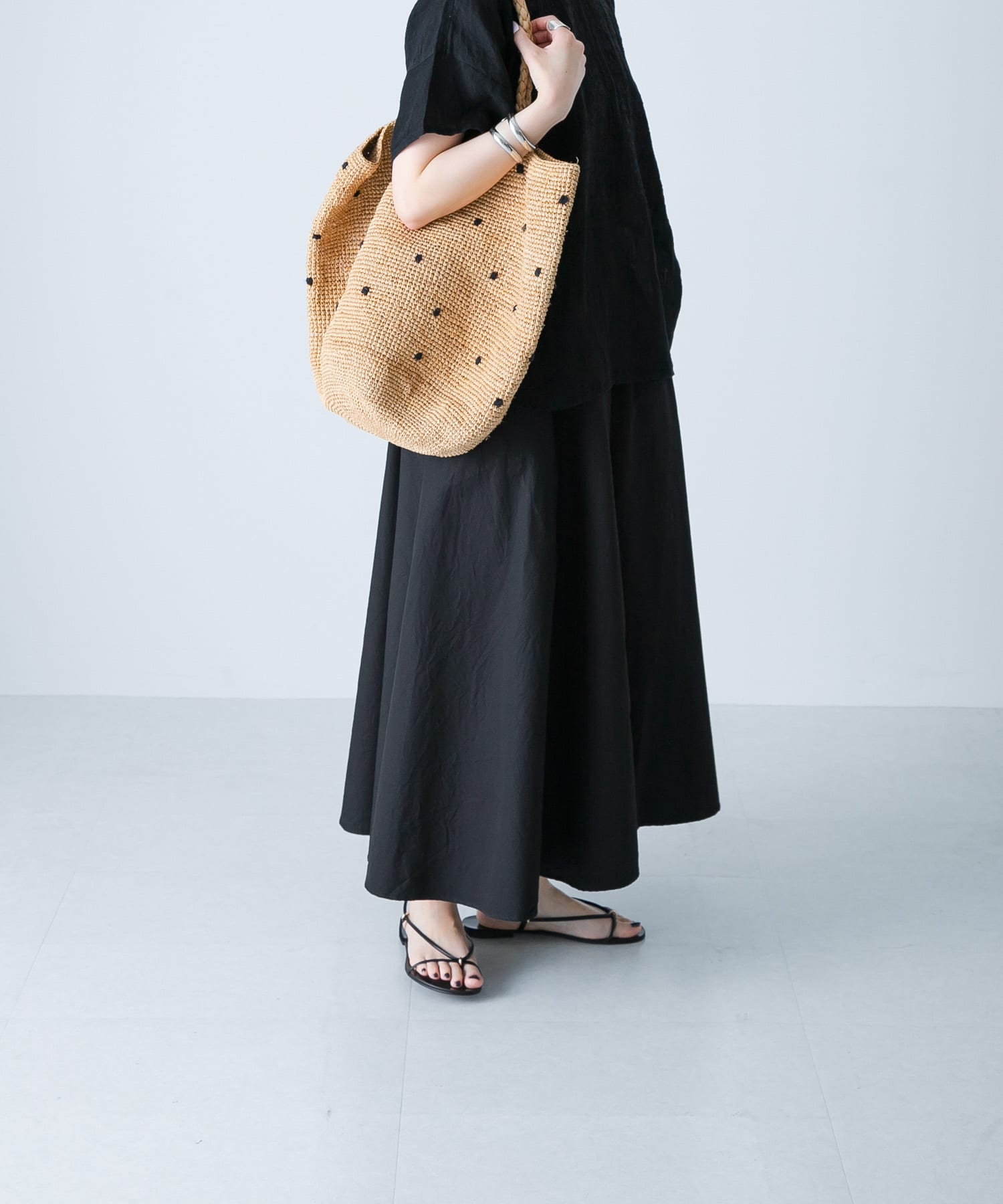 ハリ感のある綿素材のフレアスカートはウエストやヒップをすっきりと魅せてくれる優れもの。