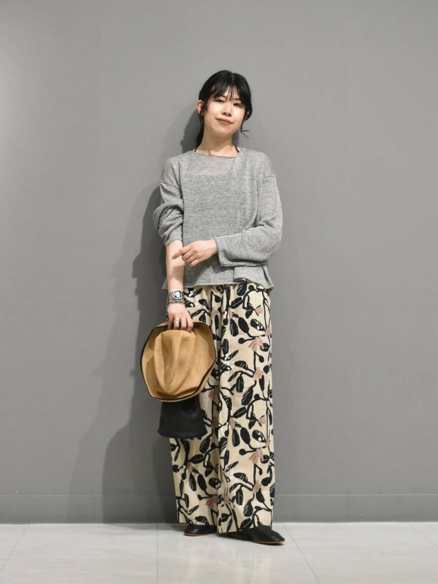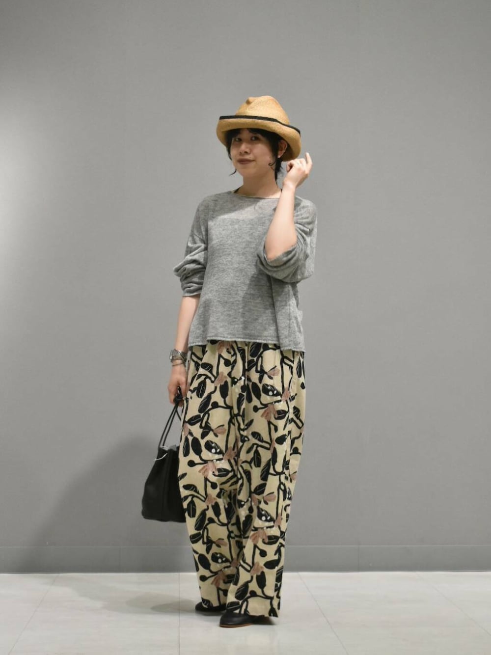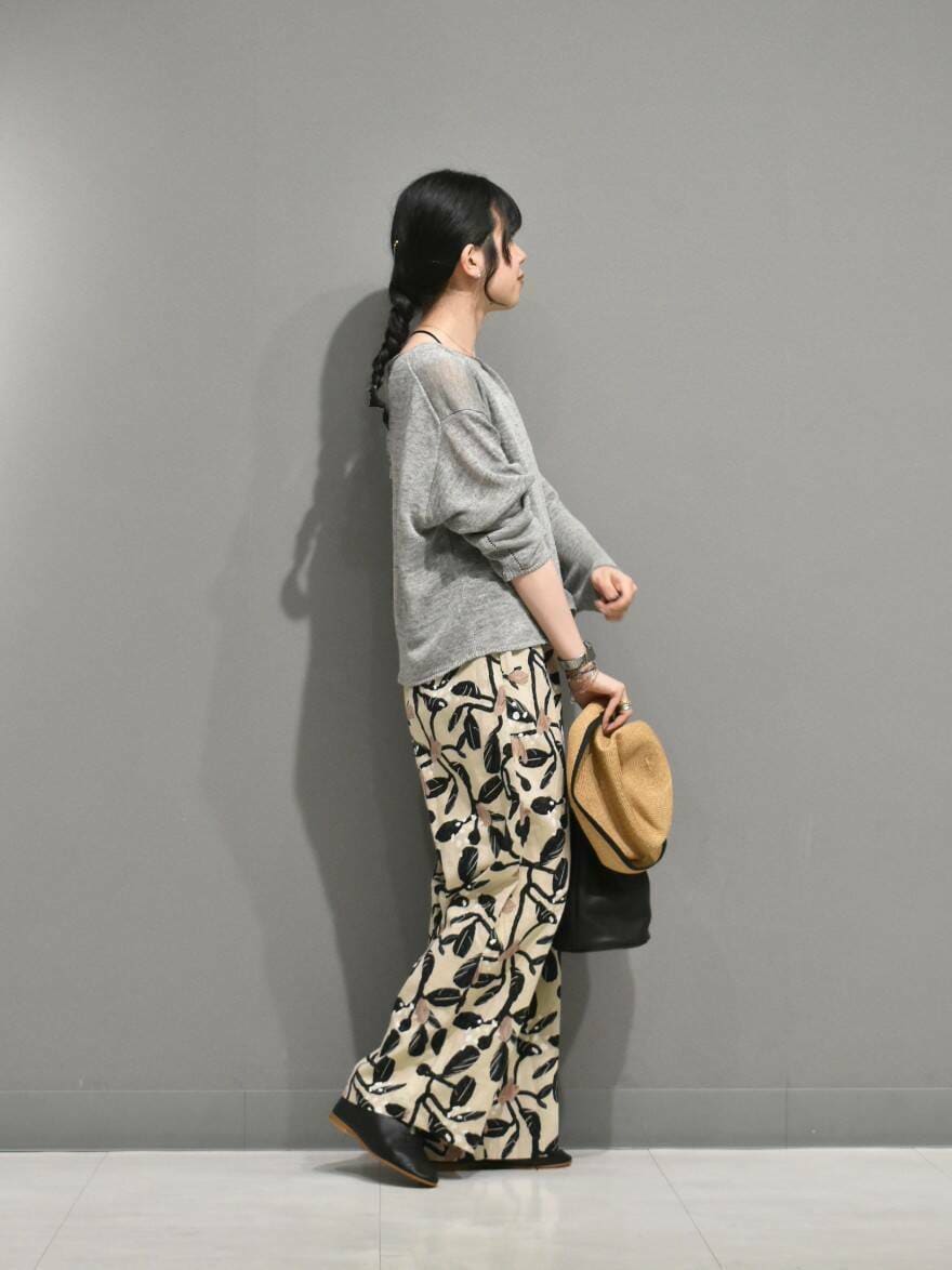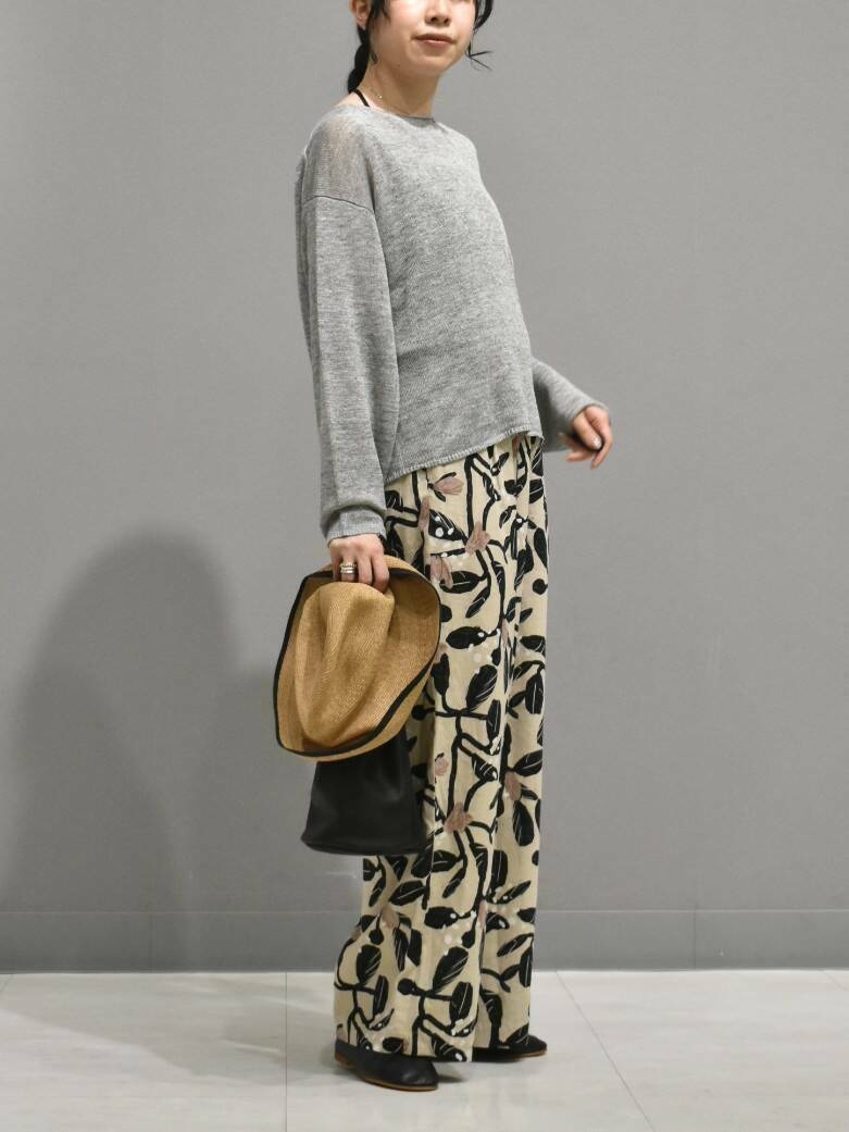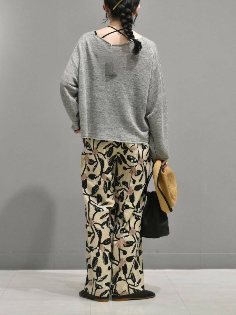 新作のコットンリネンプリントイージーパンツがお店に入荷したので、さっそくスタイリングを組んでみました。