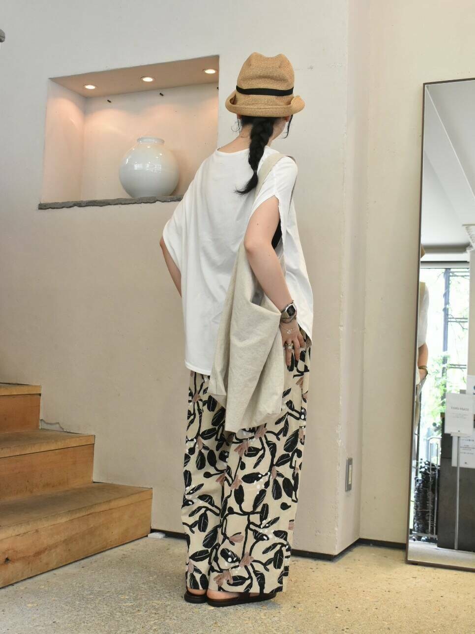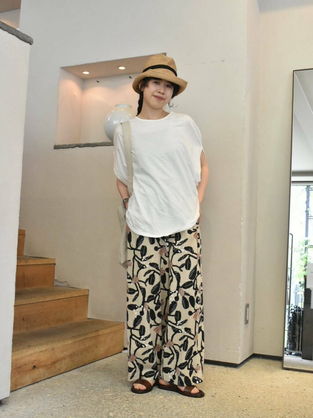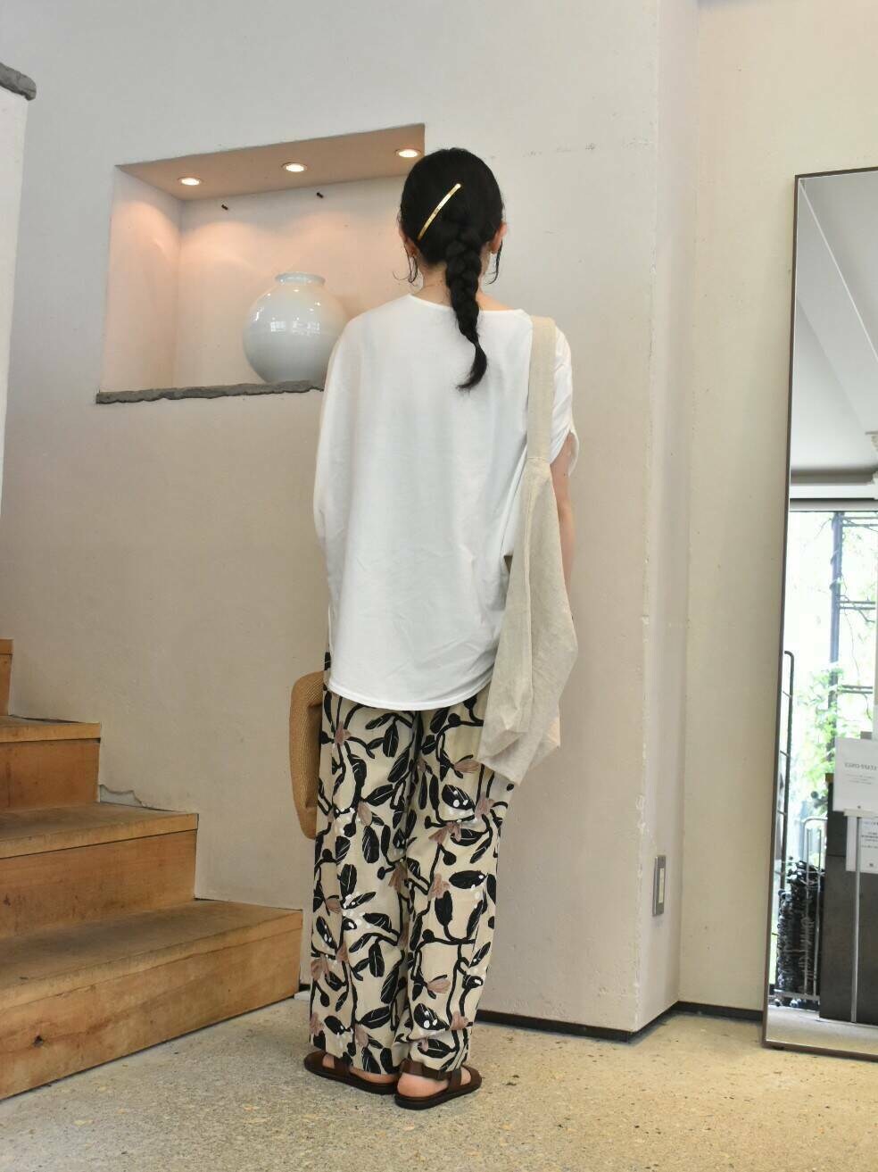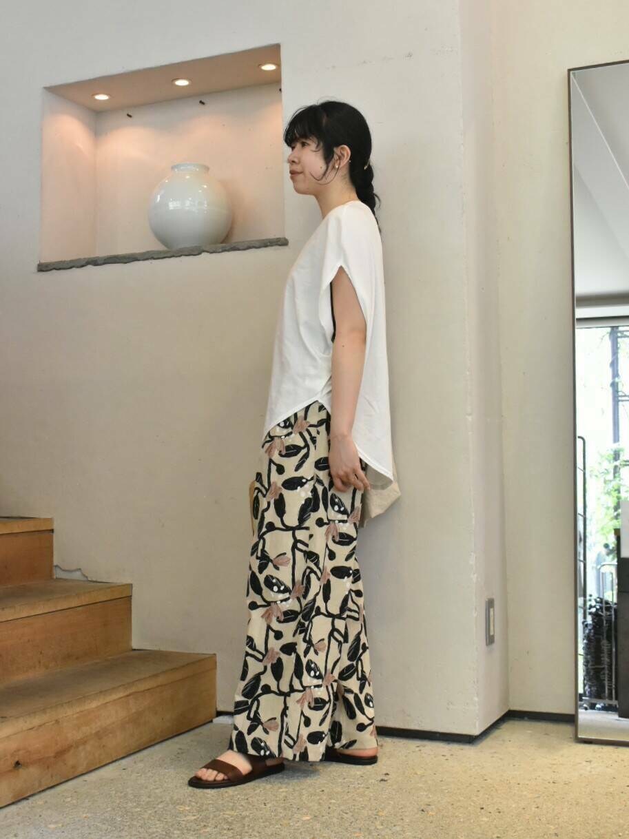 コットンリネンプリントイージーパンツが表参道店にも入荷しているので、シンプルなスタイリングを組んでみました。