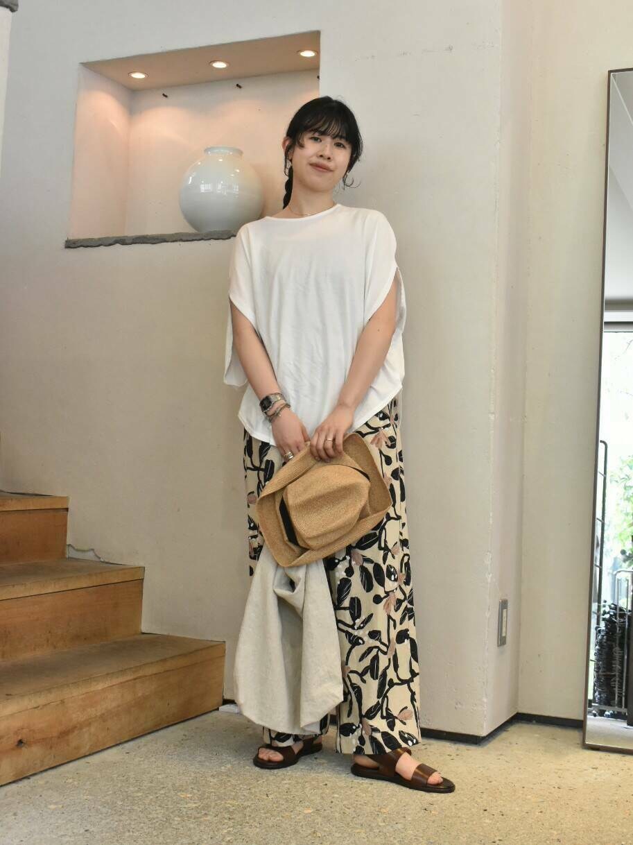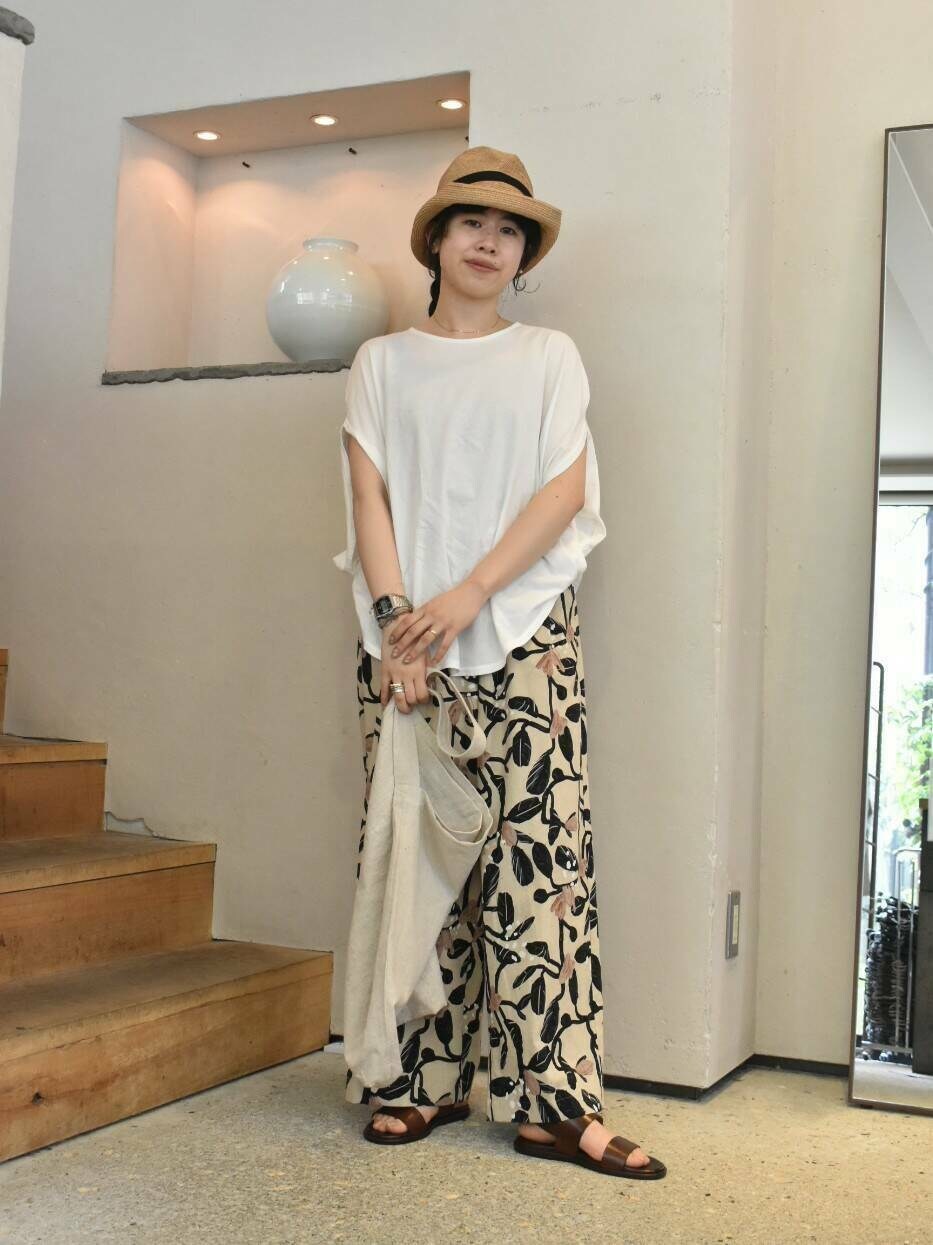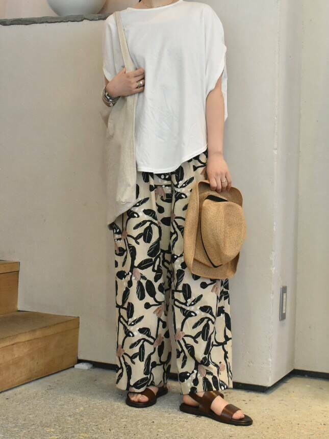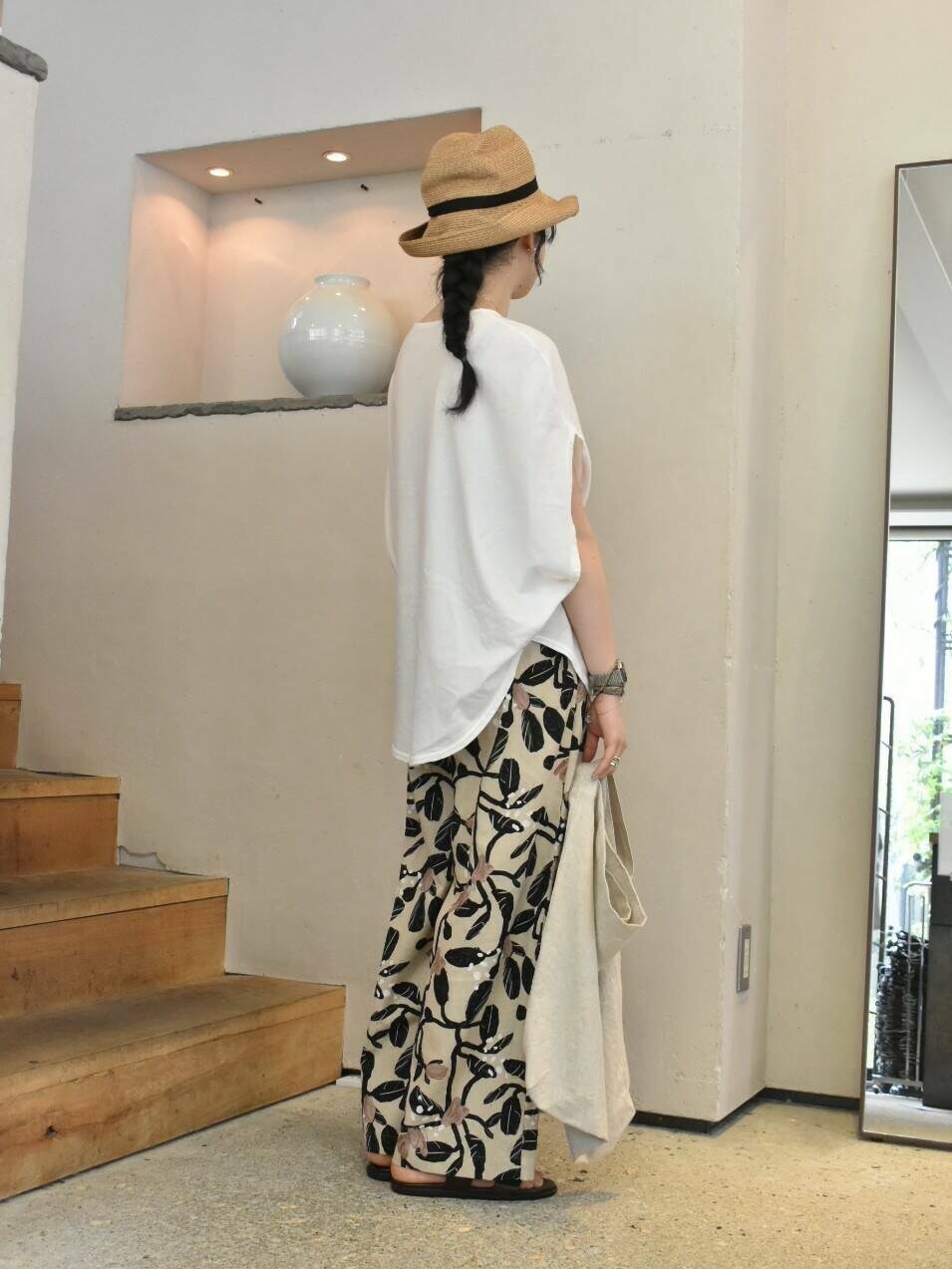 コットンリネンプリントイージーパンツが表参道店にも入荷しているので、シンプルなスタイリングを組んでみました。