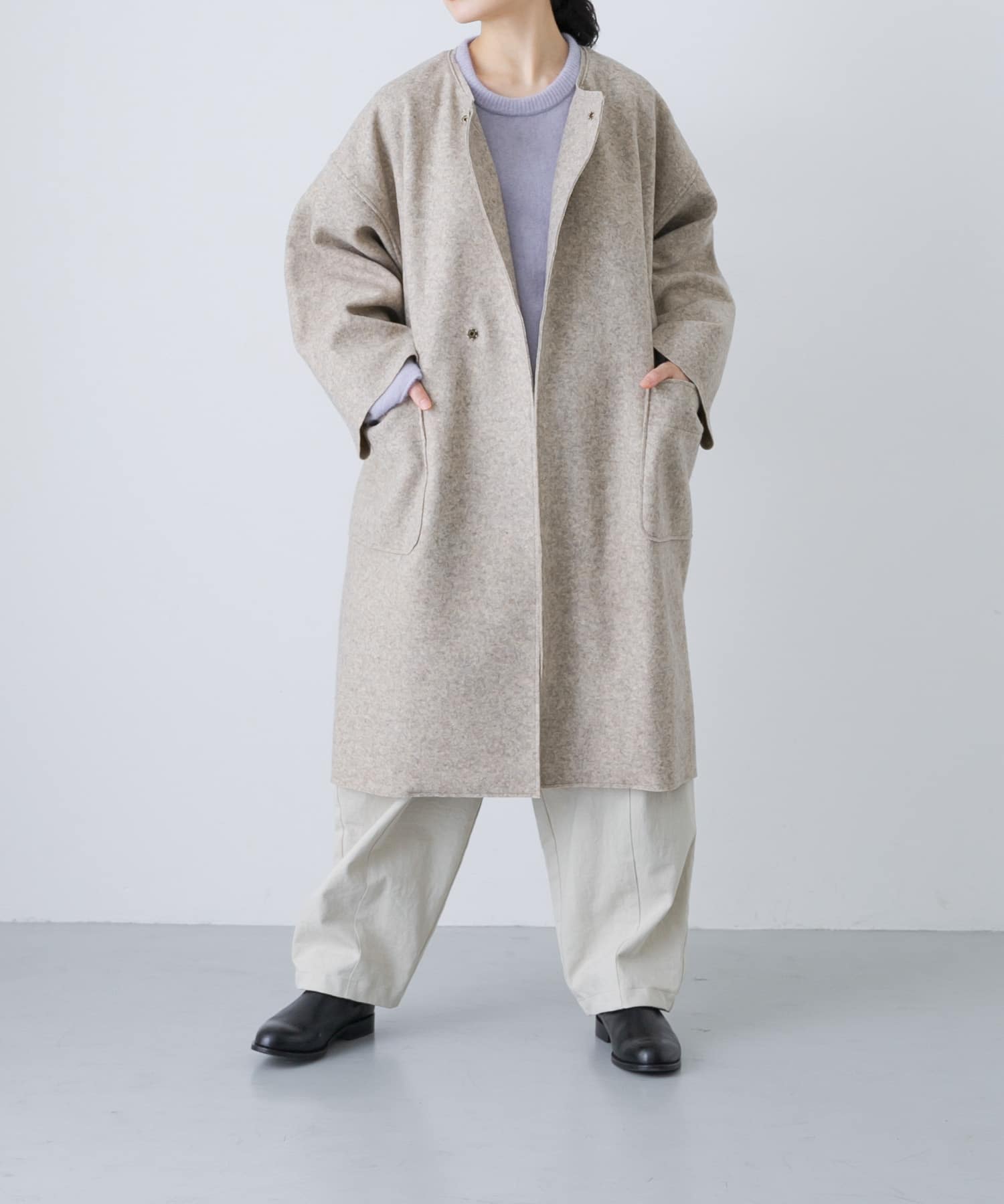 平面的なパターンと断ち切りのデザインが素敵なノーカラーコート。軽い着心地で普段使いに◎お洋服にはもちろん、お着物にも羽織れるように作られています。