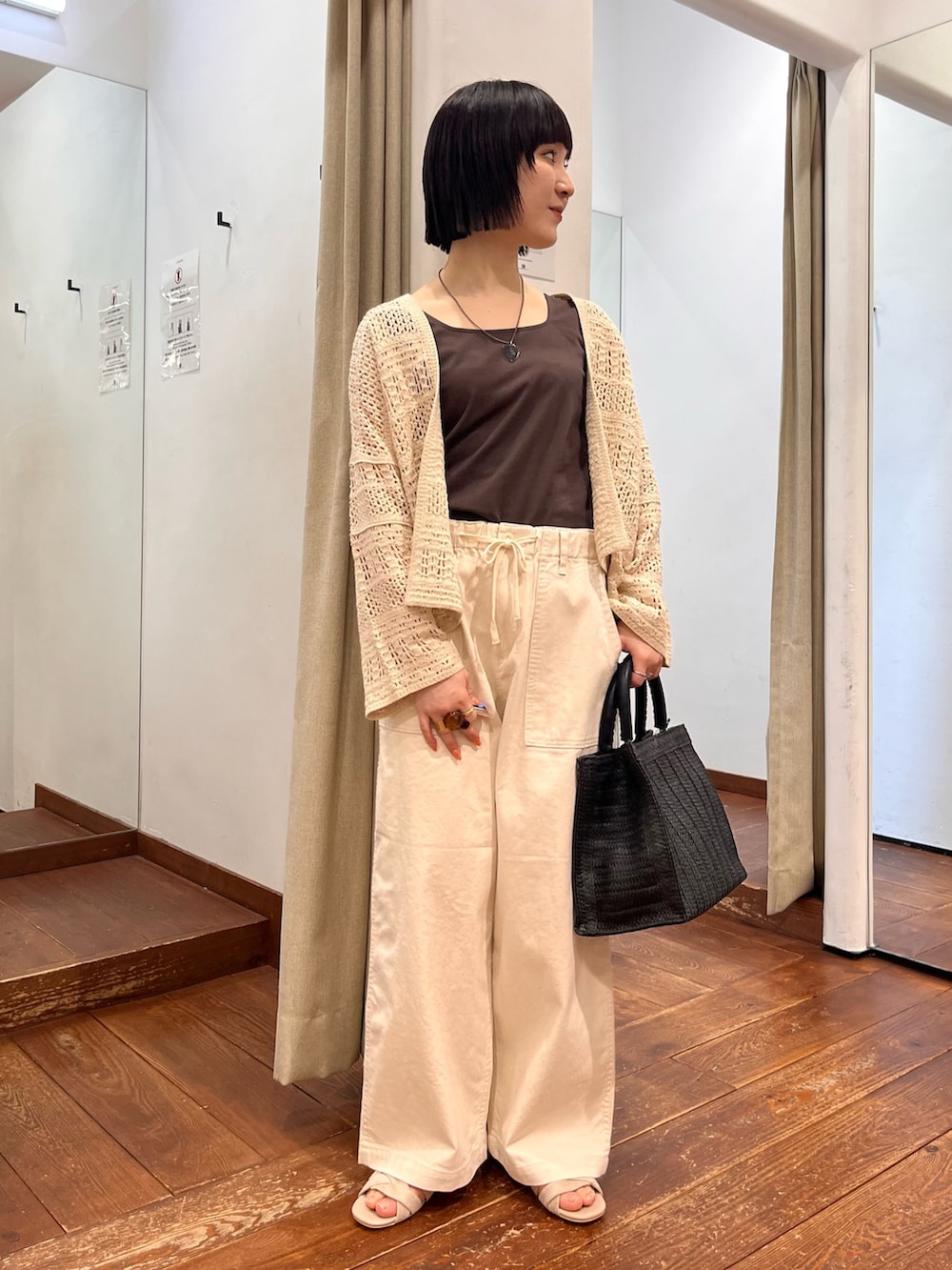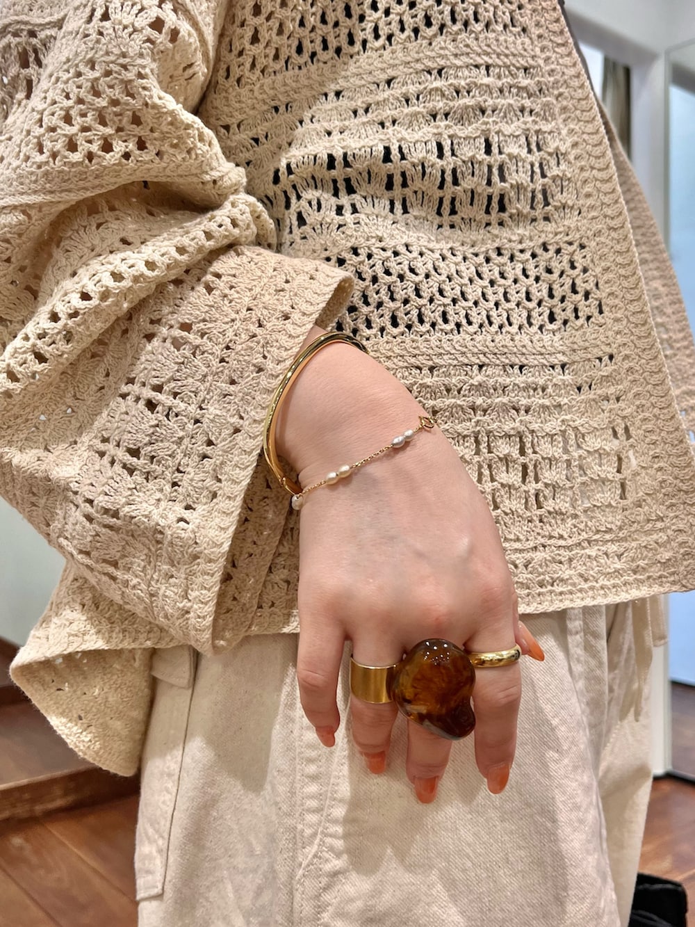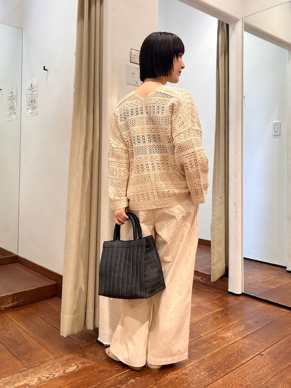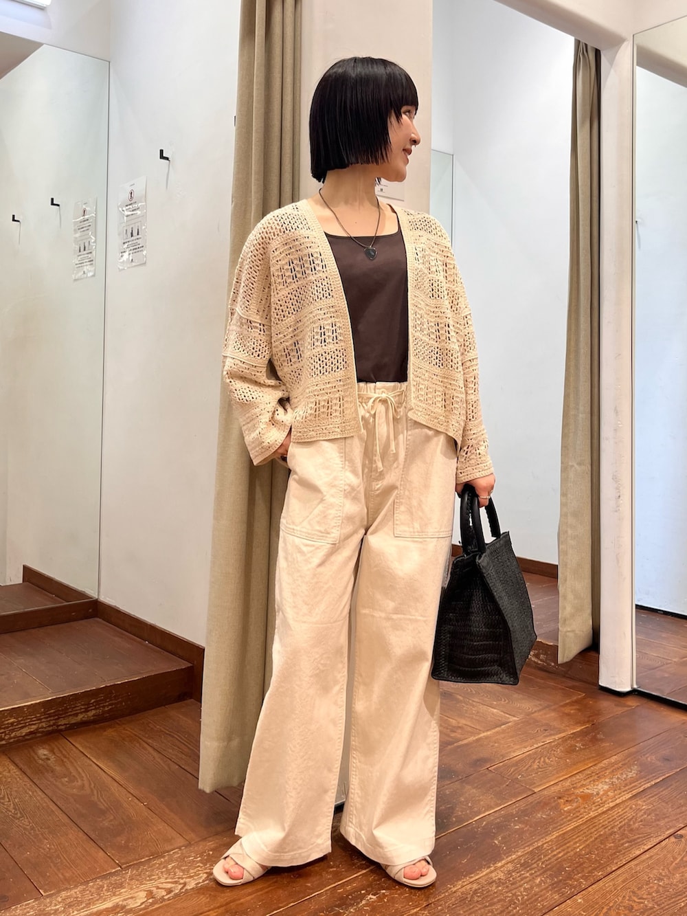 ナチュラルで柔らかい雰囲気ただようクロシェ編み。ボタンレスなのでサラッとはおるだけで春夏スタイリングのちょっとポイントになり可愛いです🦙
