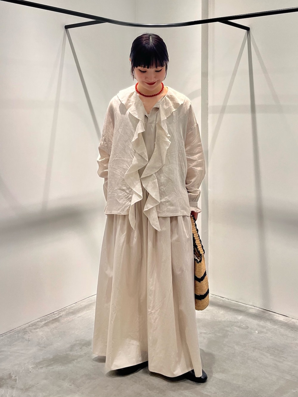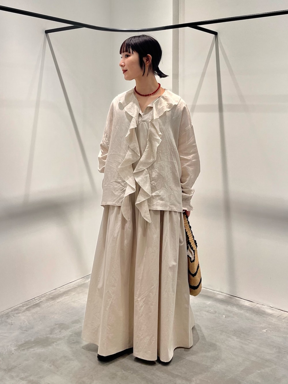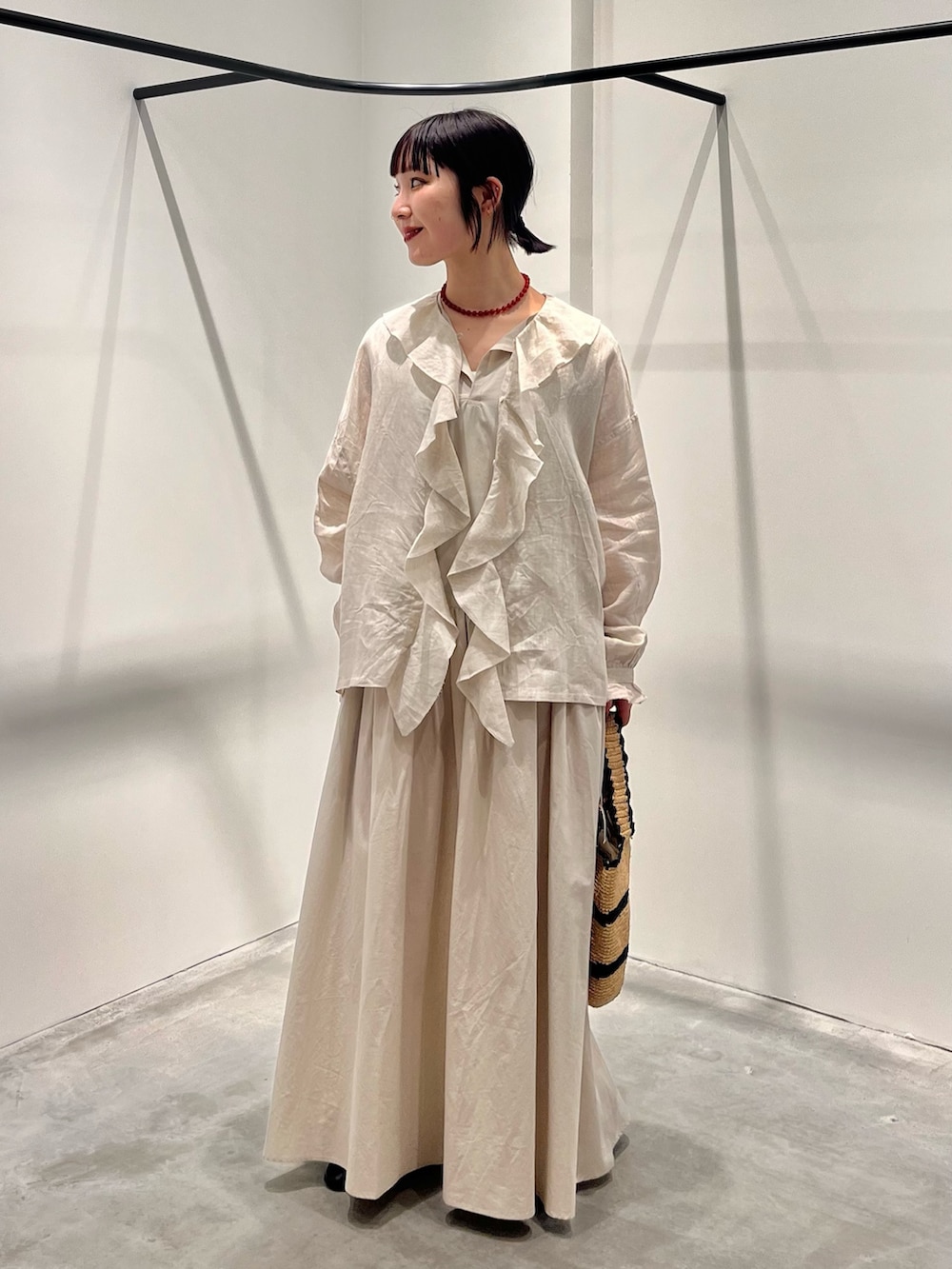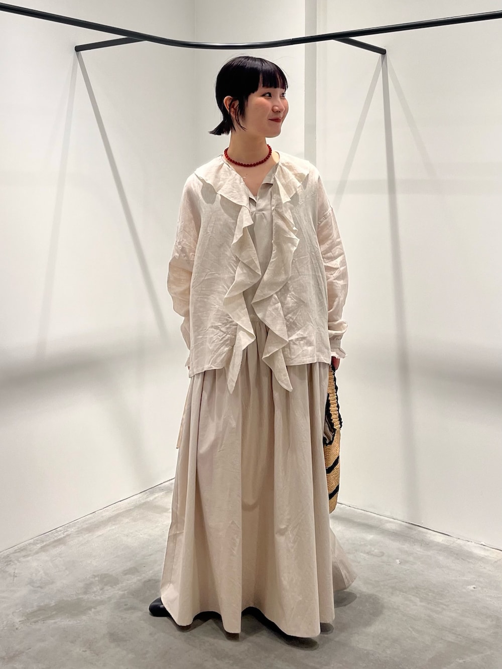 フロント、袖にたっぷりあしらったフリルが特徴的で薄手のフレンチリネンを使用し天然素材ならではのシャリ感と抜け感があります🫧
