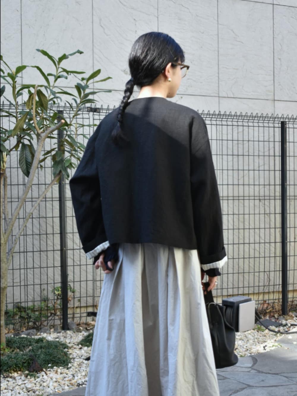 オンオフ問わず楽しんで頂ける、かぐれのノーカラージャケット。