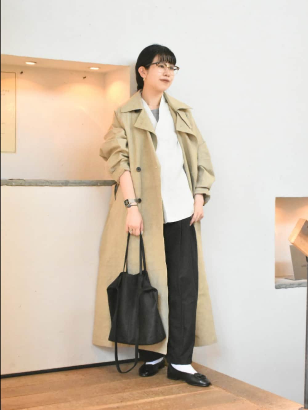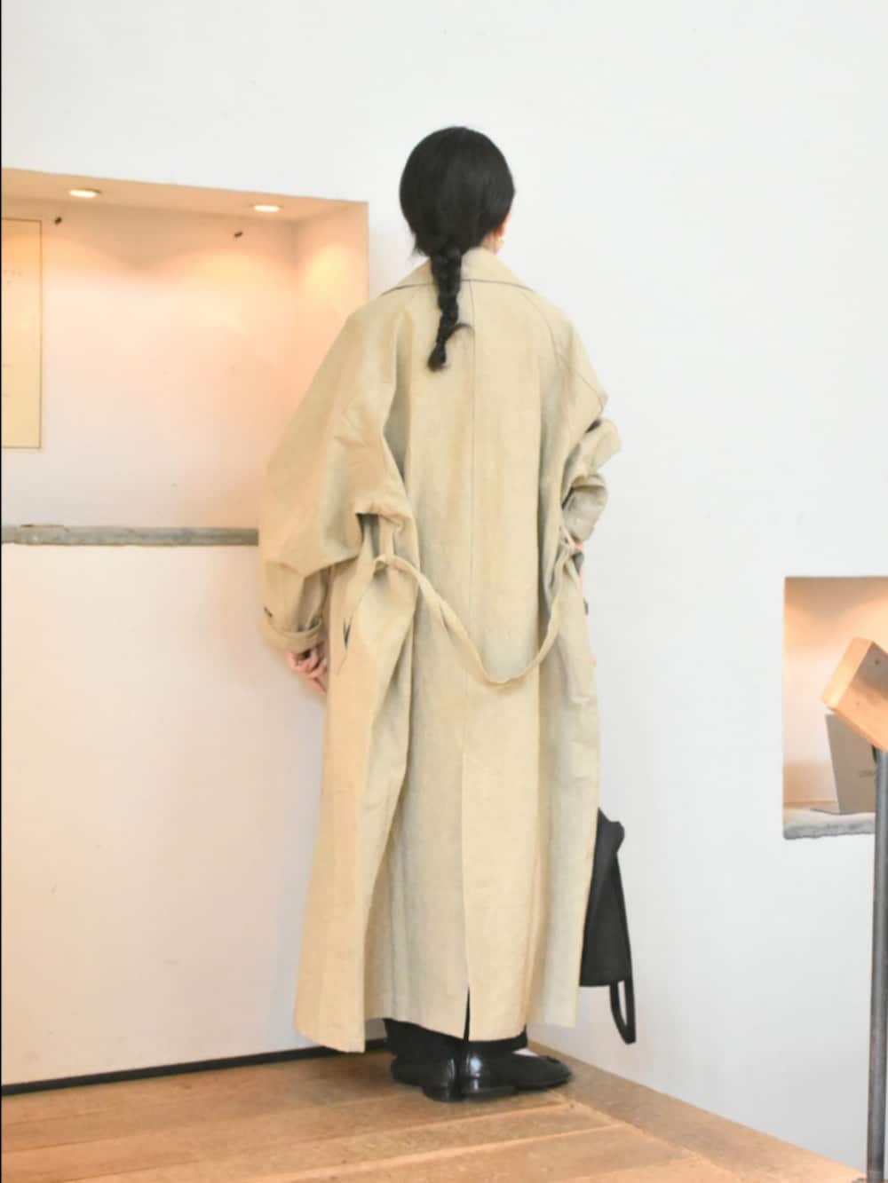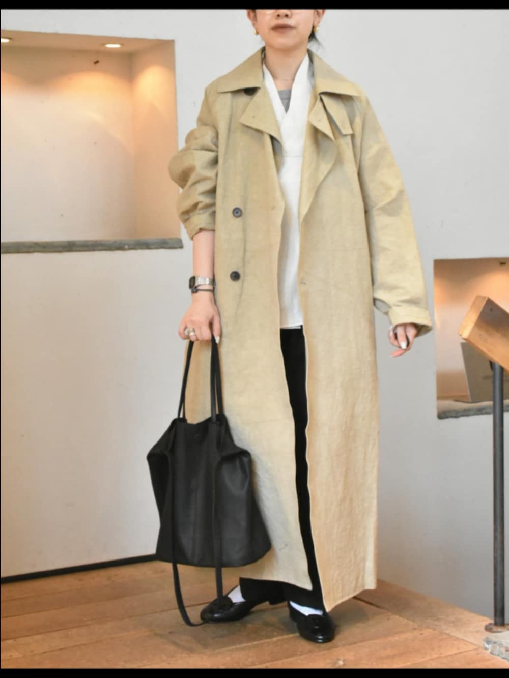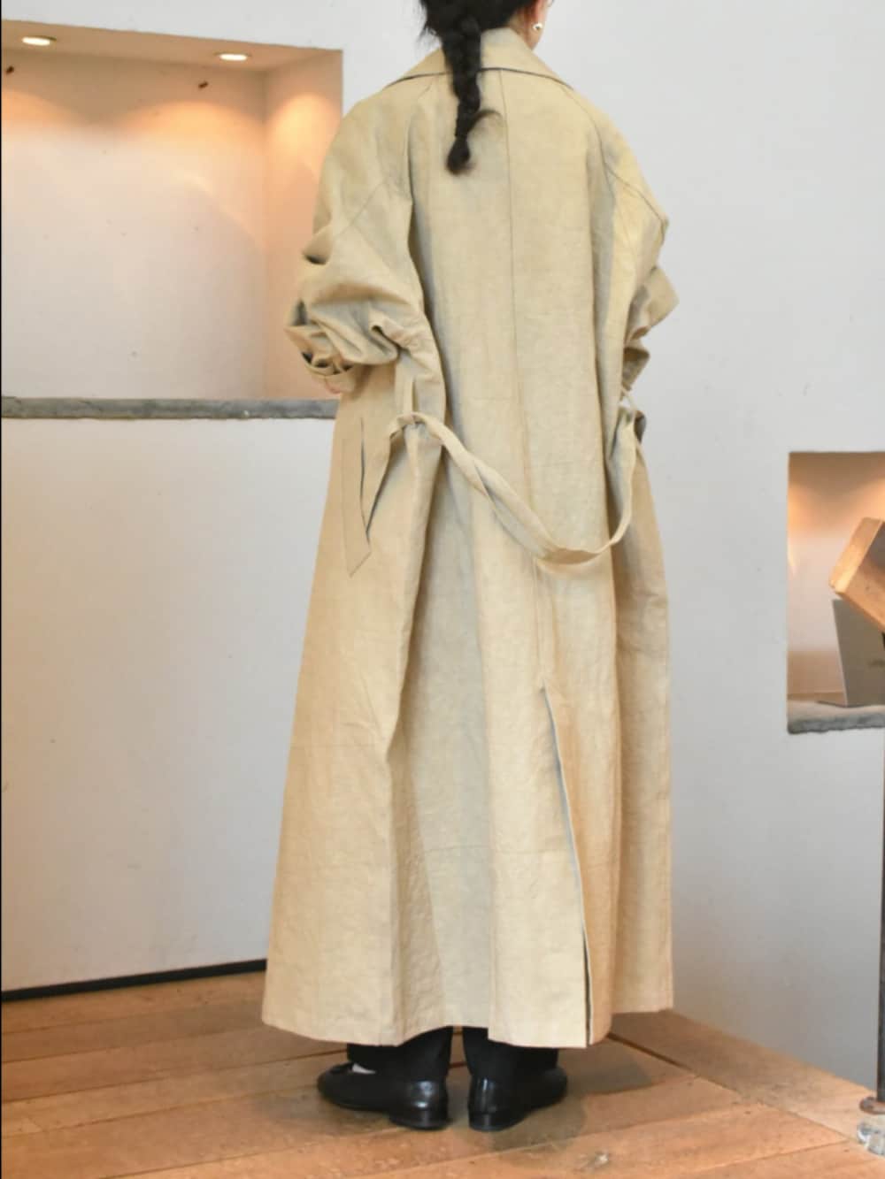 コットンリネン素材と色の風合いが格好良い、かぐれのトレンチコート。