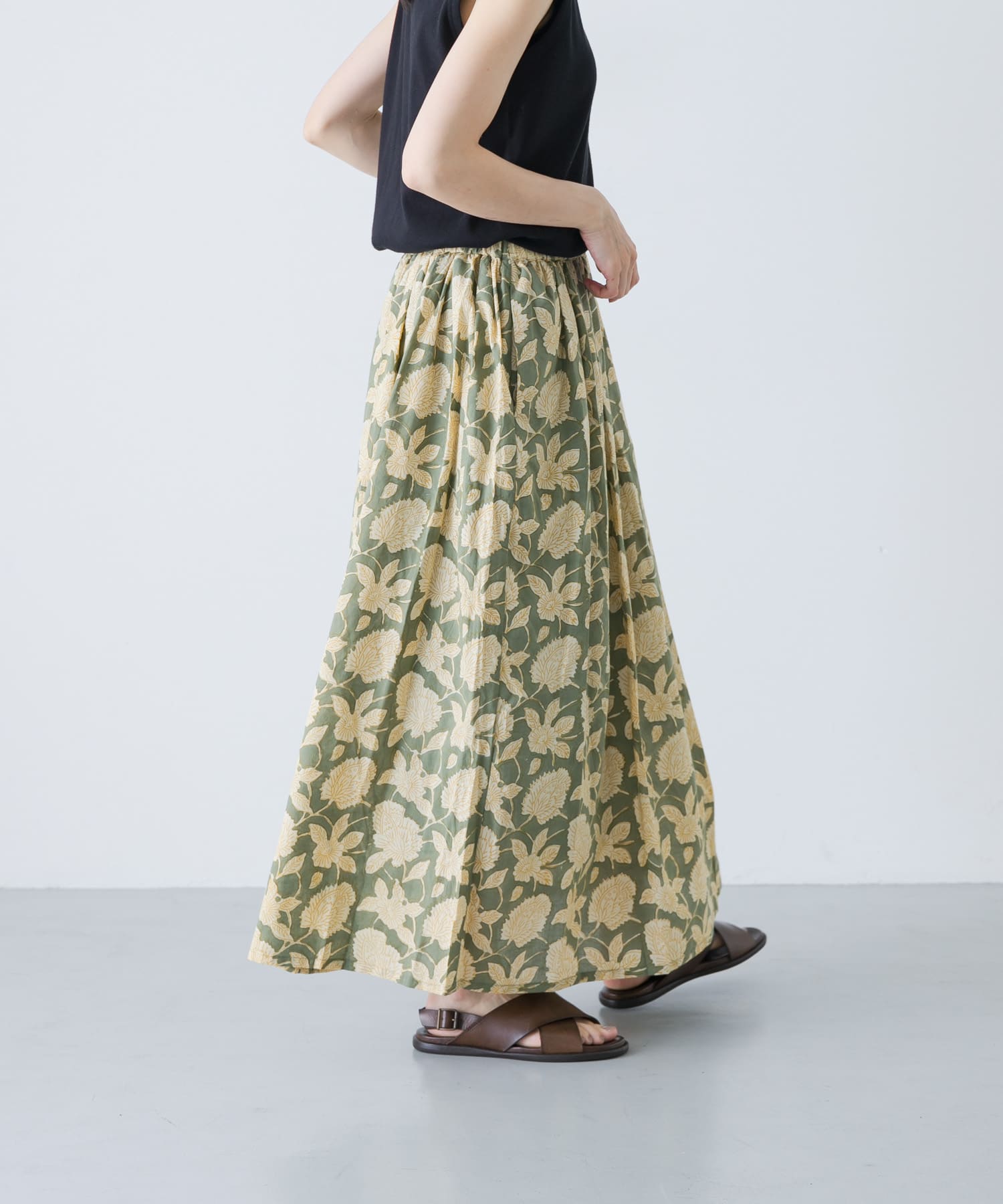 かぐれのエスニックプリントギャザースカートは、秋のスタイリングがぱっと華やぐアイテム。