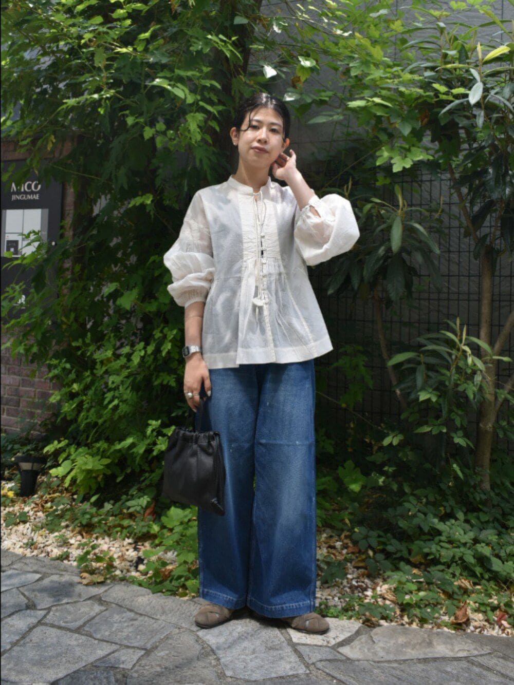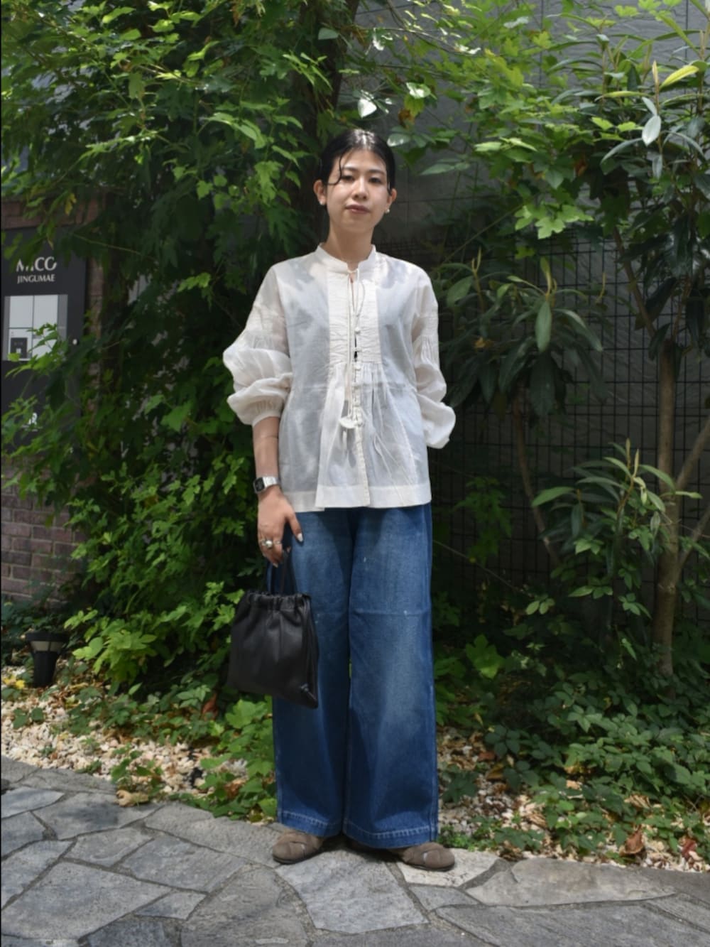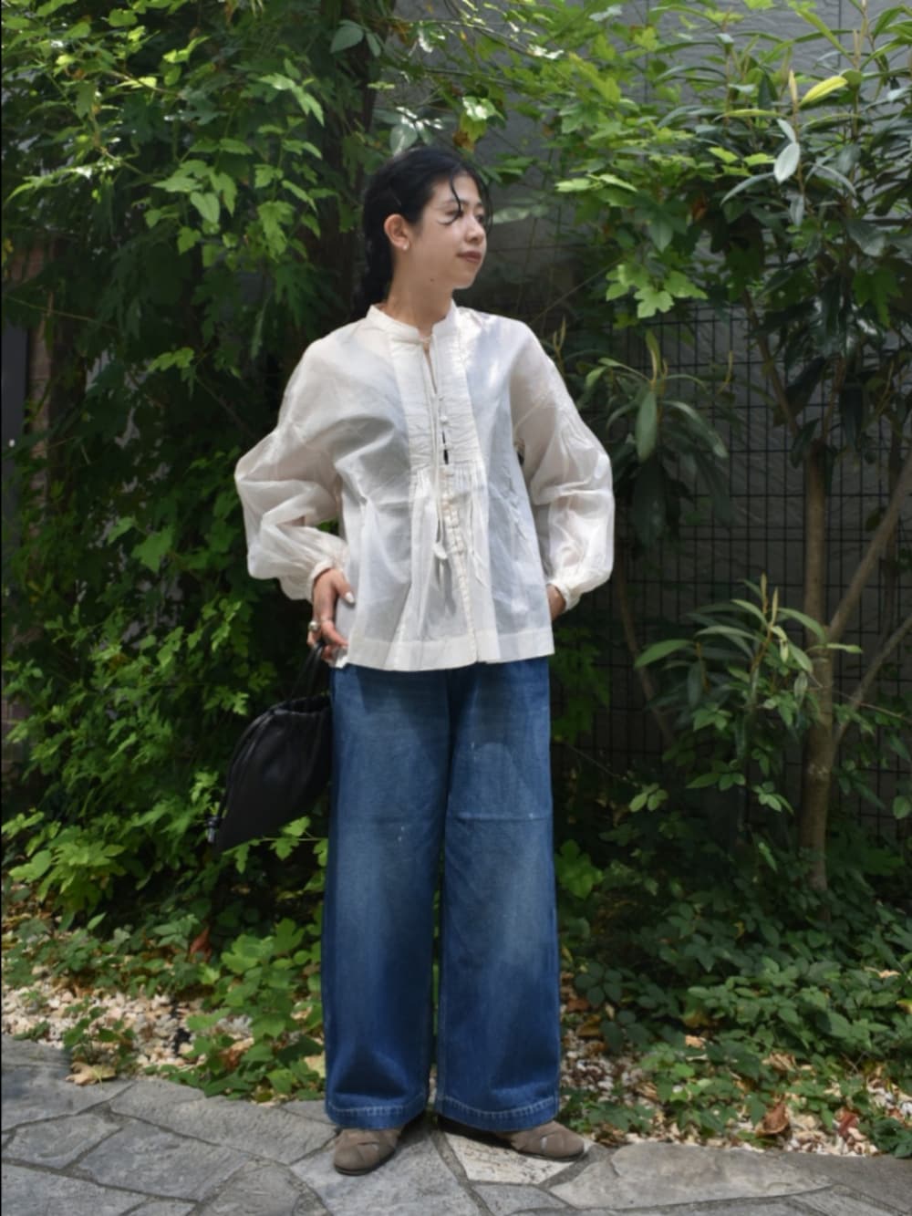 絶妙な透け感とシルエットが大人可愛い、ブラウスでカジュアルなスタイリングを組んでみました。