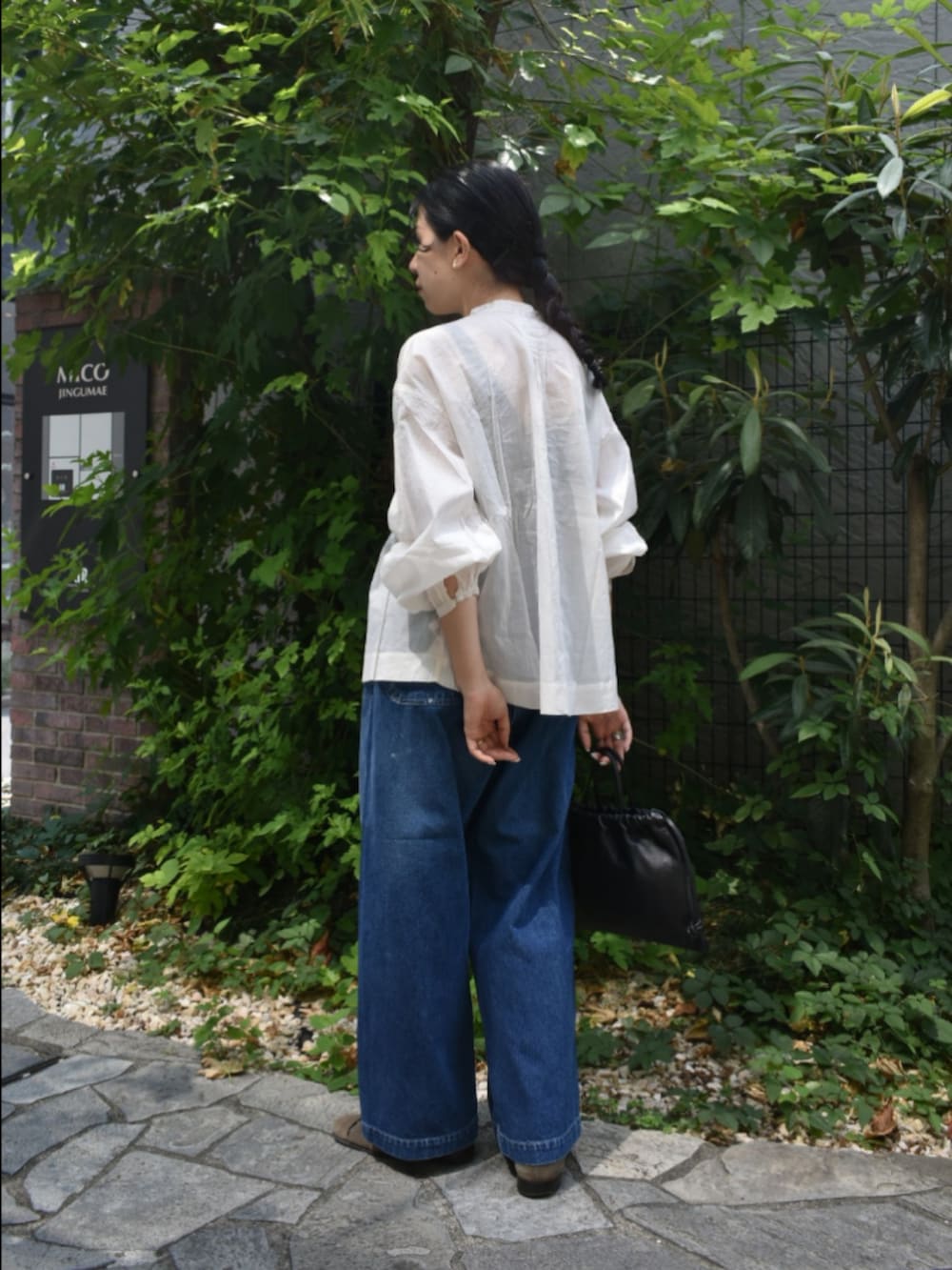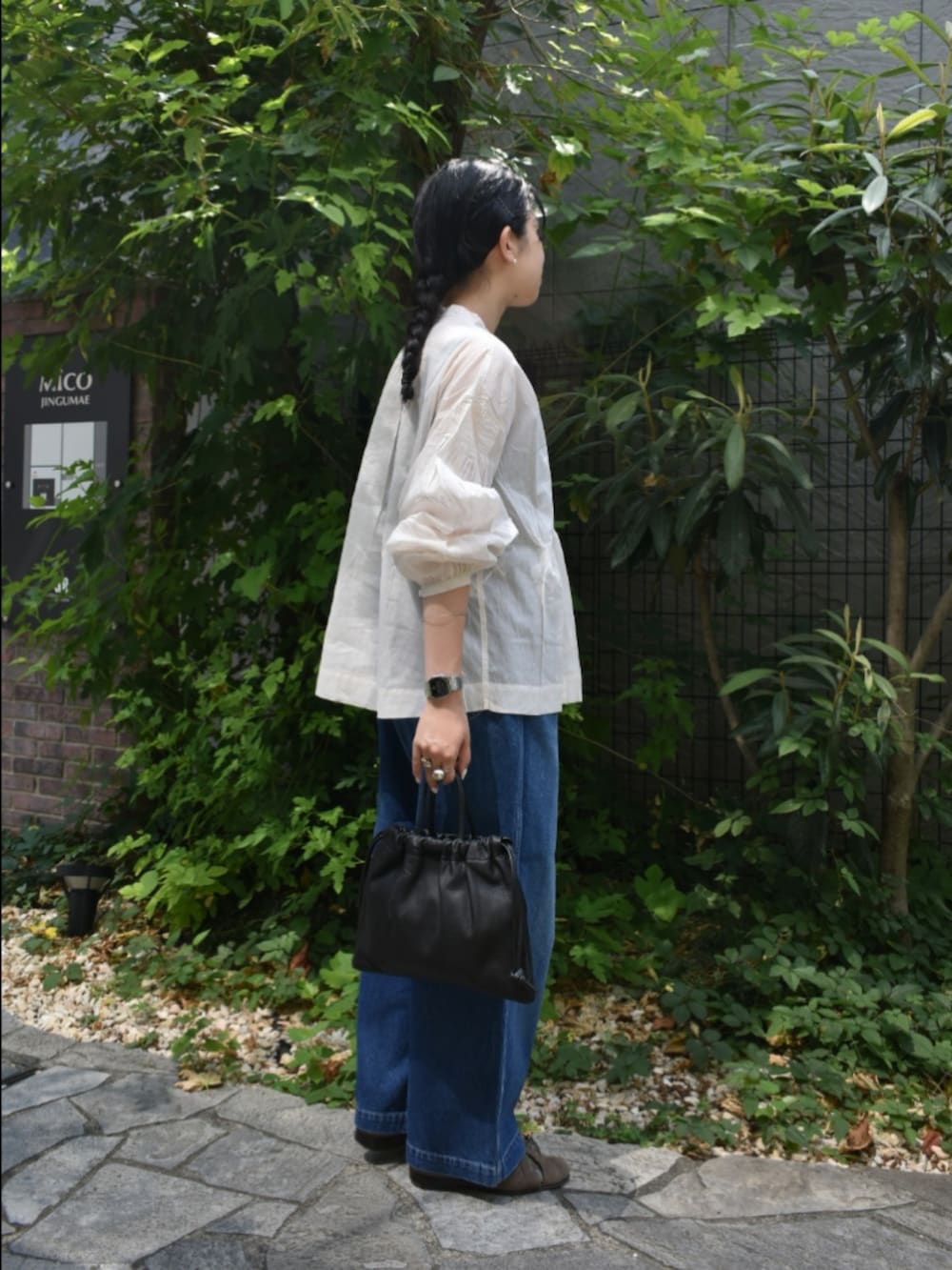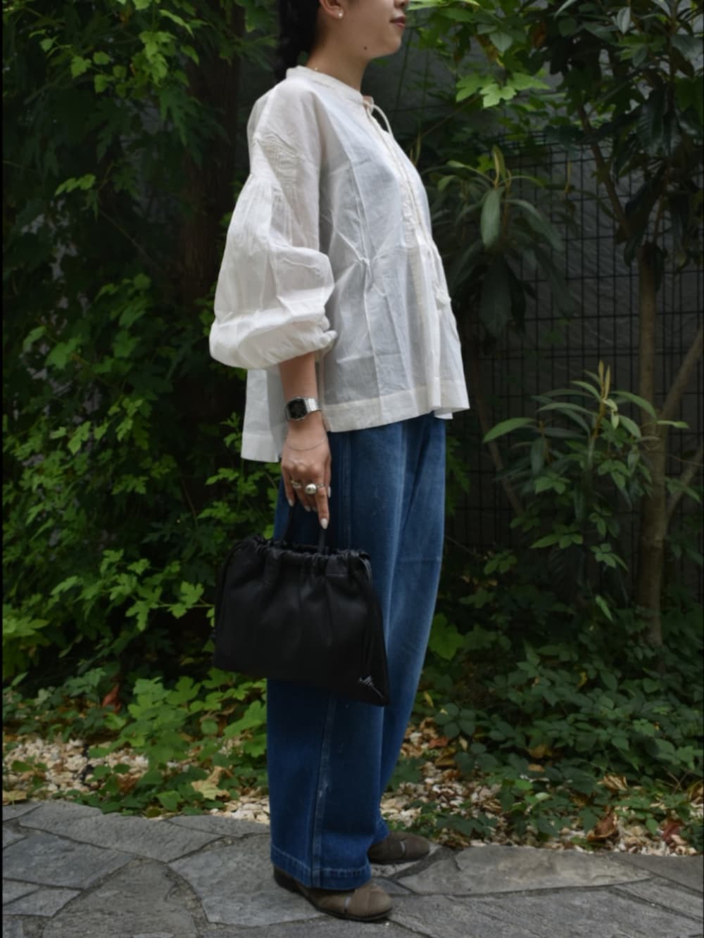 絶妙な透け感とシルエットが大人可愛い、ブラウスでカジュアルなスタイリングを組んでみました。