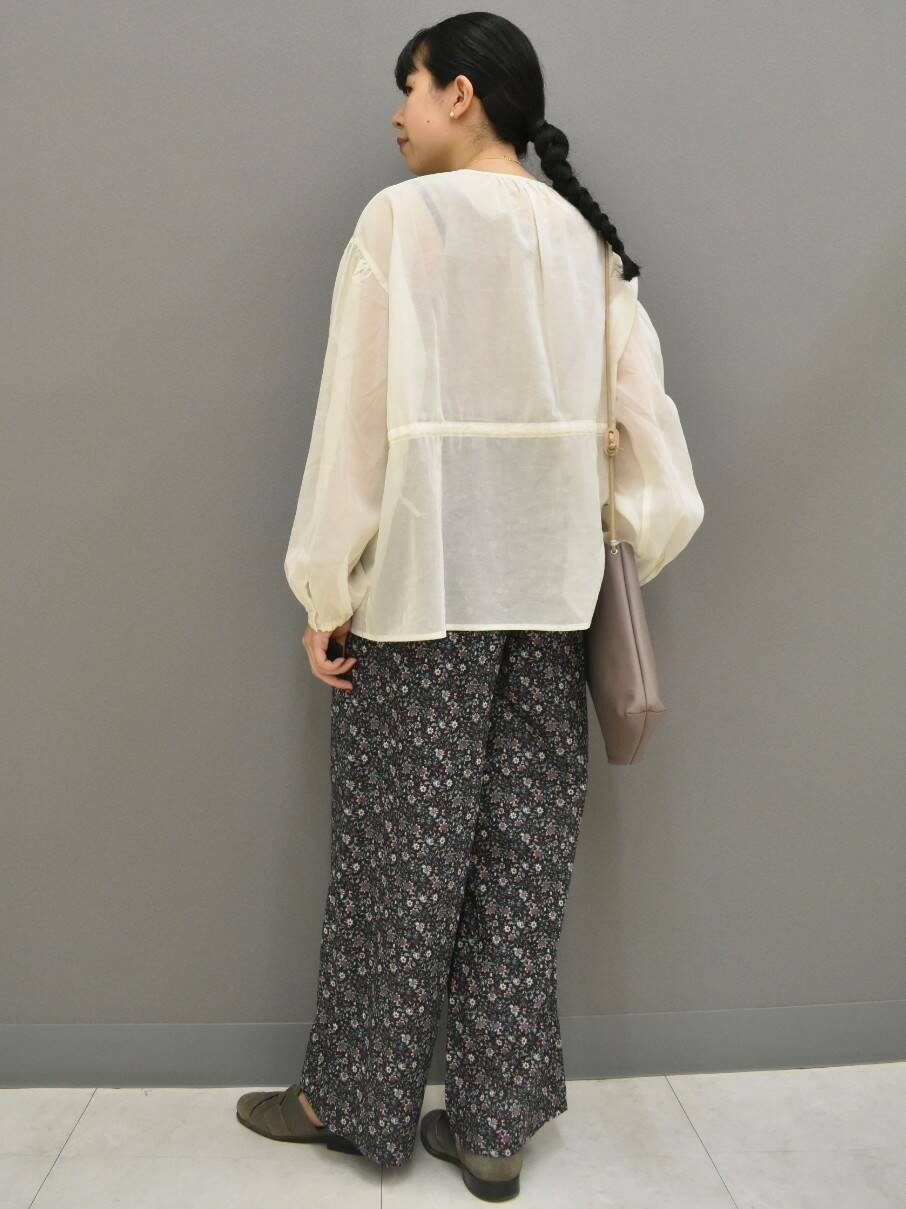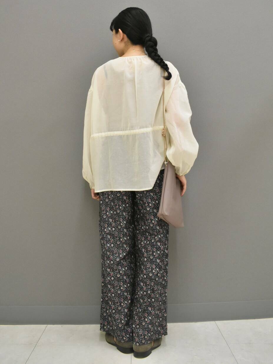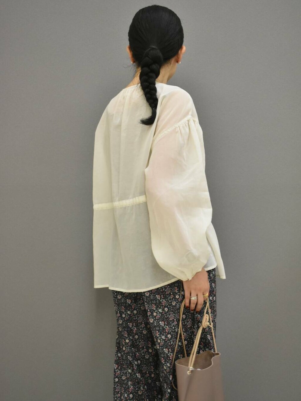 後ろウエスト部分は紐でギャザーを寄せることができるので様々なボトムスで合わせて頂けます。
