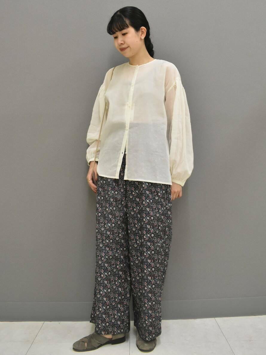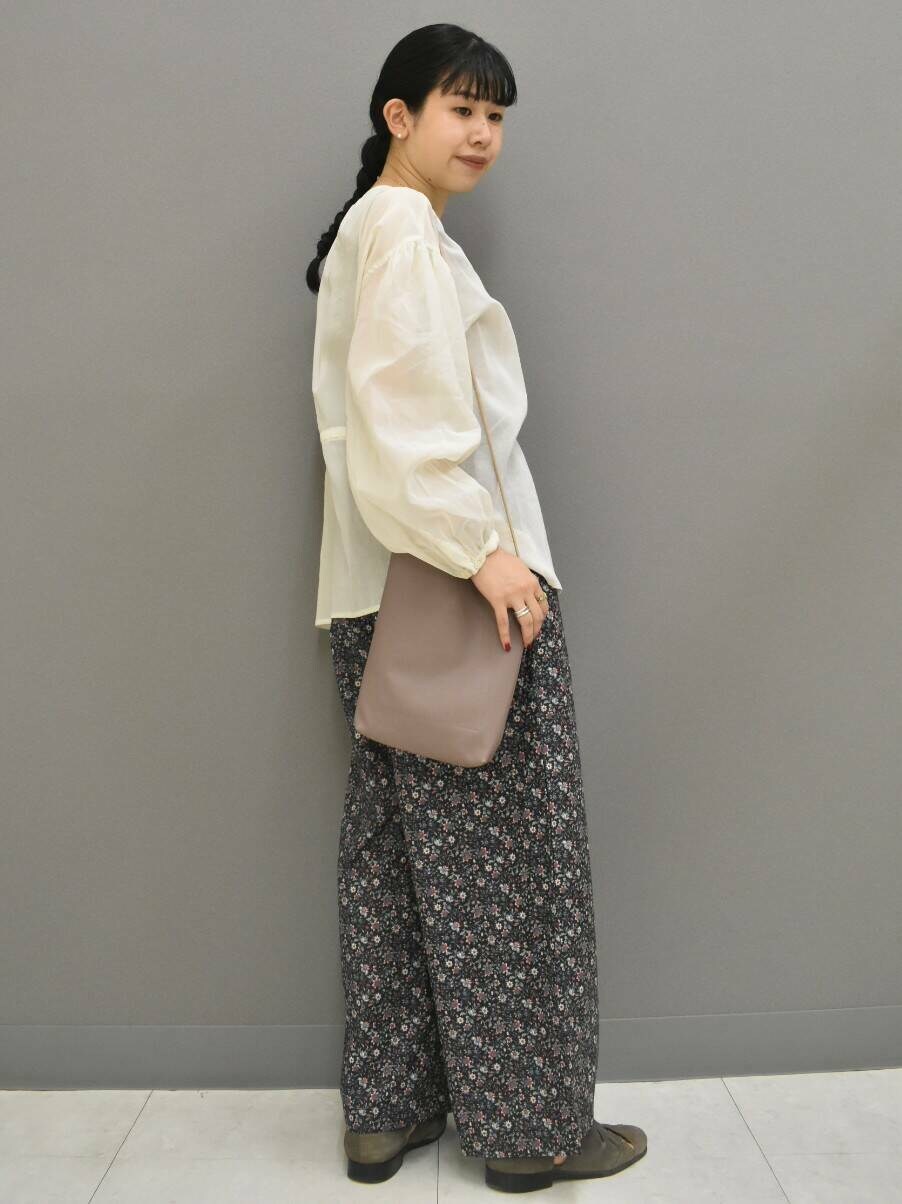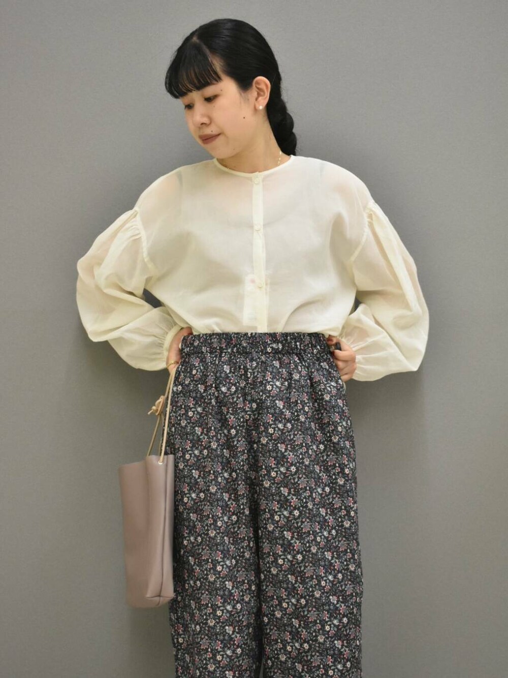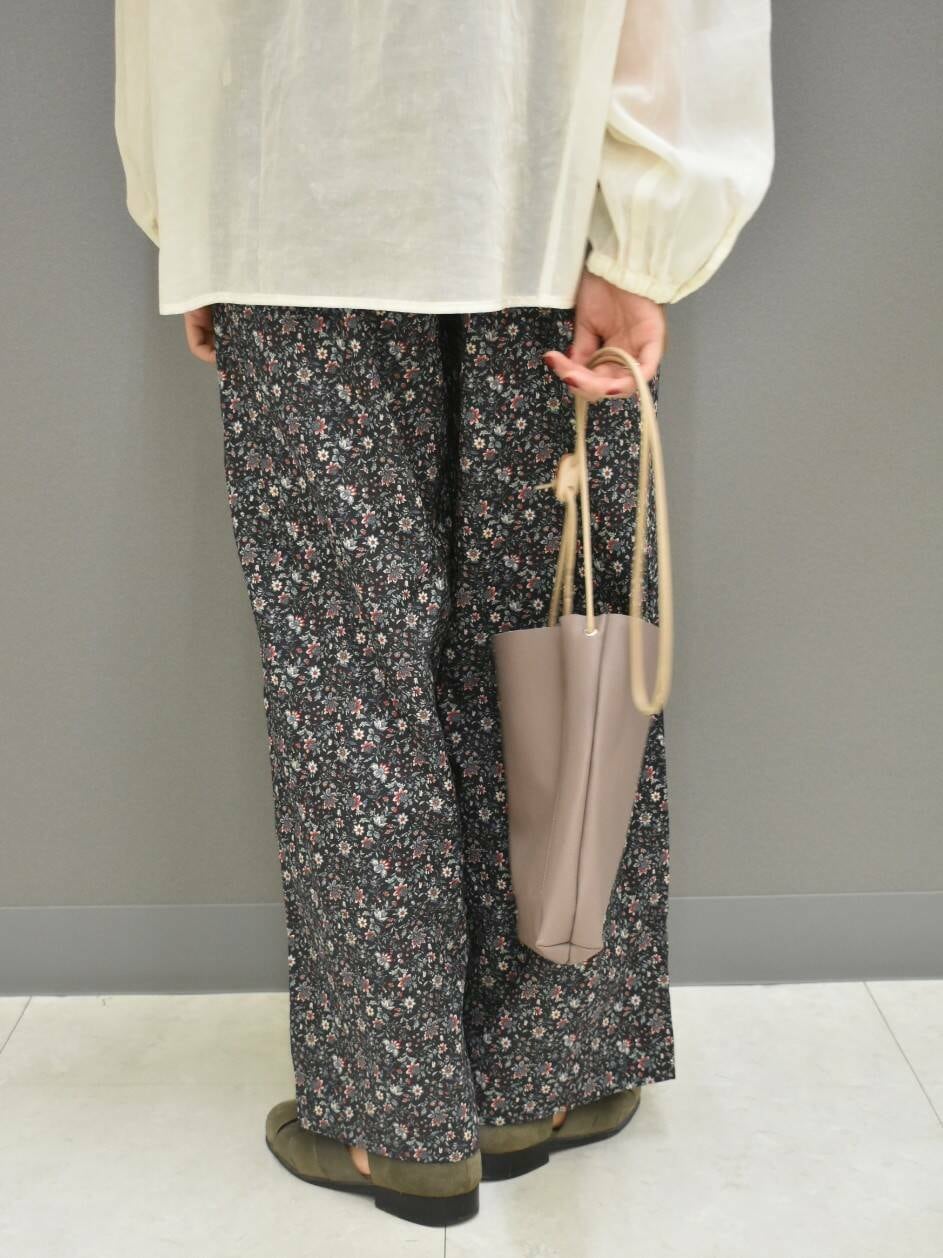 後ろウエスト部分は紐でギャザーを寄せることができるので様々なボトムスで合わせて頂けます。