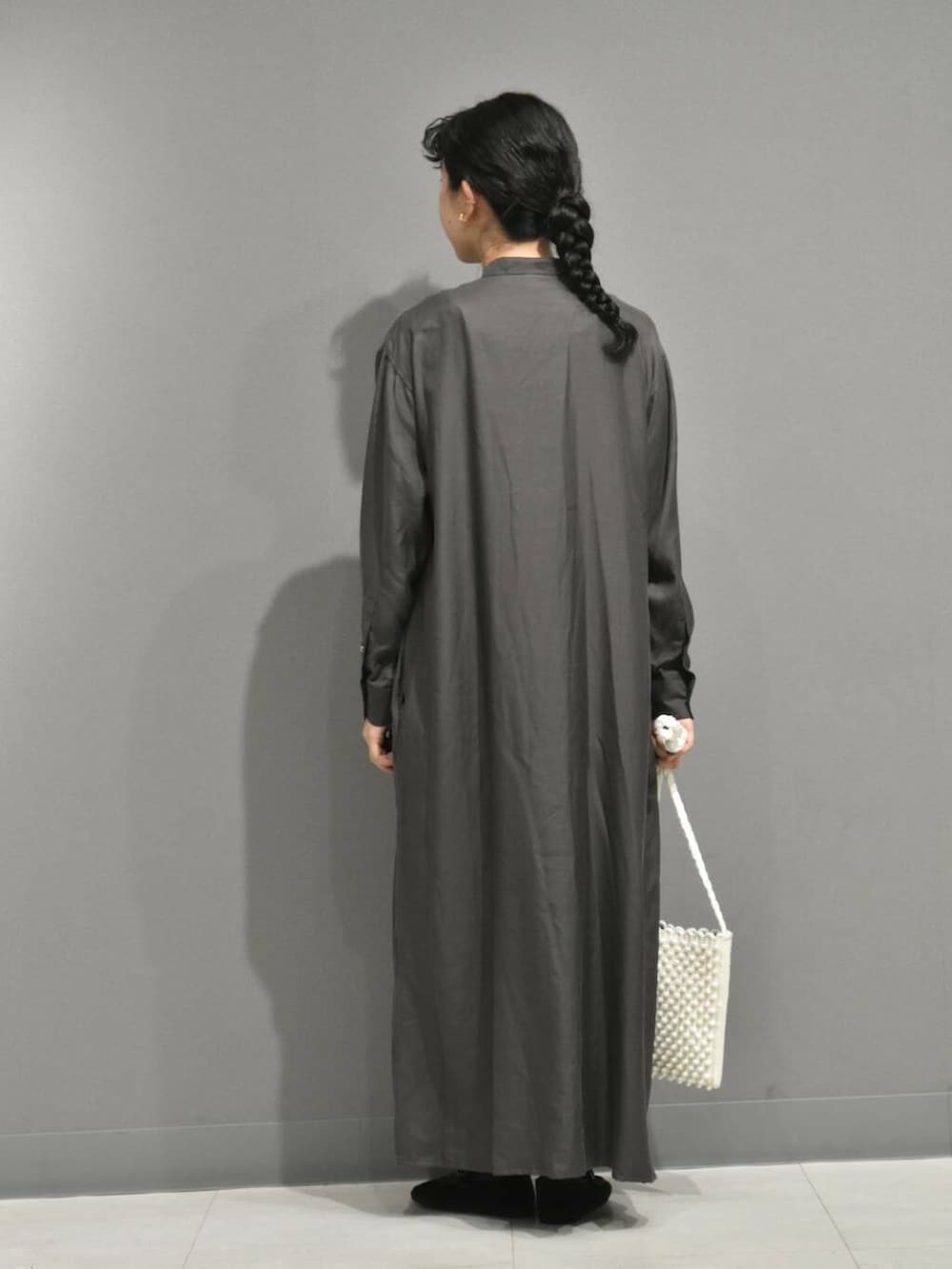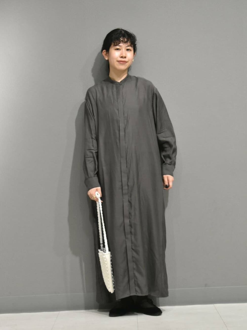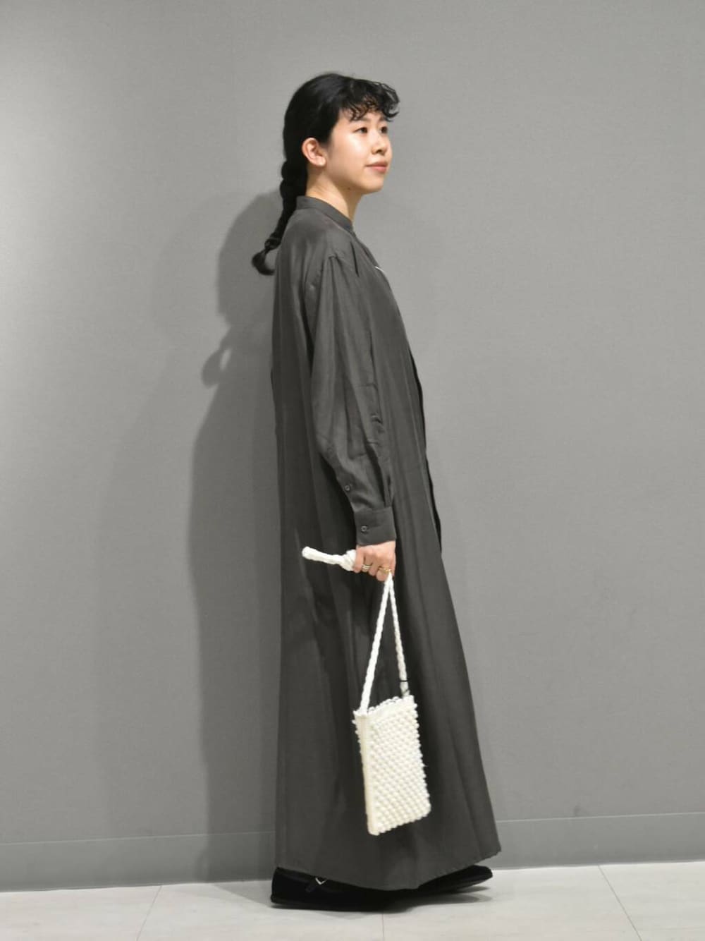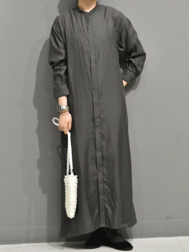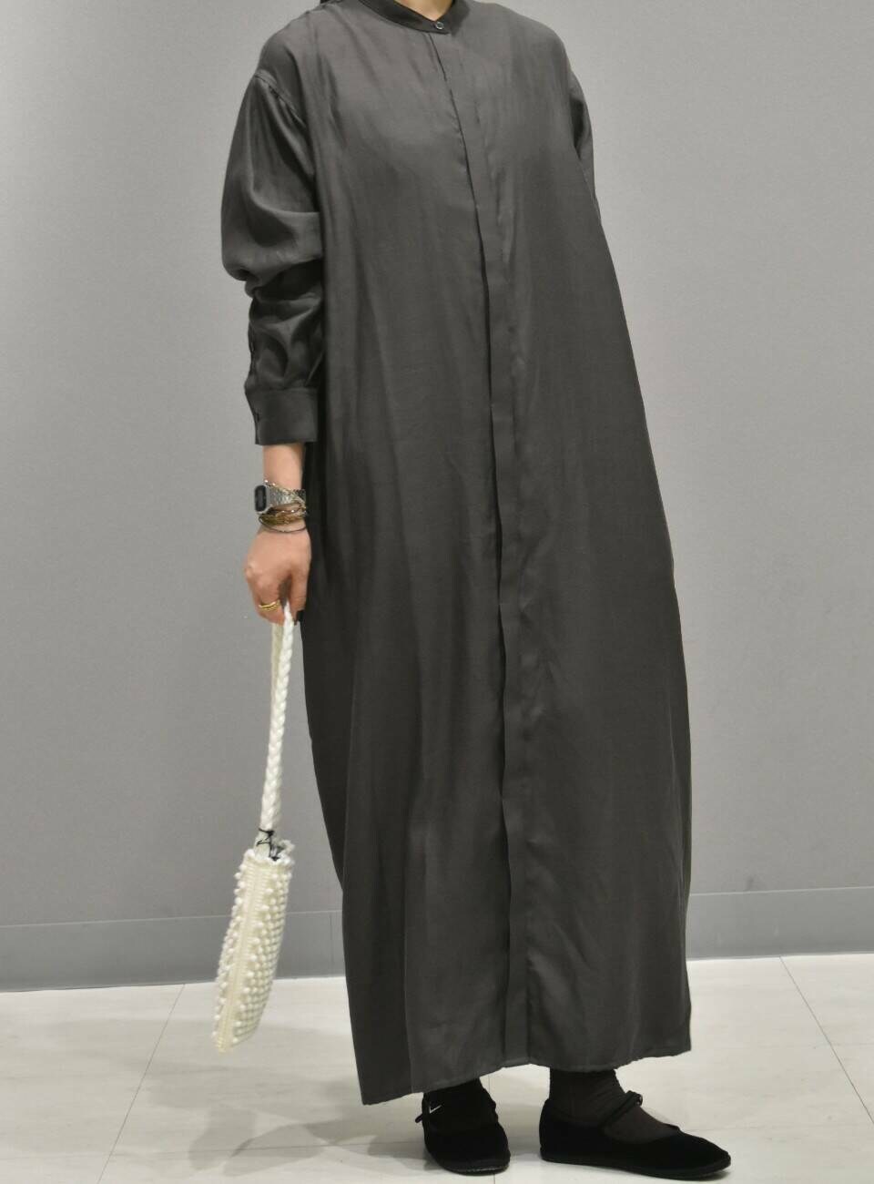 光沢のあるキュプラ混素材のシャツワンピースは上品な印象で垢抜けた印象に。