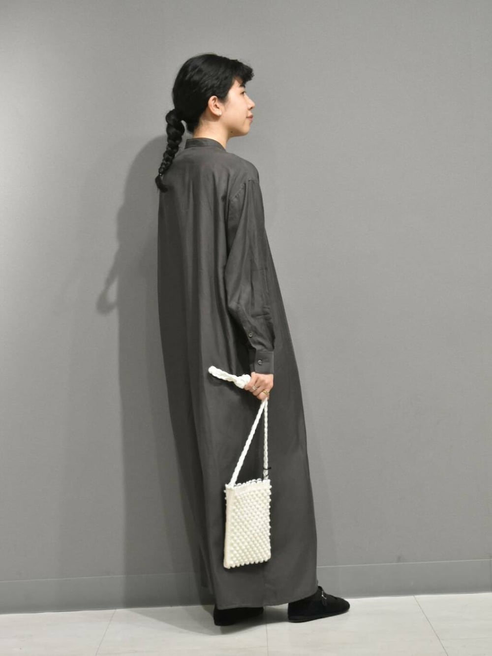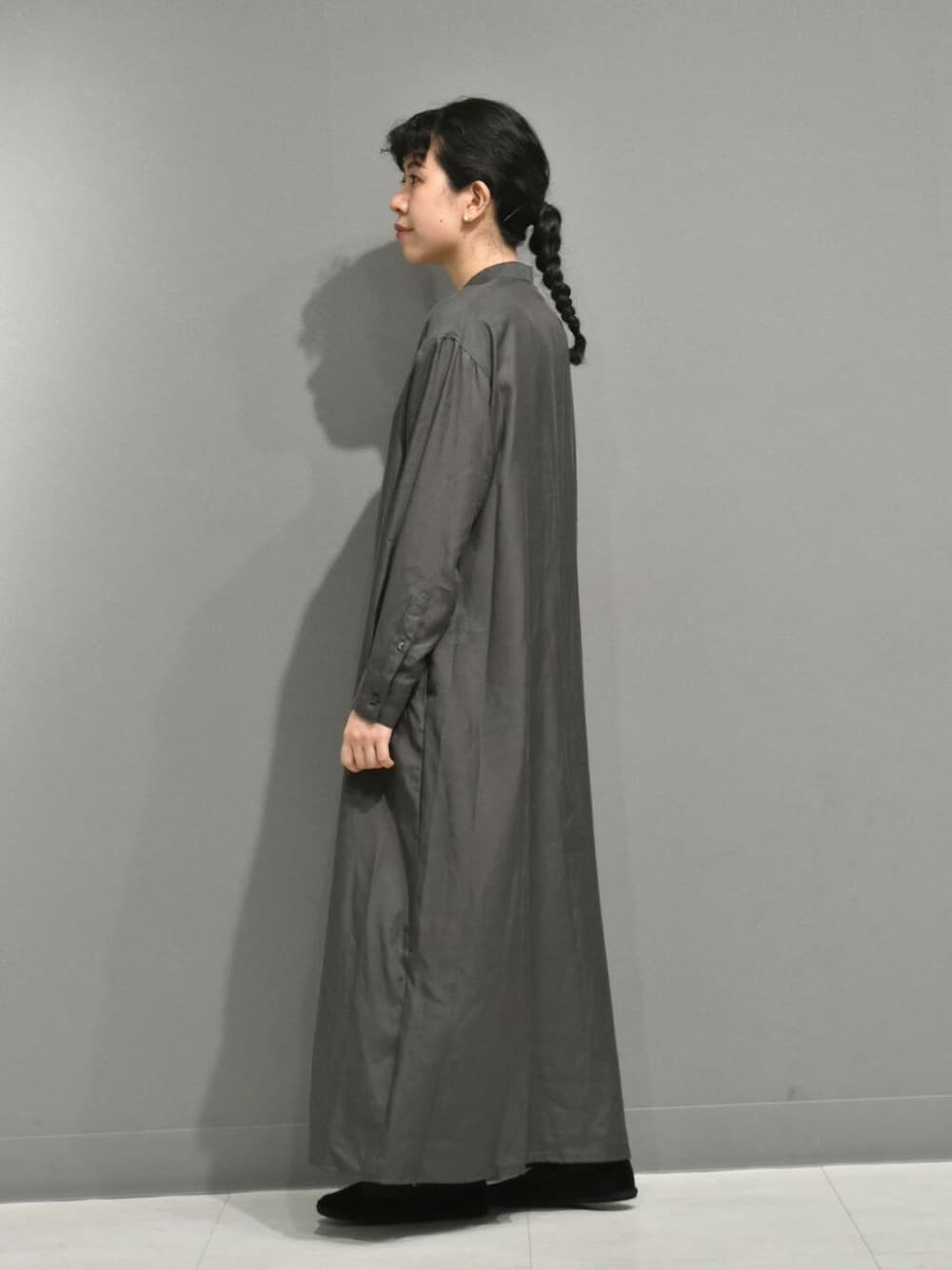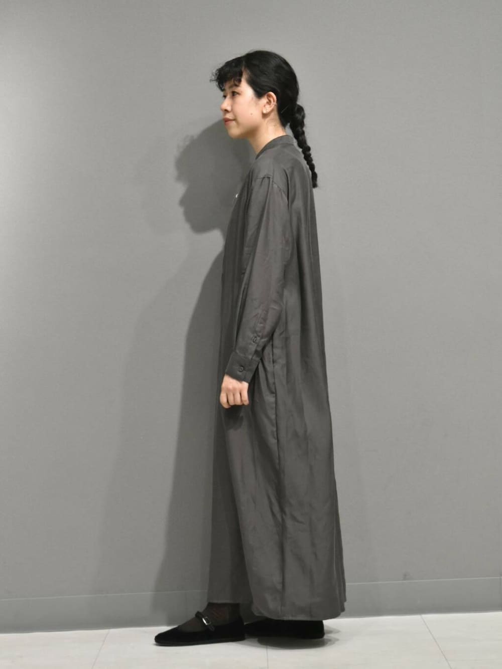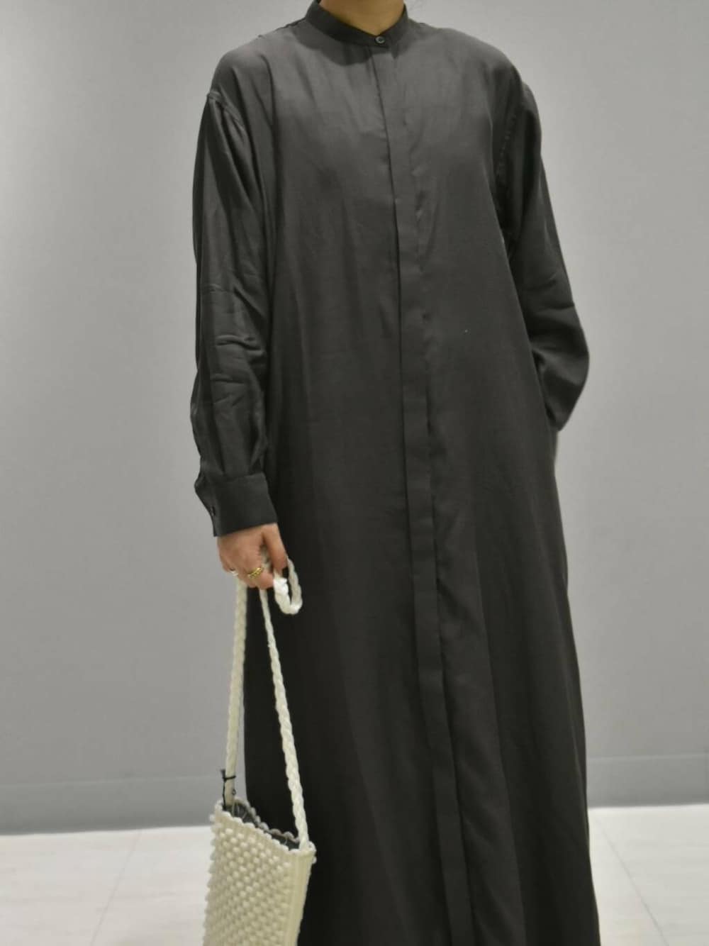 光沢のあるキュプラ混素材のシャツワンピースは上品な印象で垢抜けた印象に。