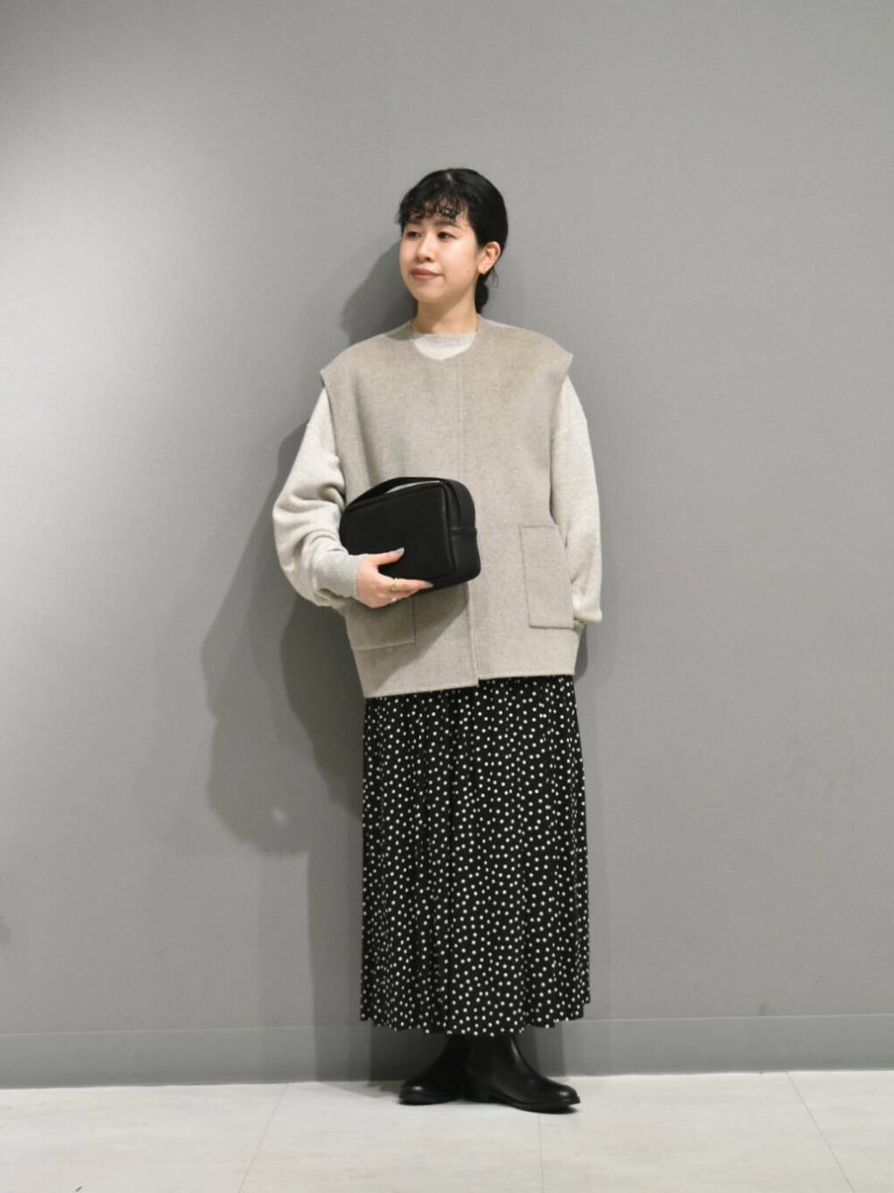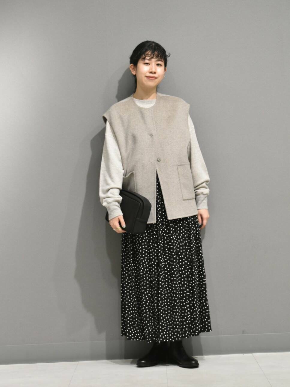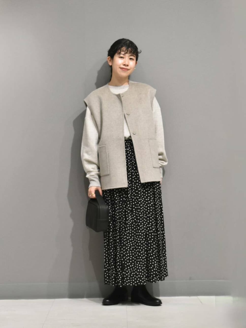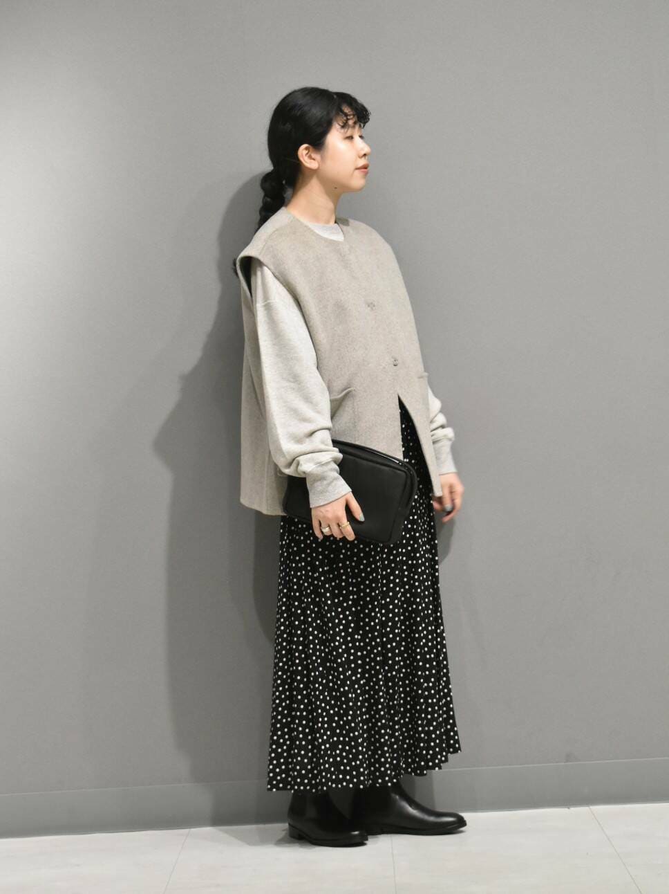 ウール素材のベストはリラックス感がありつつも大人っぽいモードな雰囲気で合わせられます(^^)