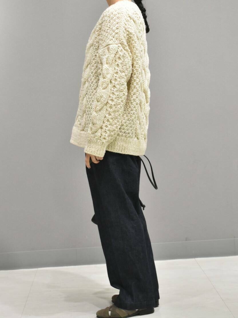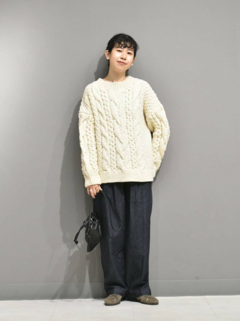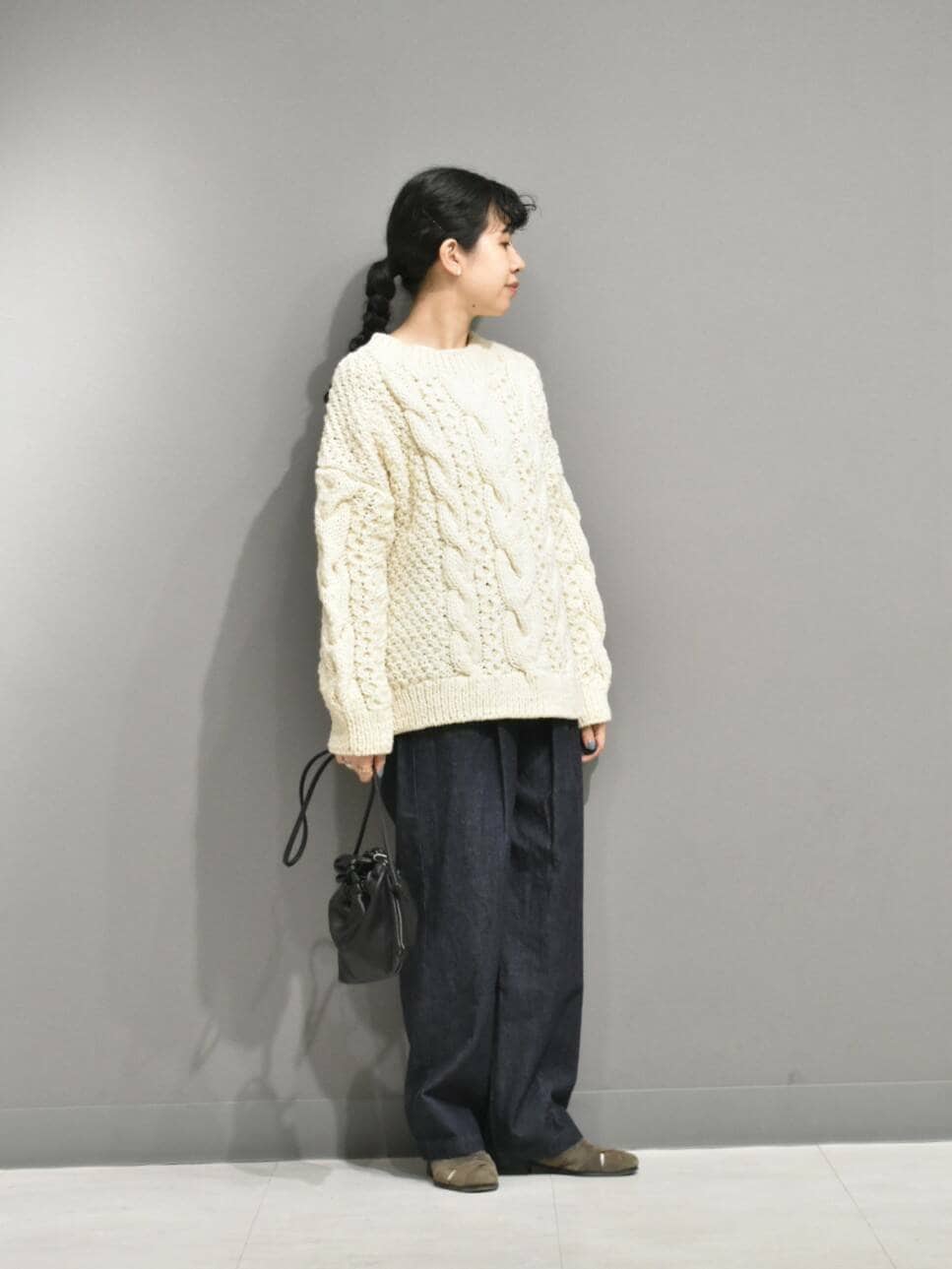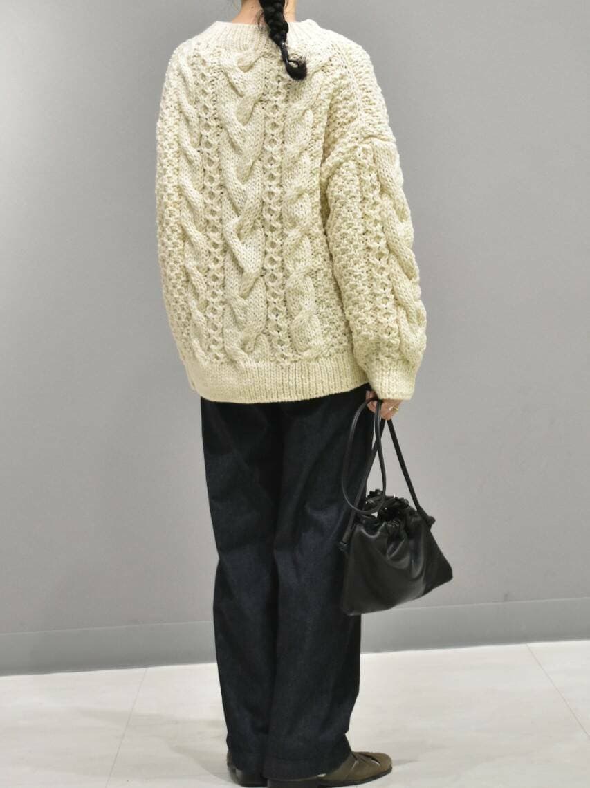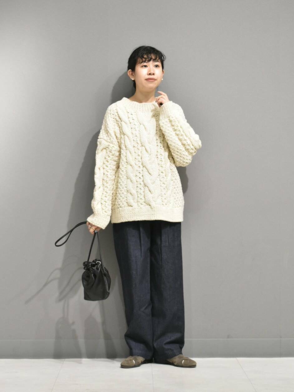 立体感のある手編みのブルーニットは1枚あると秋冬のスタイリングが楽しくなりますね。