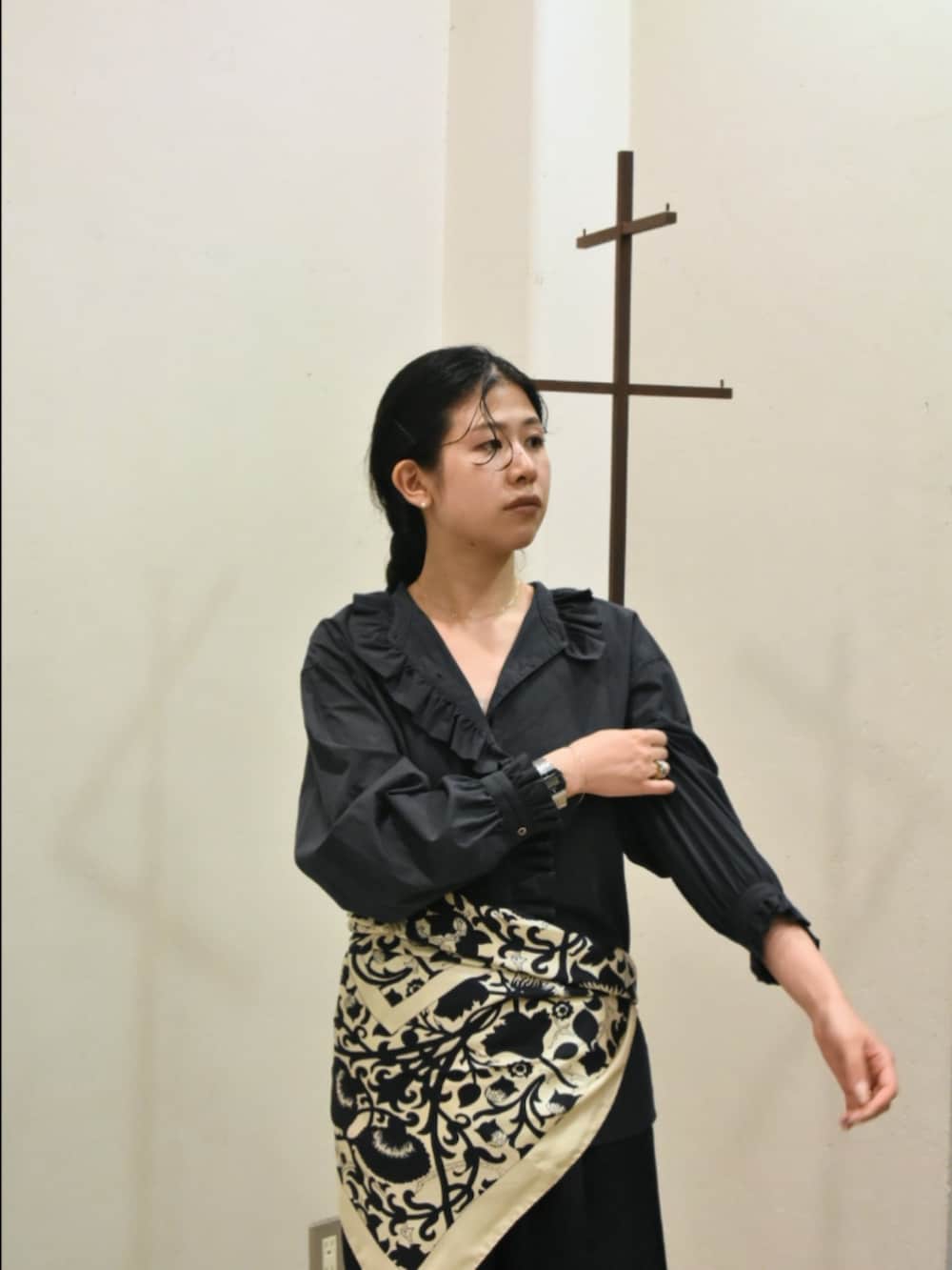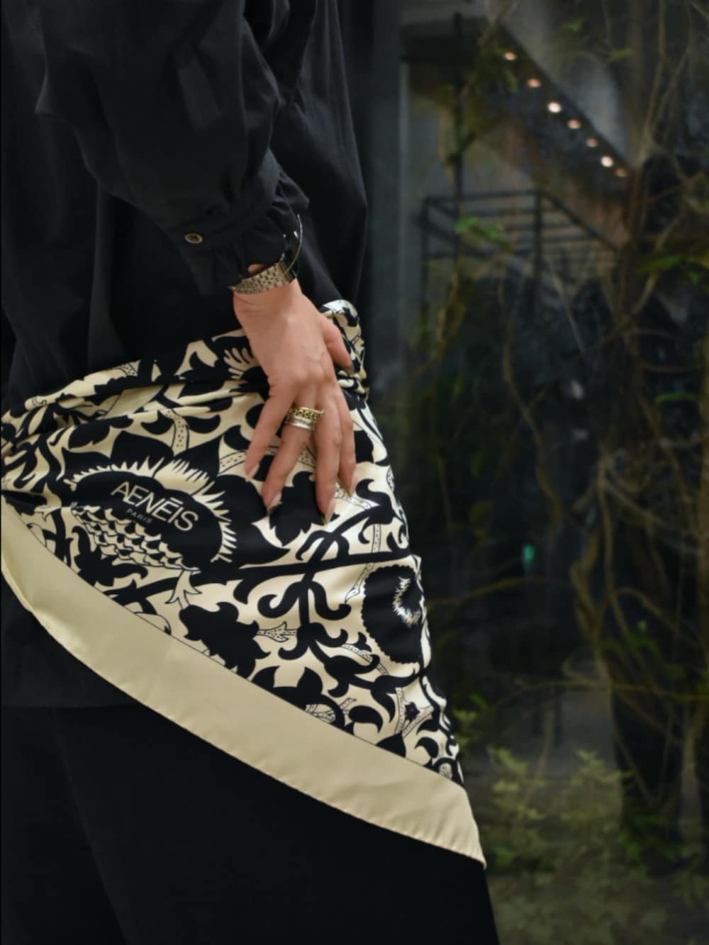 エネスの大判スカーフを主役にモノトーンなスタイリングを組んでみました。