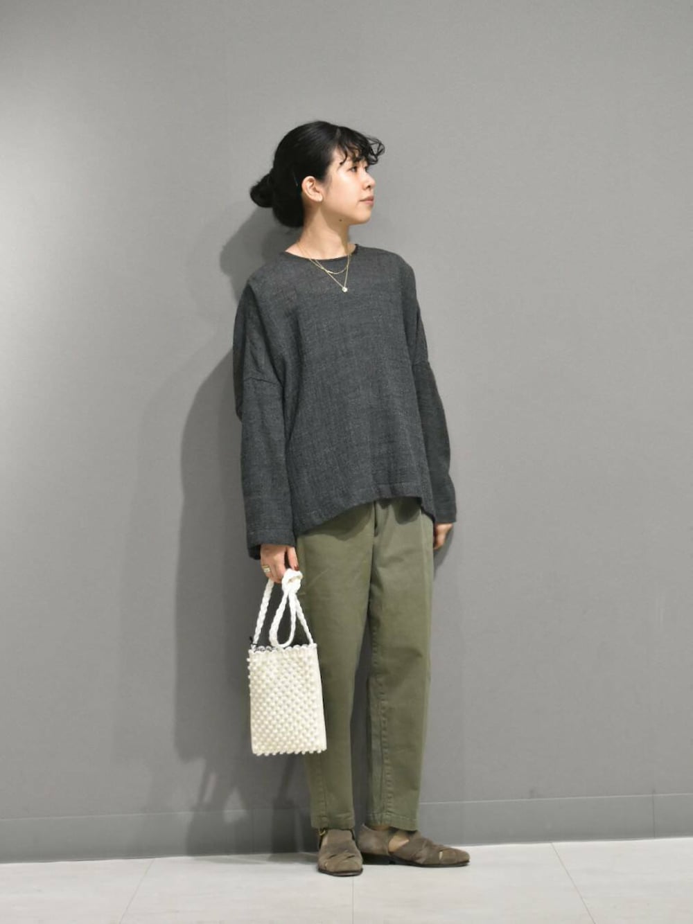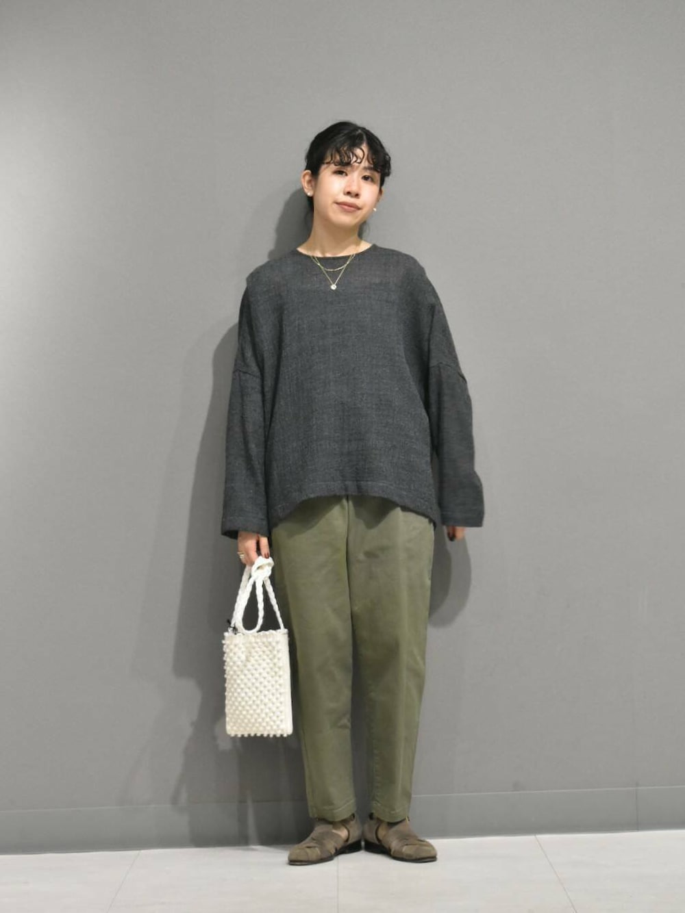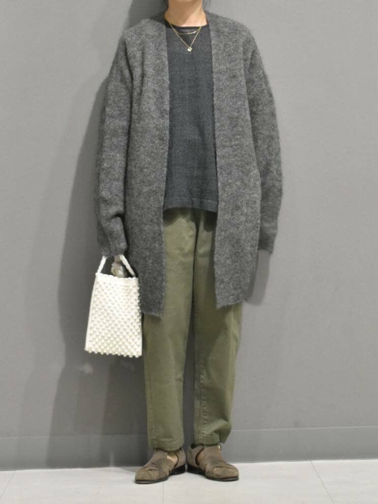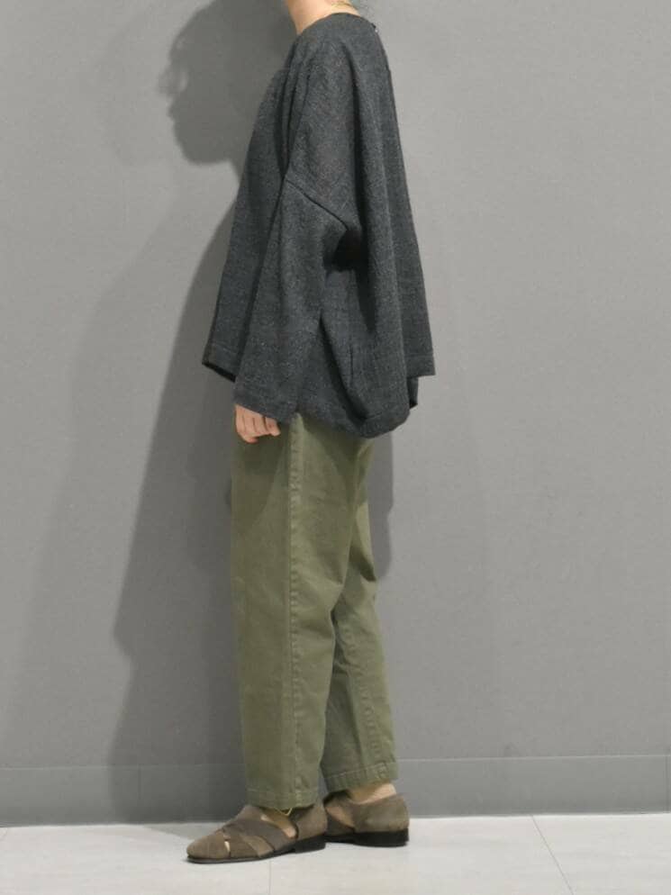 合わせたコットンストレッチイージーパンツはかぐれで定番のアイテムで、履き心地がとても良くてスタイリングに万能なパンツです。