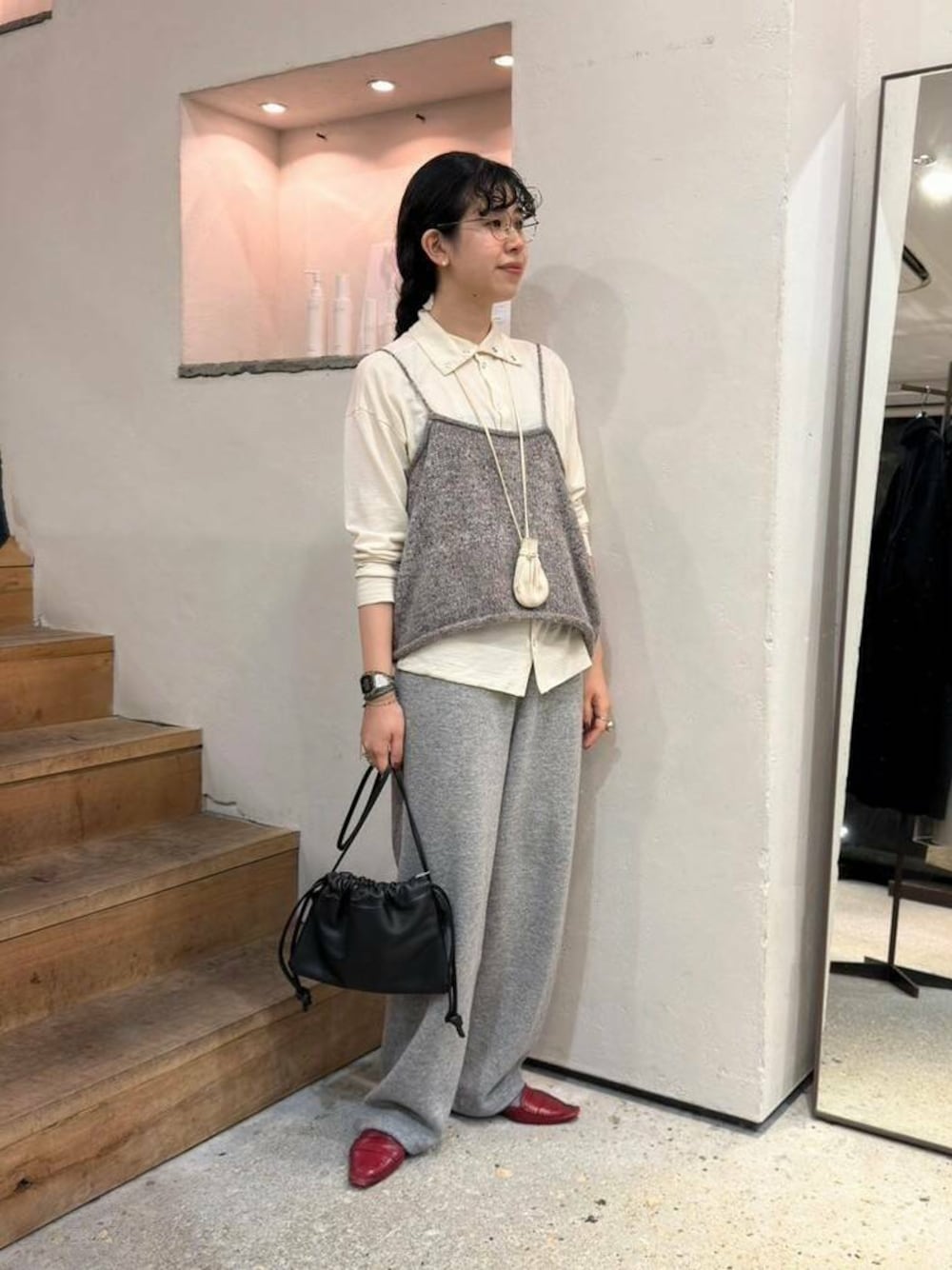 赤のシューズをワンポイント足して、グレーのニュアンスコーディネートをモードに纏めました。