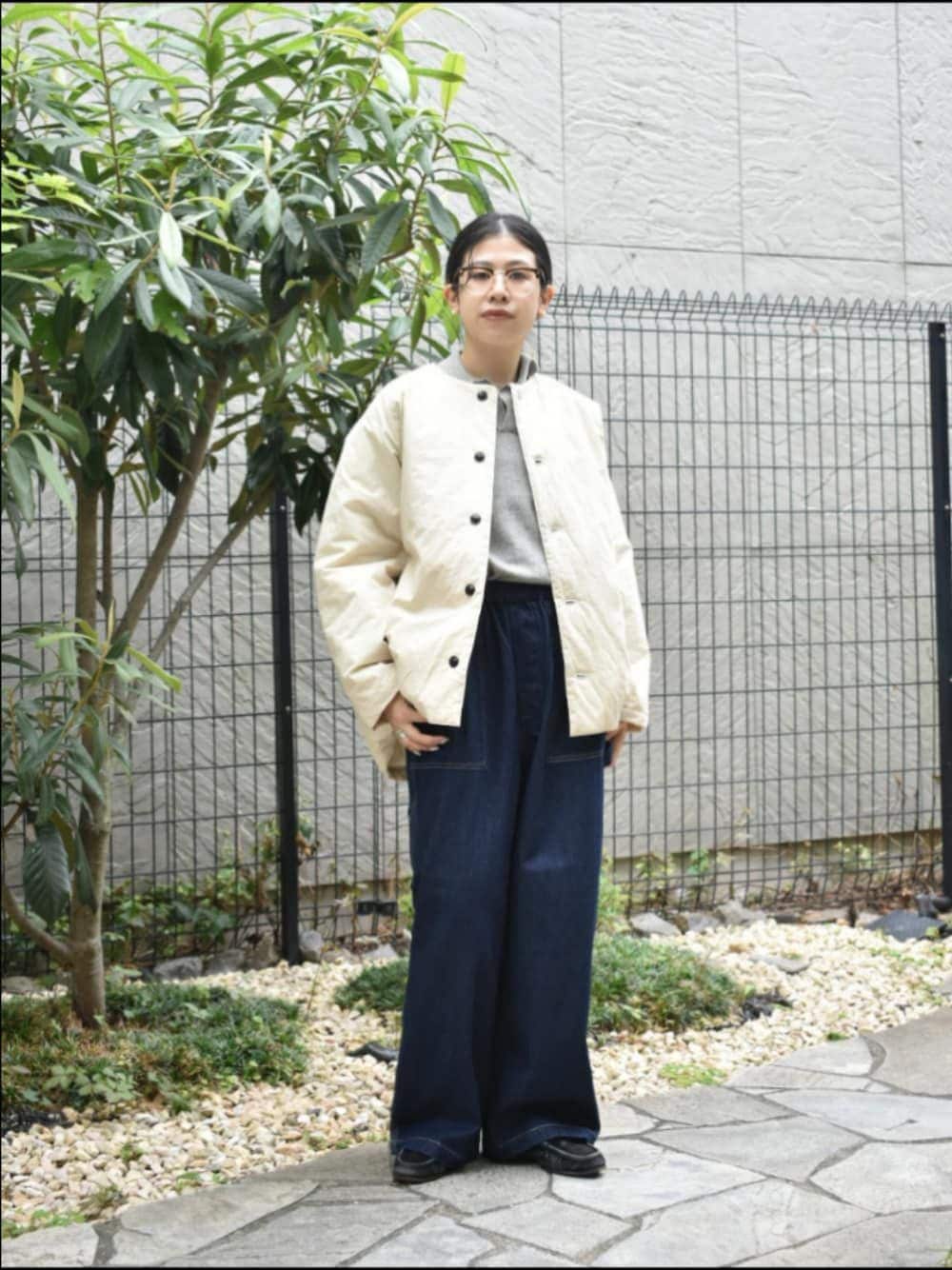 遠州染めの表地で、綿の表面感が素敵なアイテム。着丈を長めでゆるっと合わせたかったので、今回はサイズ2を合わせました。見頃のゆとりも変わるので、ボリューム感や普段の重ね着のイメージで選んで頂くのがおすすめです◎