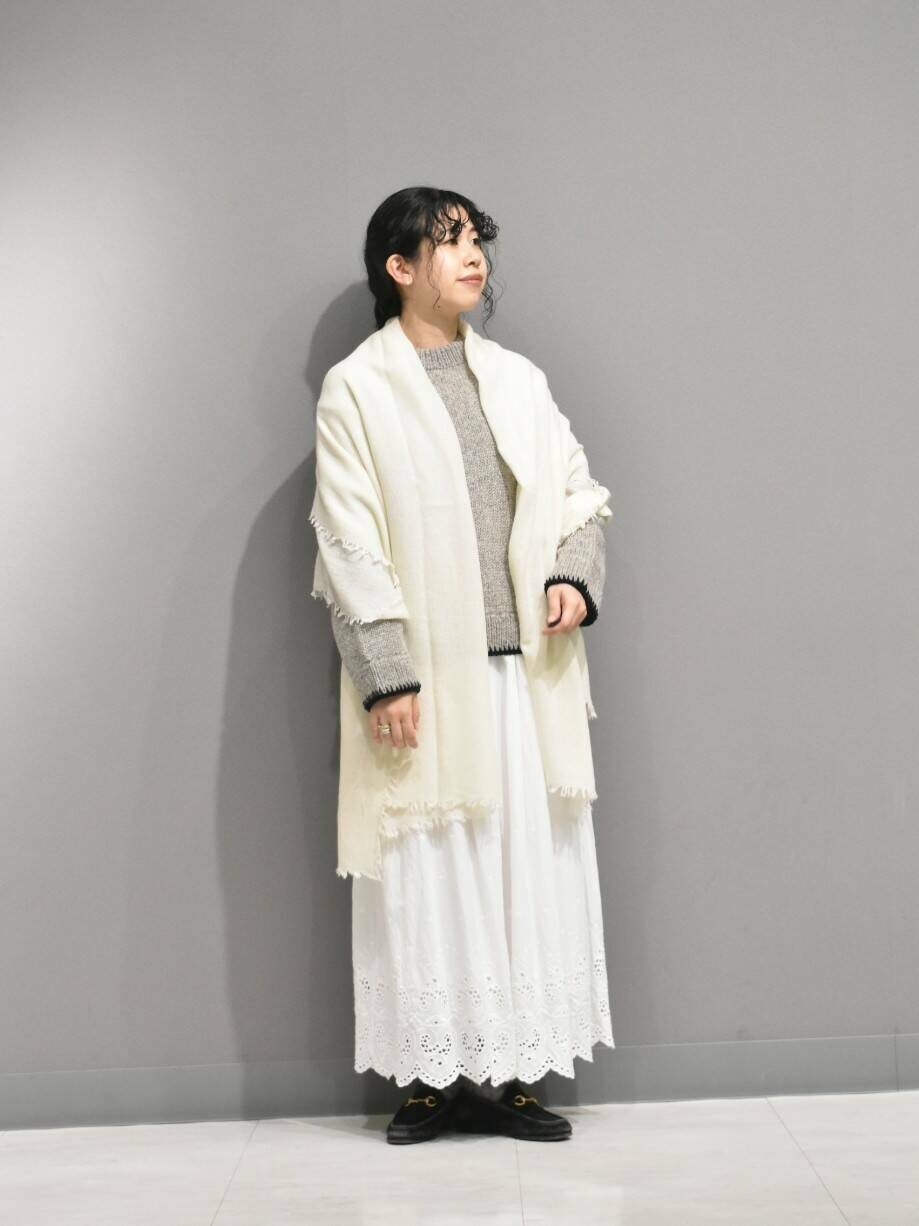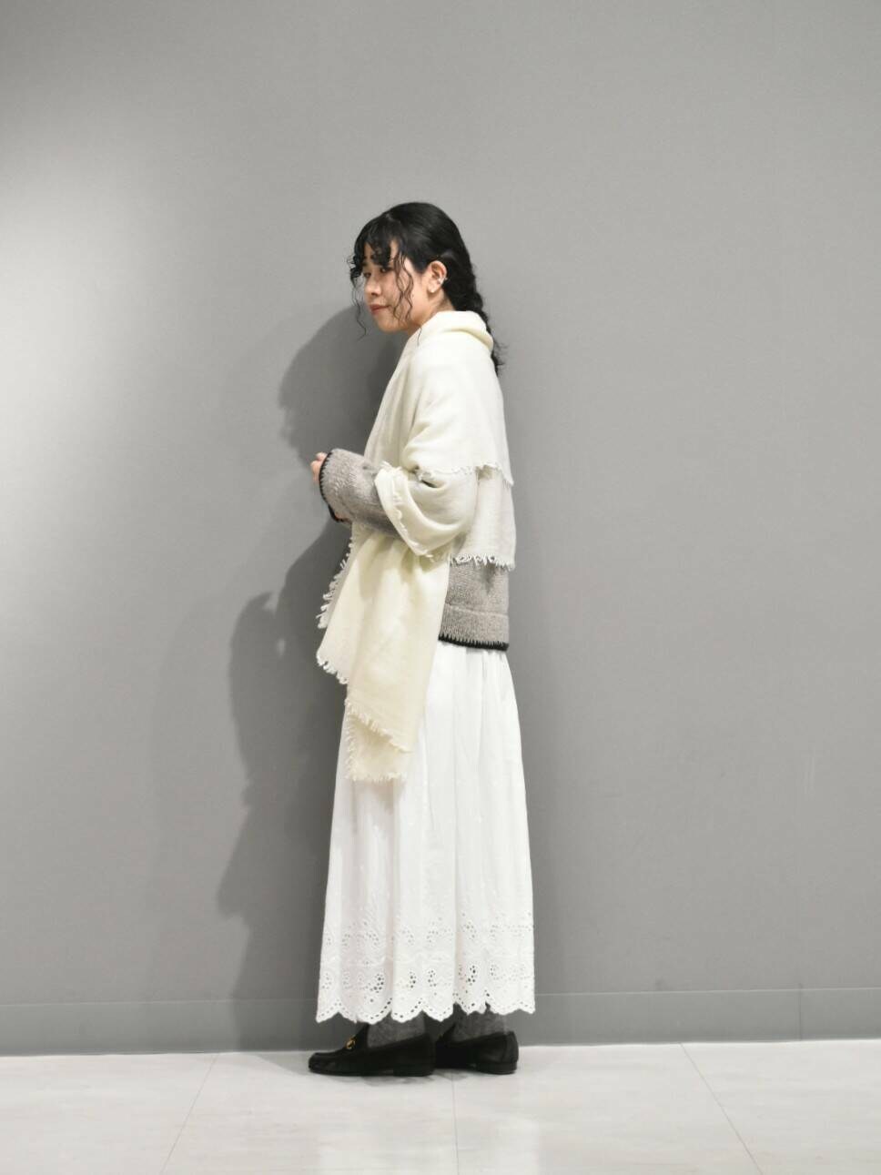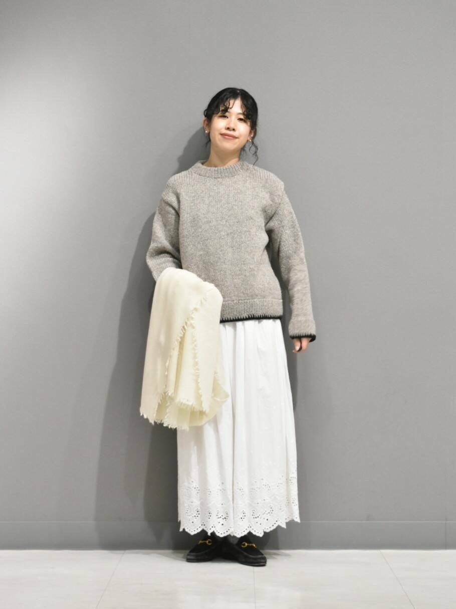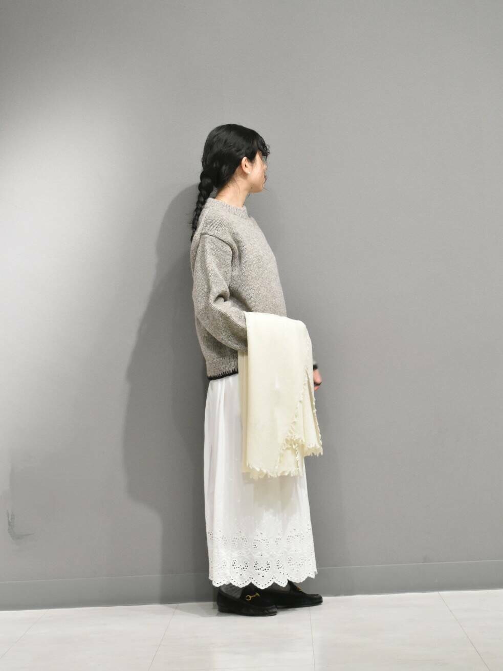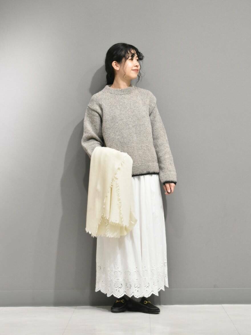 ヘムステッチがアクセントのペルーニットからガーリーなスタイリングを組んでみました。