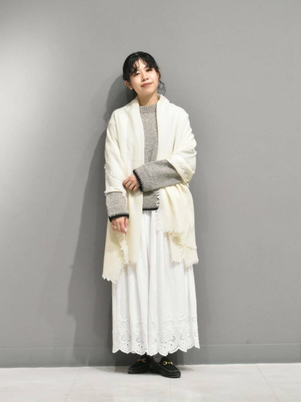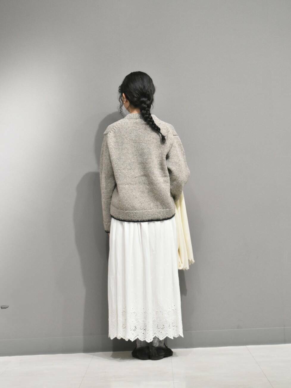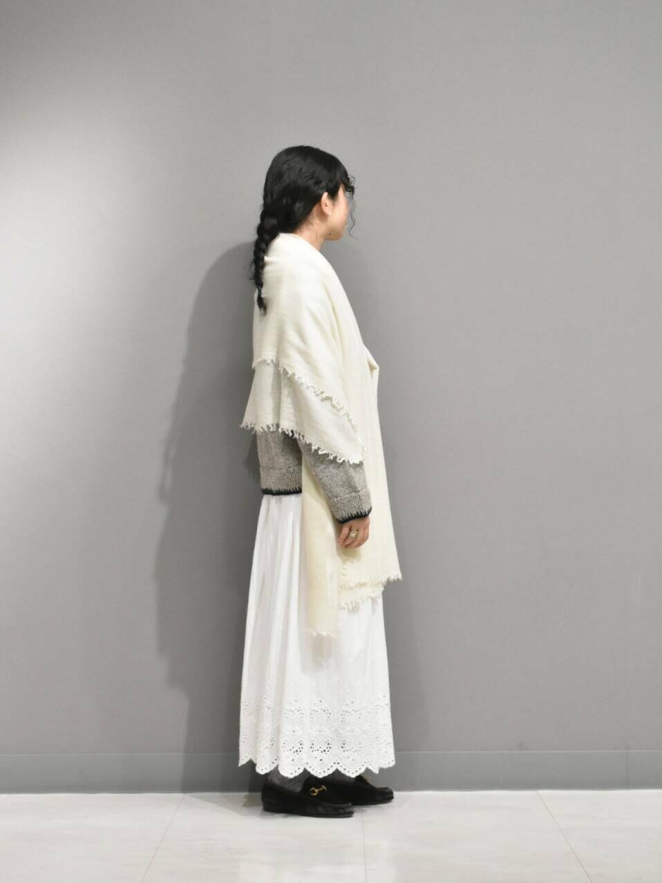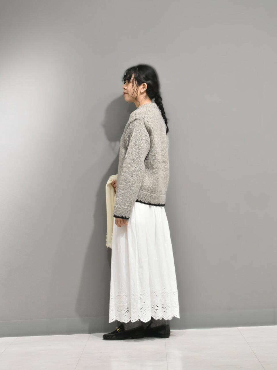 ヘムステッチがアクセントのペルーニットからガーリーなスタイリングを組んでみました。