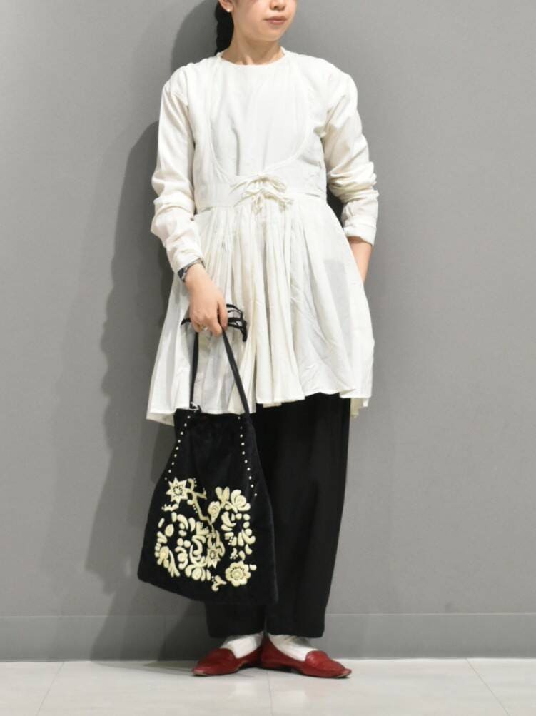 民族衣装から着装を得たデザインですが、胸元の曲線やウエストのギャザーがとても女性らしく華やかな印象です。