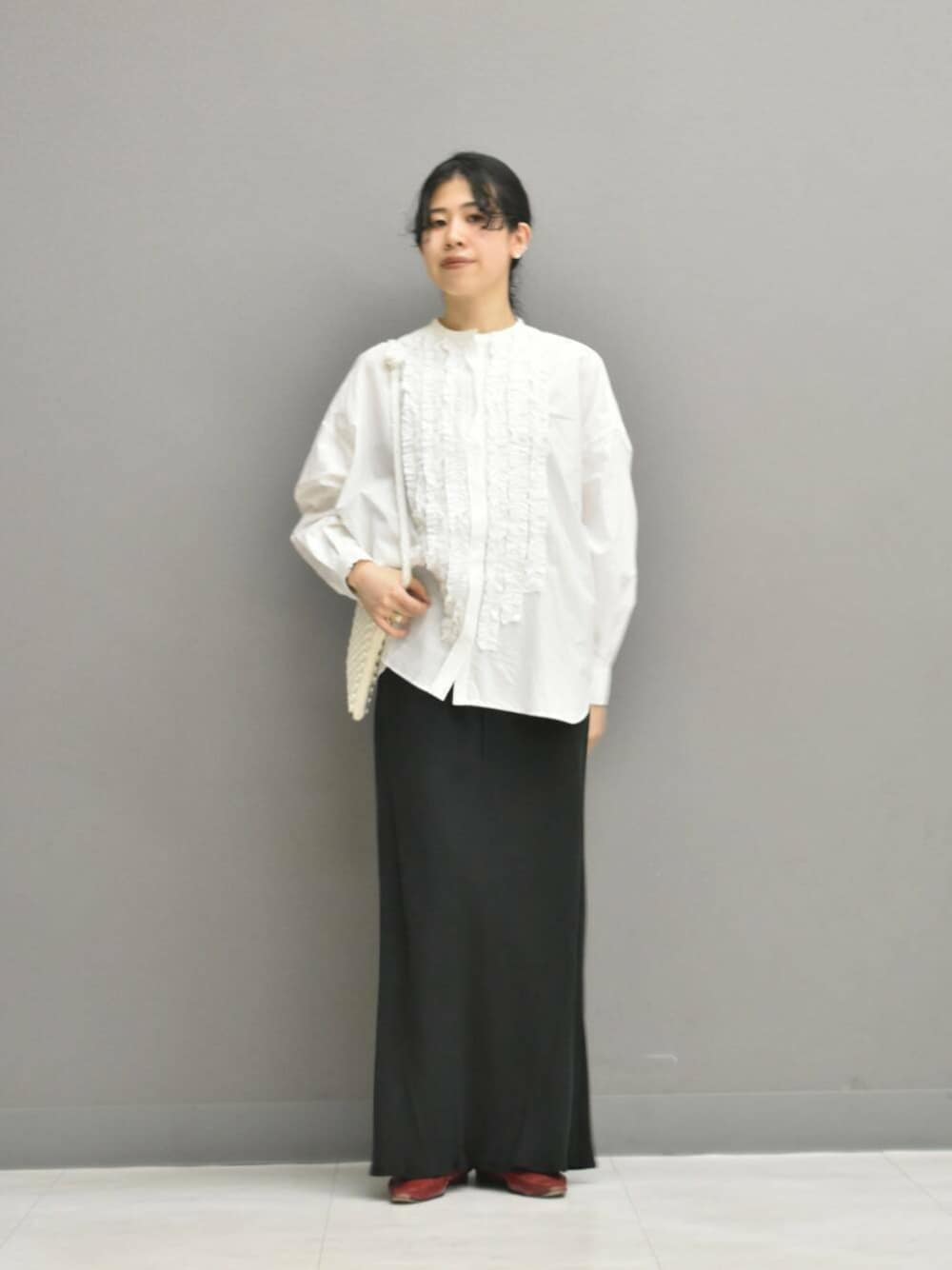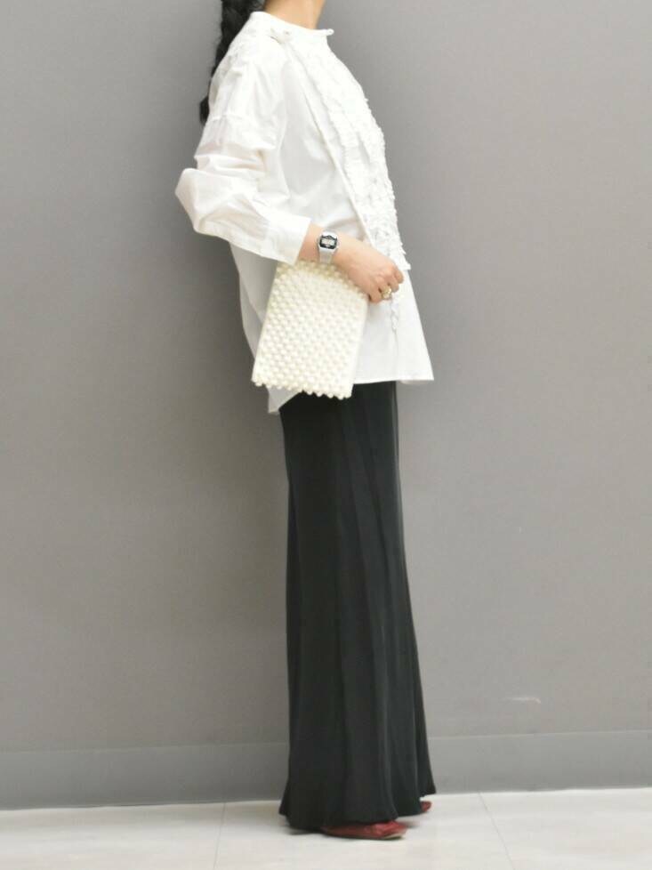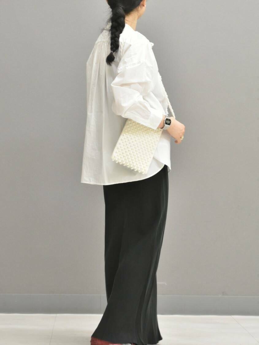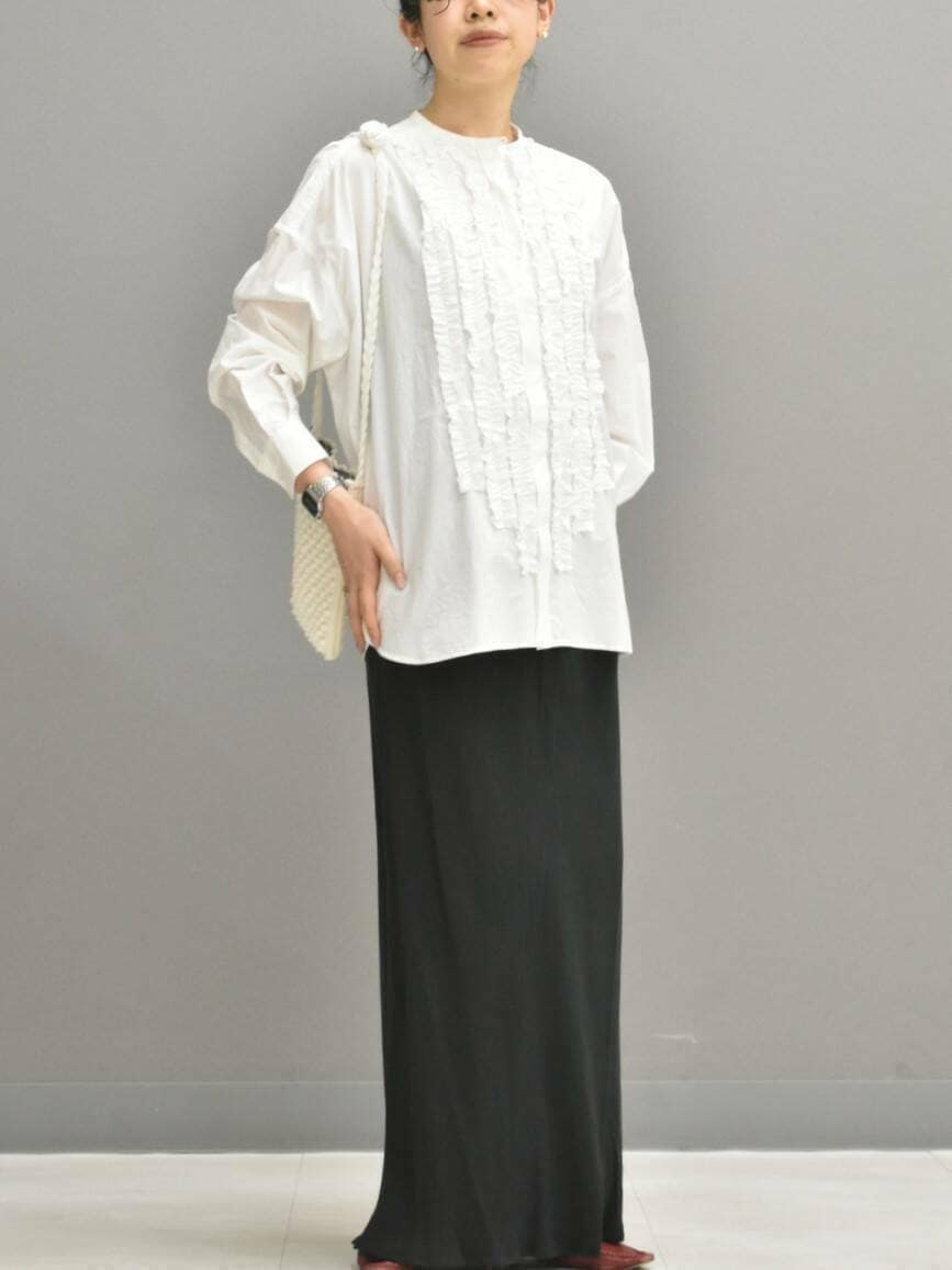シャリ感のある近江晒の綿素材は、フリルを落ち着かせ大人な印象で合わせられます◎