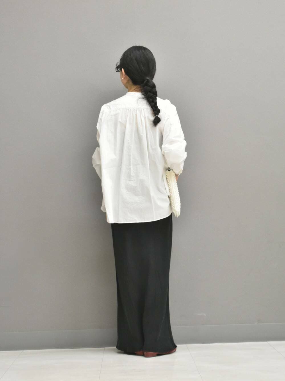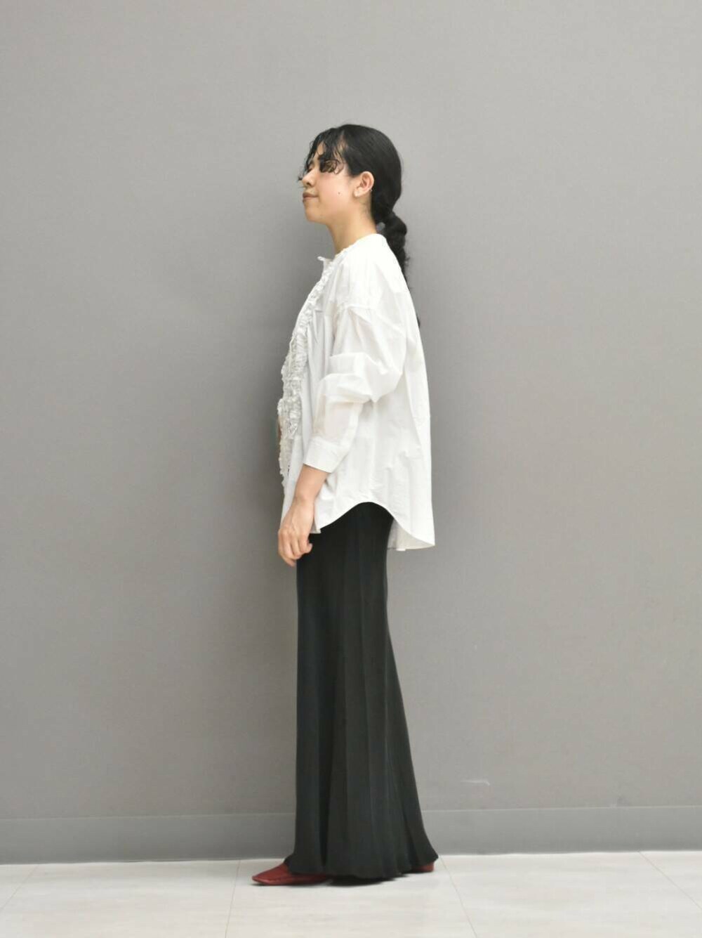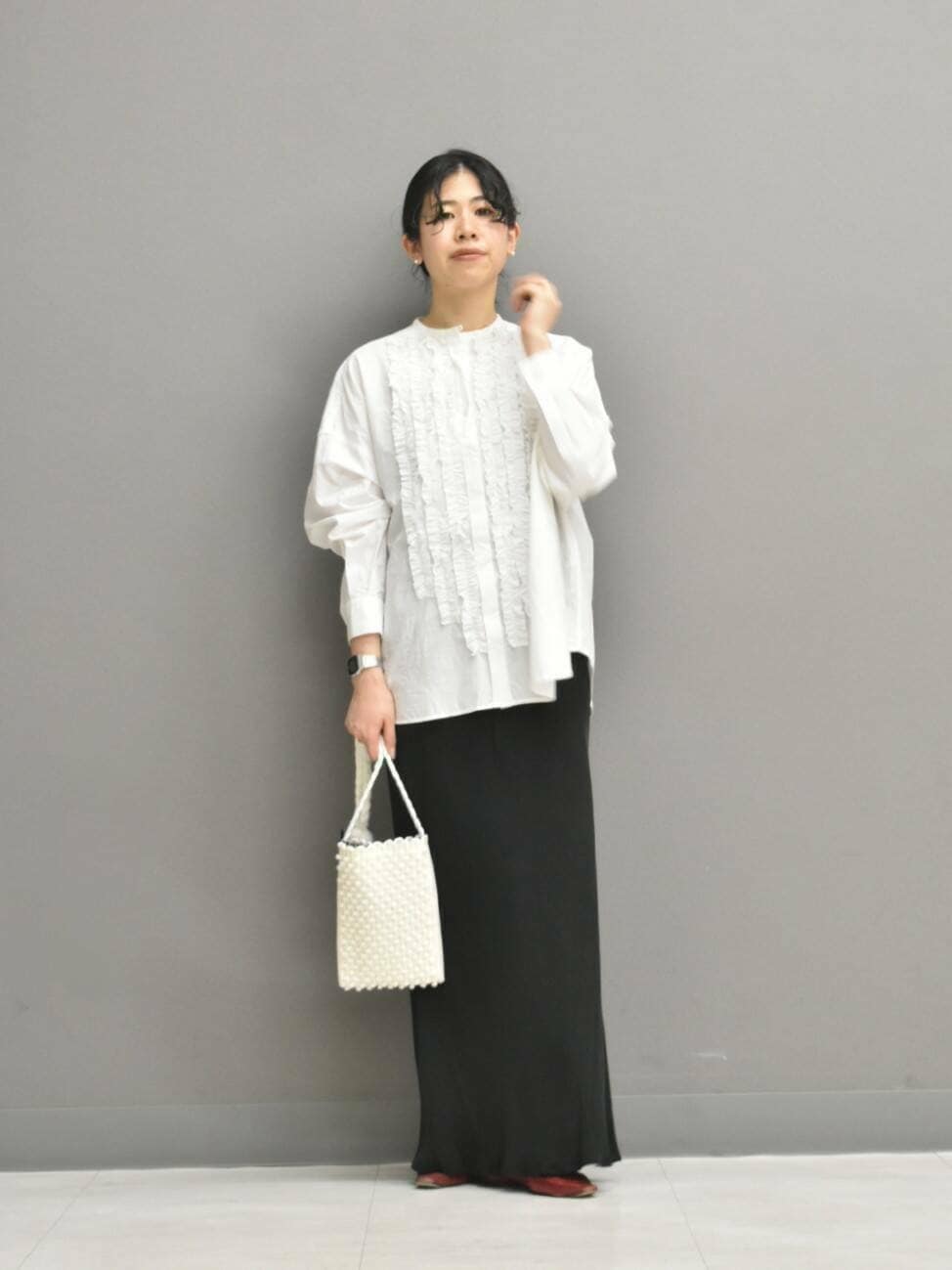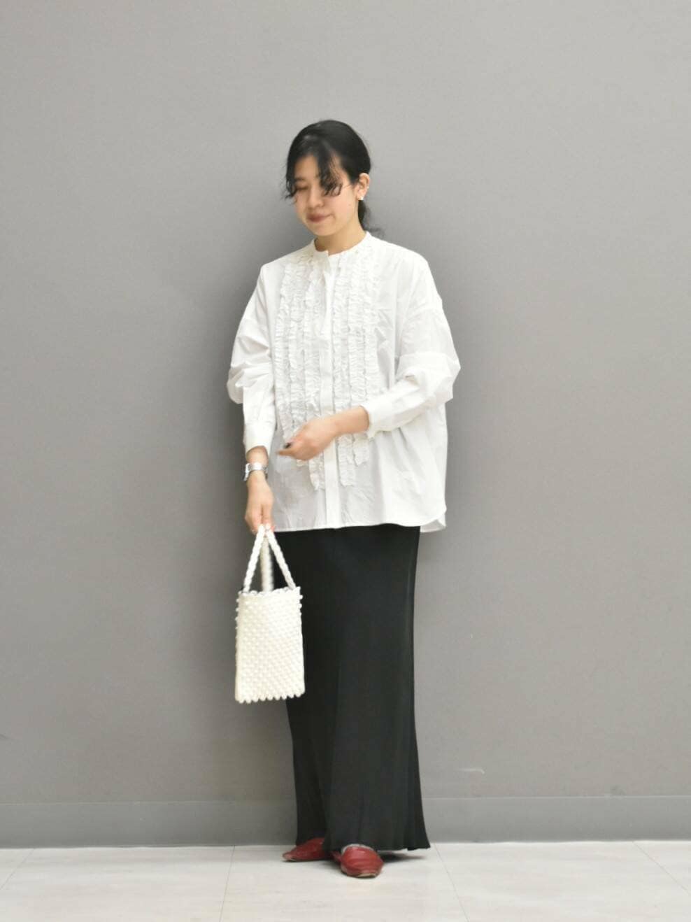 シャリ感のある近江晒の綿素材は、フリルを落ち着かせ大人な印象で合わせられます◎